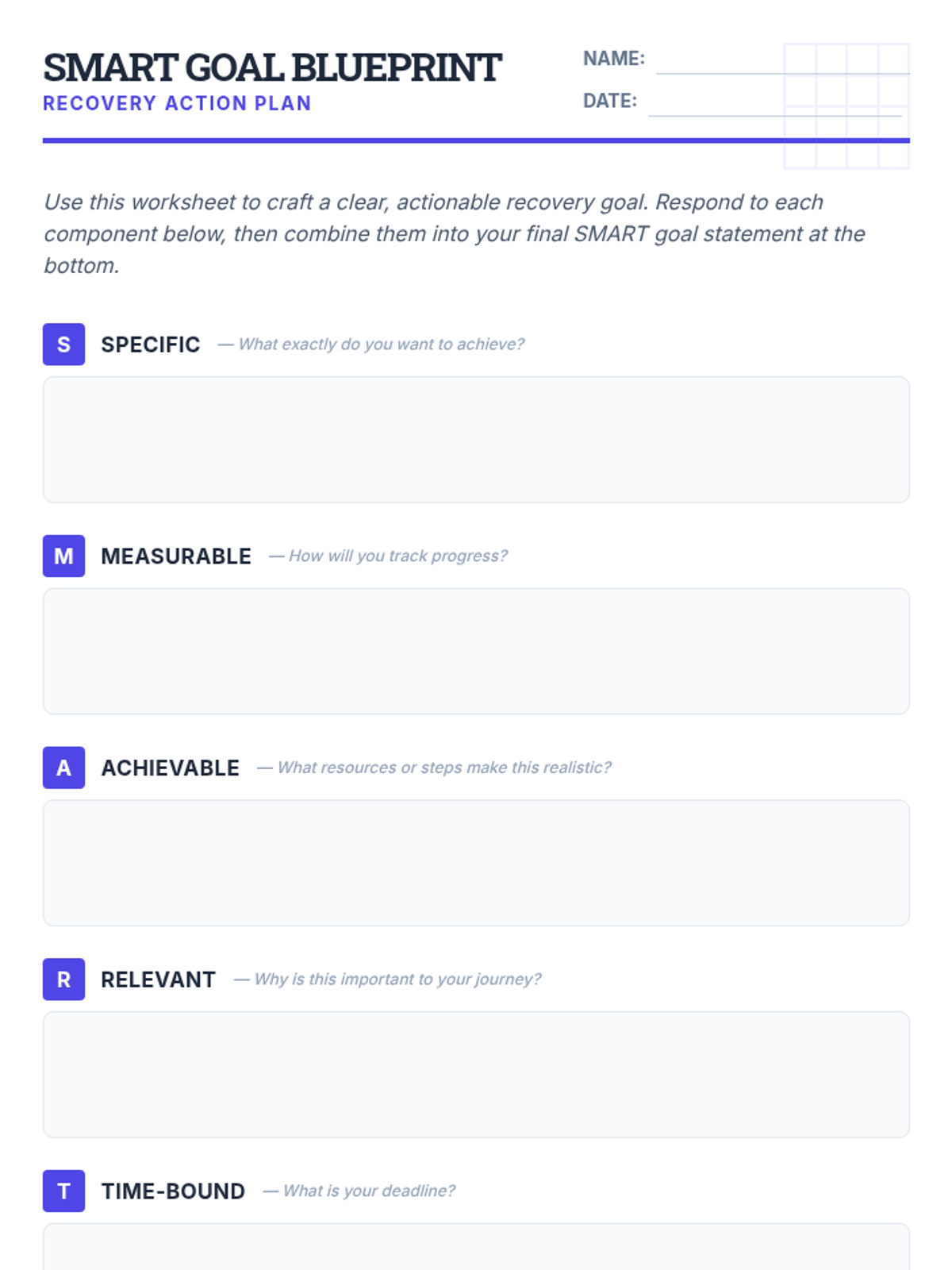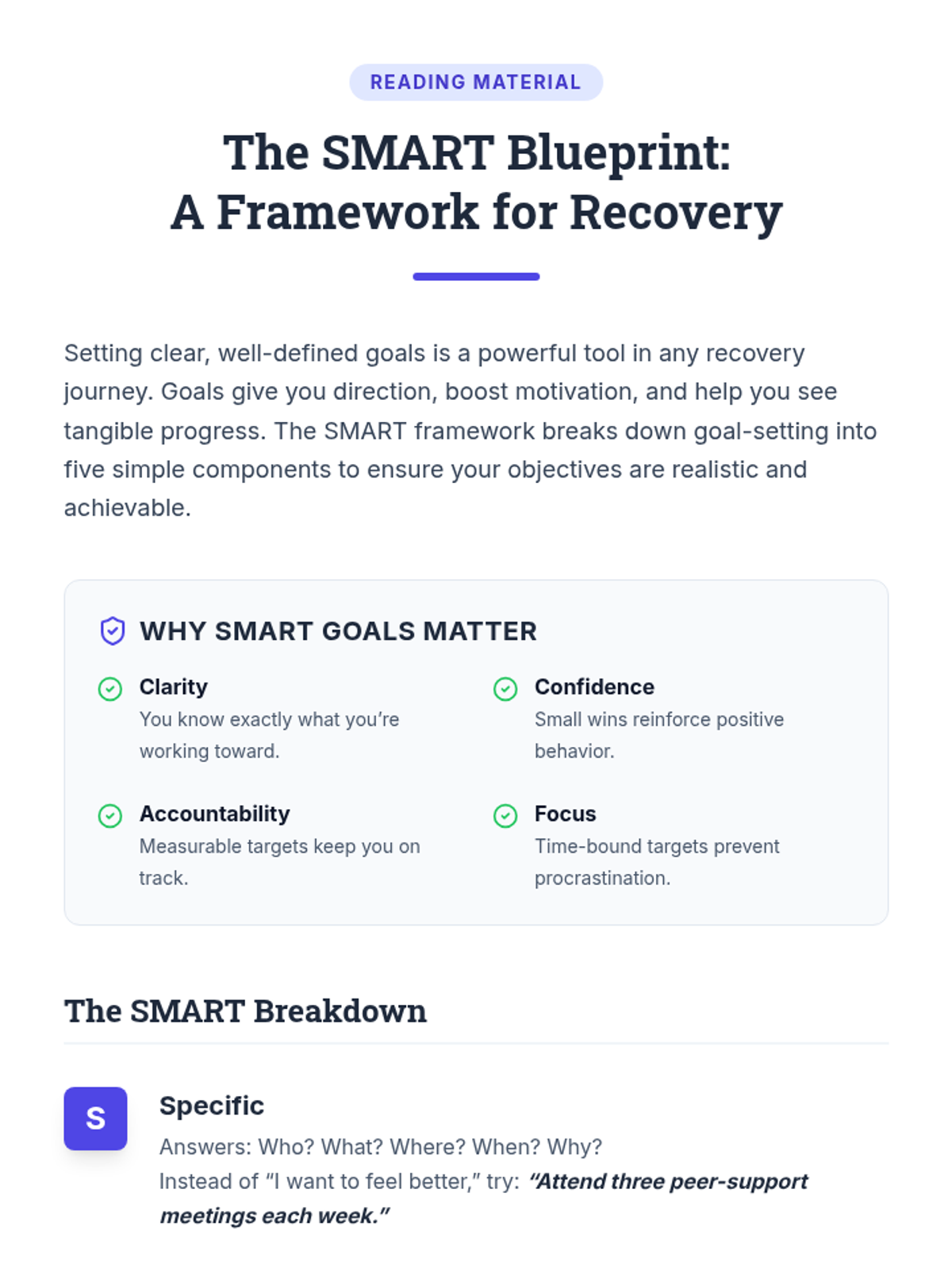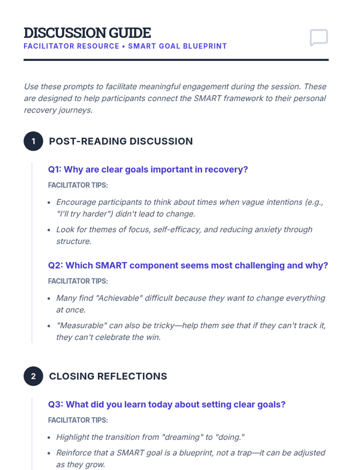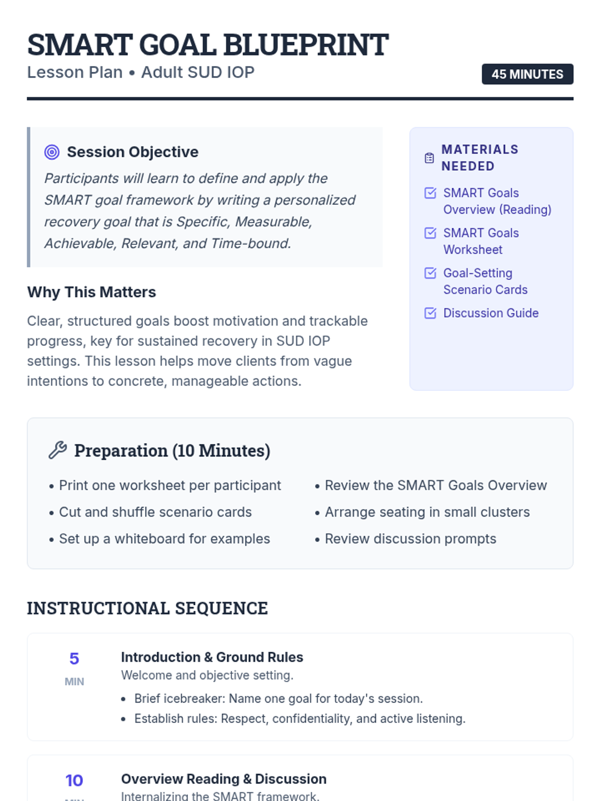 A 45-minute session for adult SUD IOP participants to master the SMART goal framework, helping them build structured, achievable recovery objectives.
