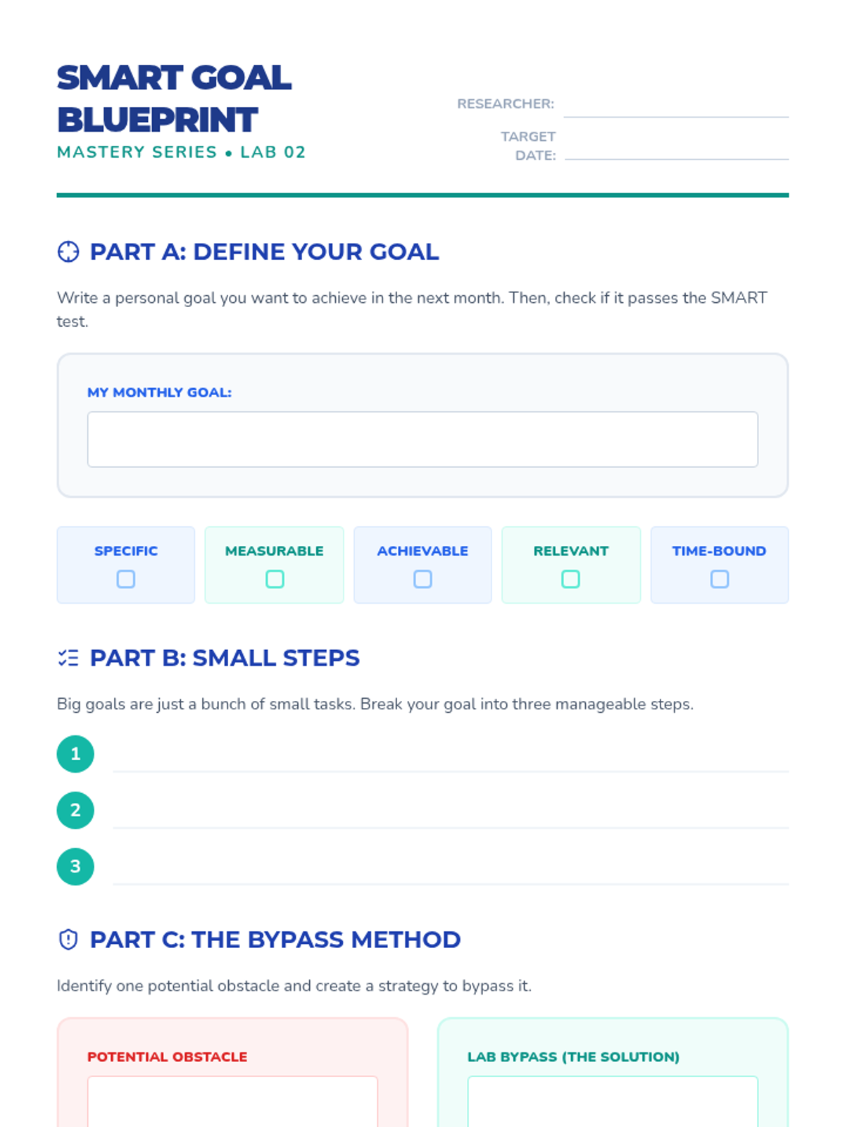 Students learn the SMART criteria and practice breaking large goals into manageable action steps.