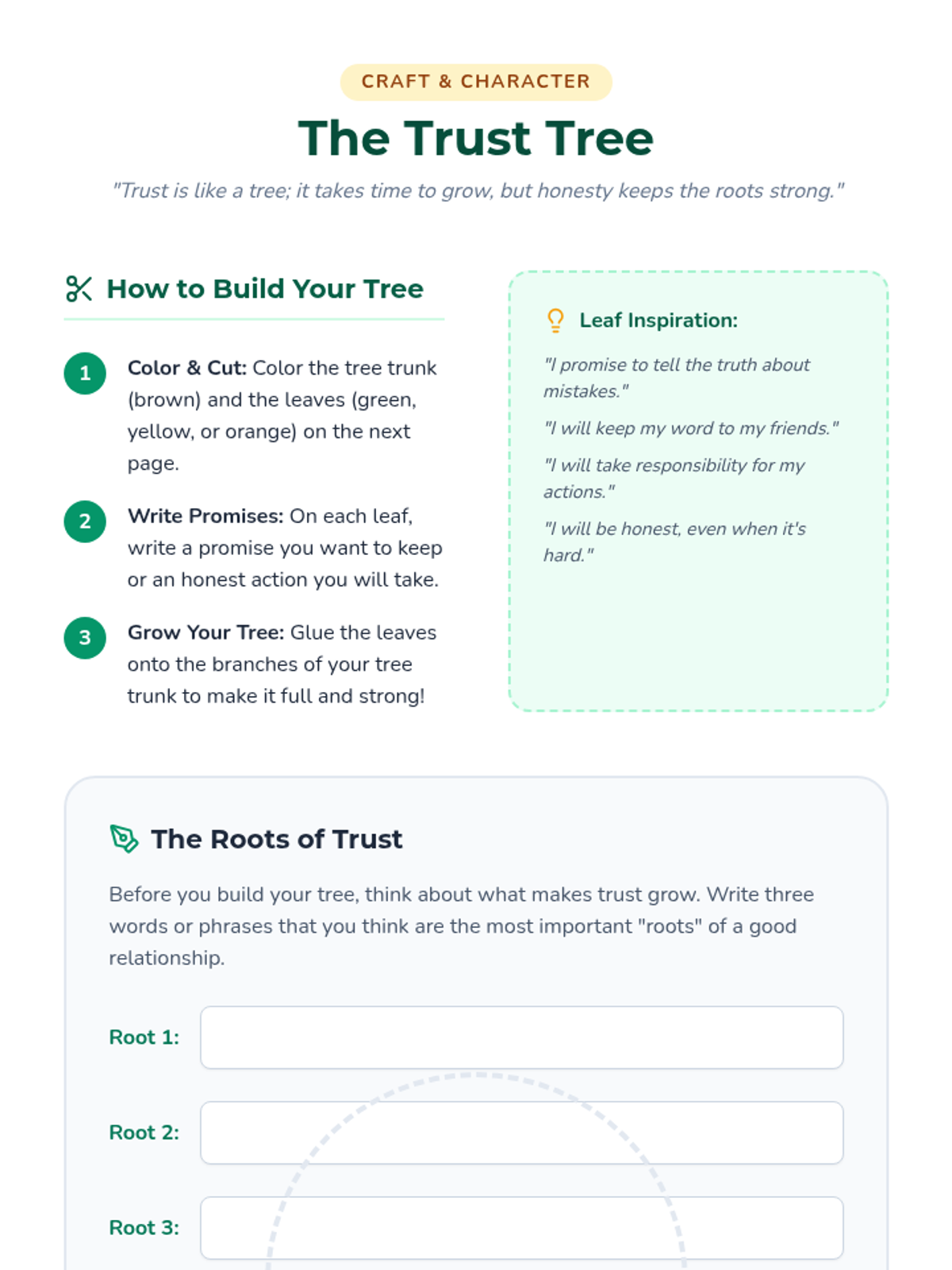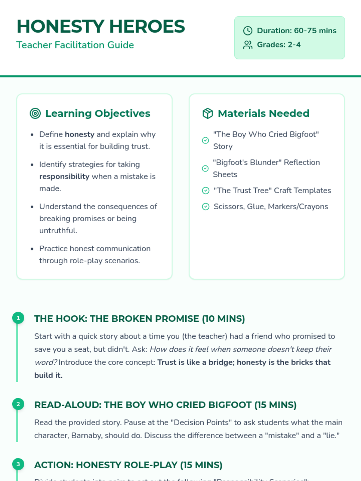 A comprehensive SEL lesson on honesty, focusing on truth-telling, responsibility, and building trust through a story, role-play, and a creative craft.