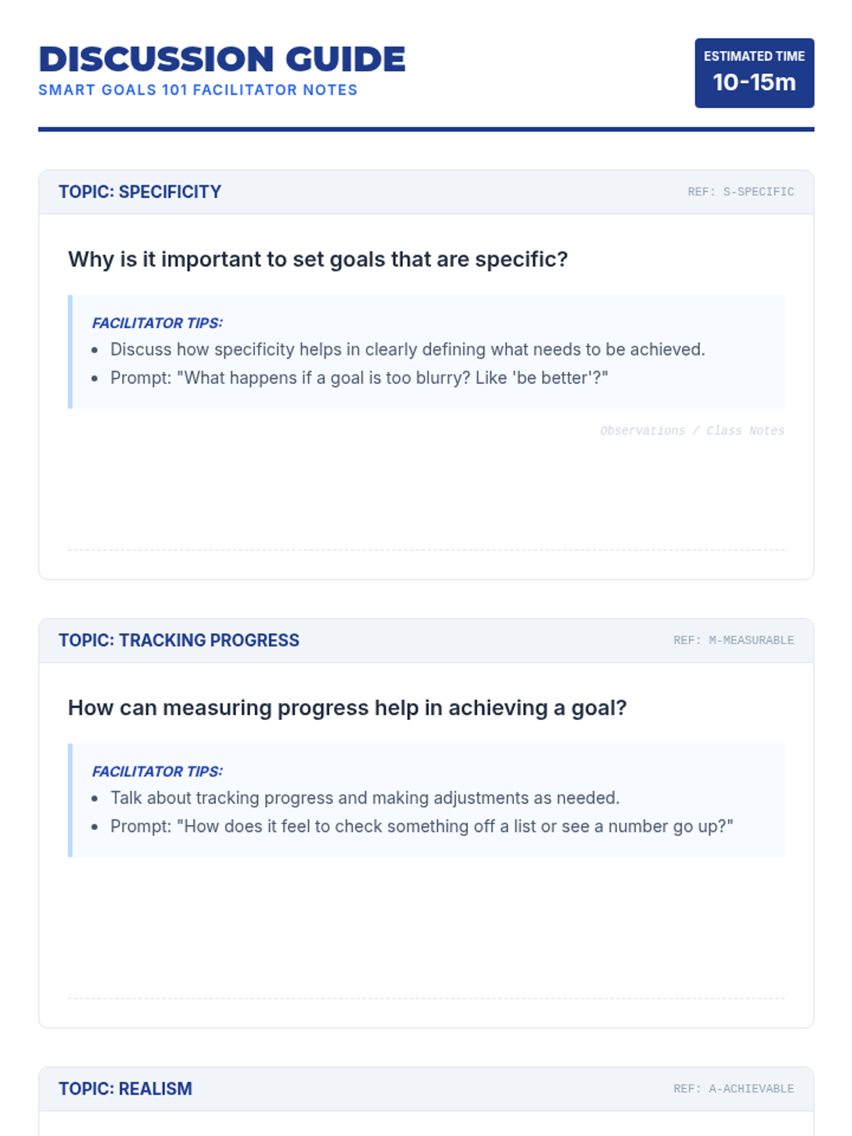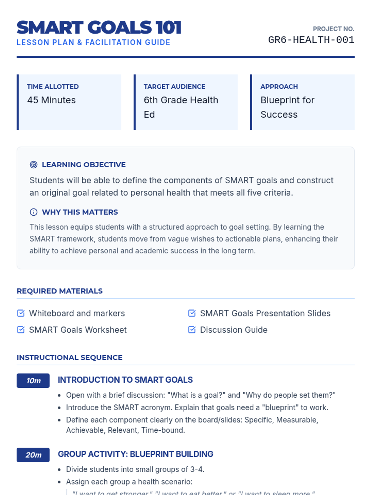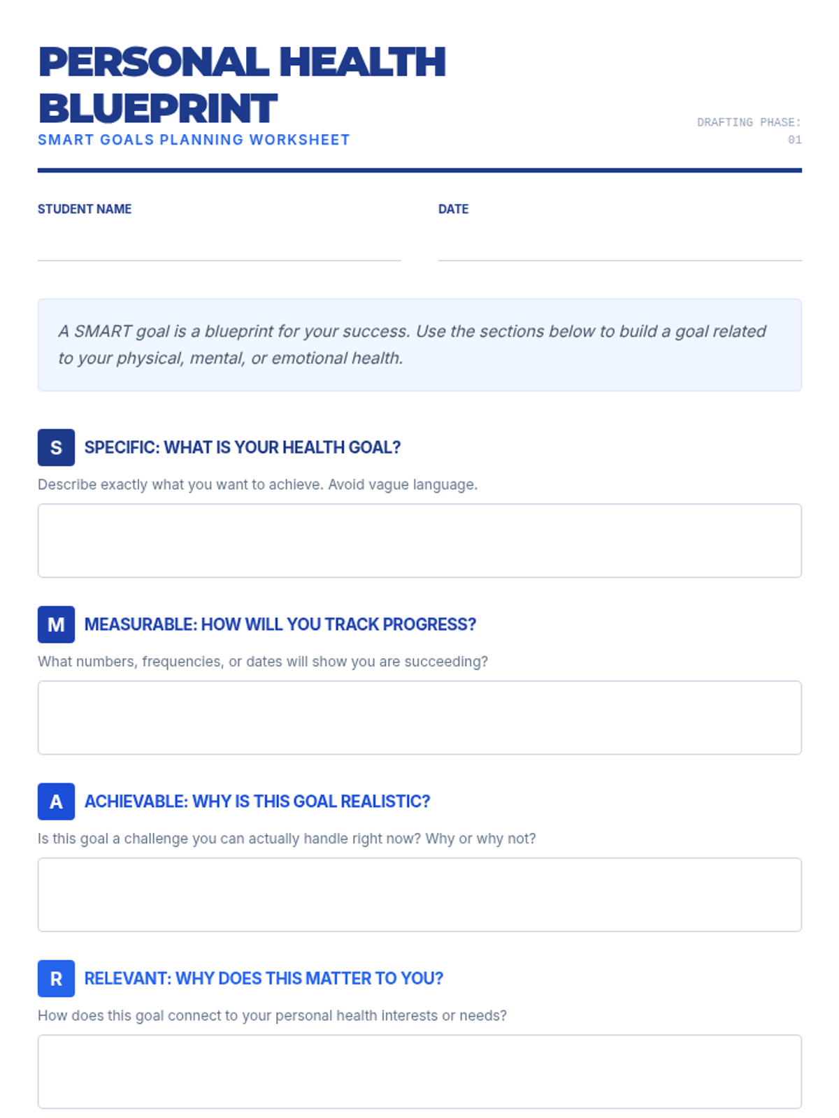 This lesson introduces sixth-grade students to the concept of SMART goals (Specific, Measurable, Achievable, Relevant, and Time-bound) and guides them in creating their own health-related goals.