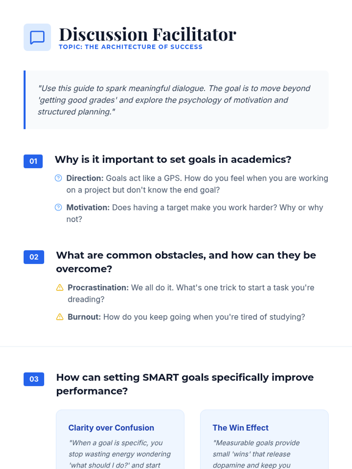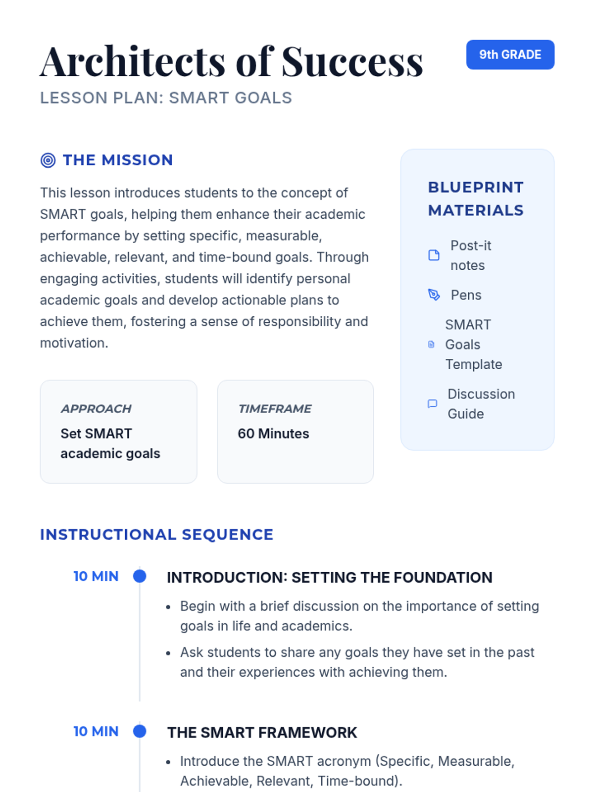 This lesson introduces 9th-grade students to the SMART goal-setting framework, providing them with the tools to transform vague academic intentions into actionable, time-bound plans for success.
