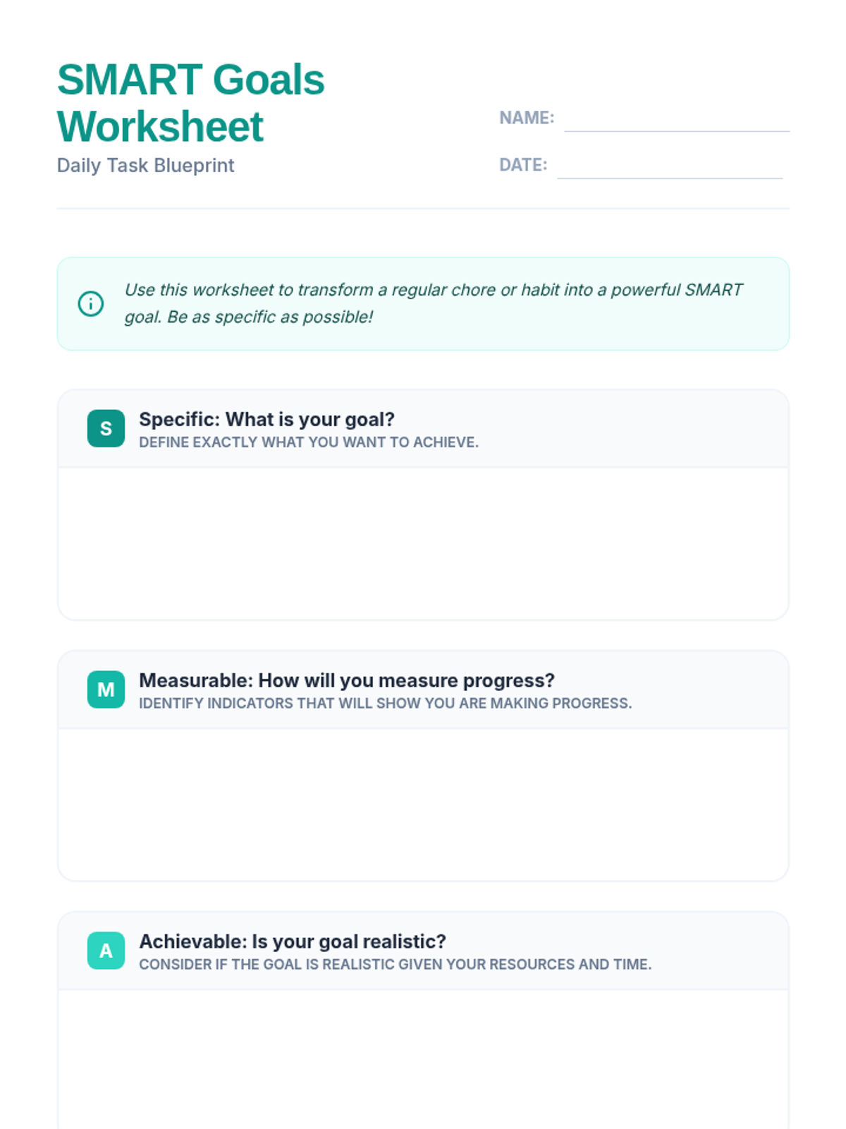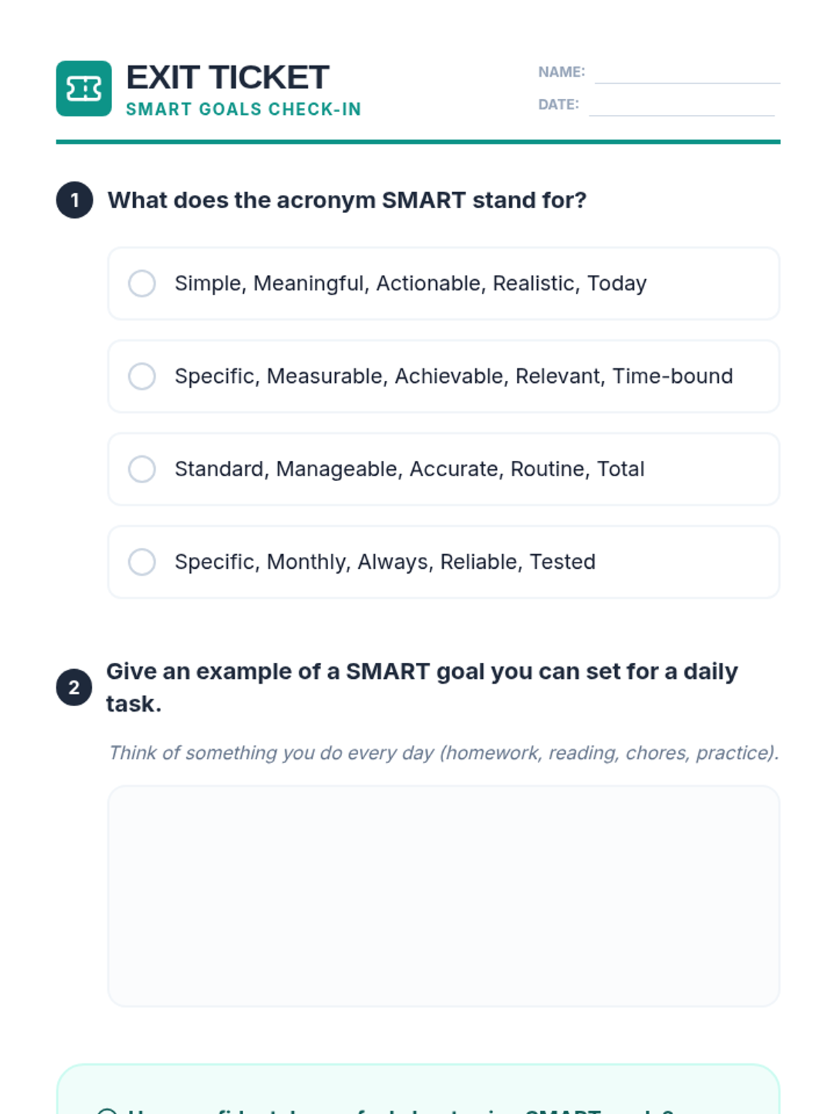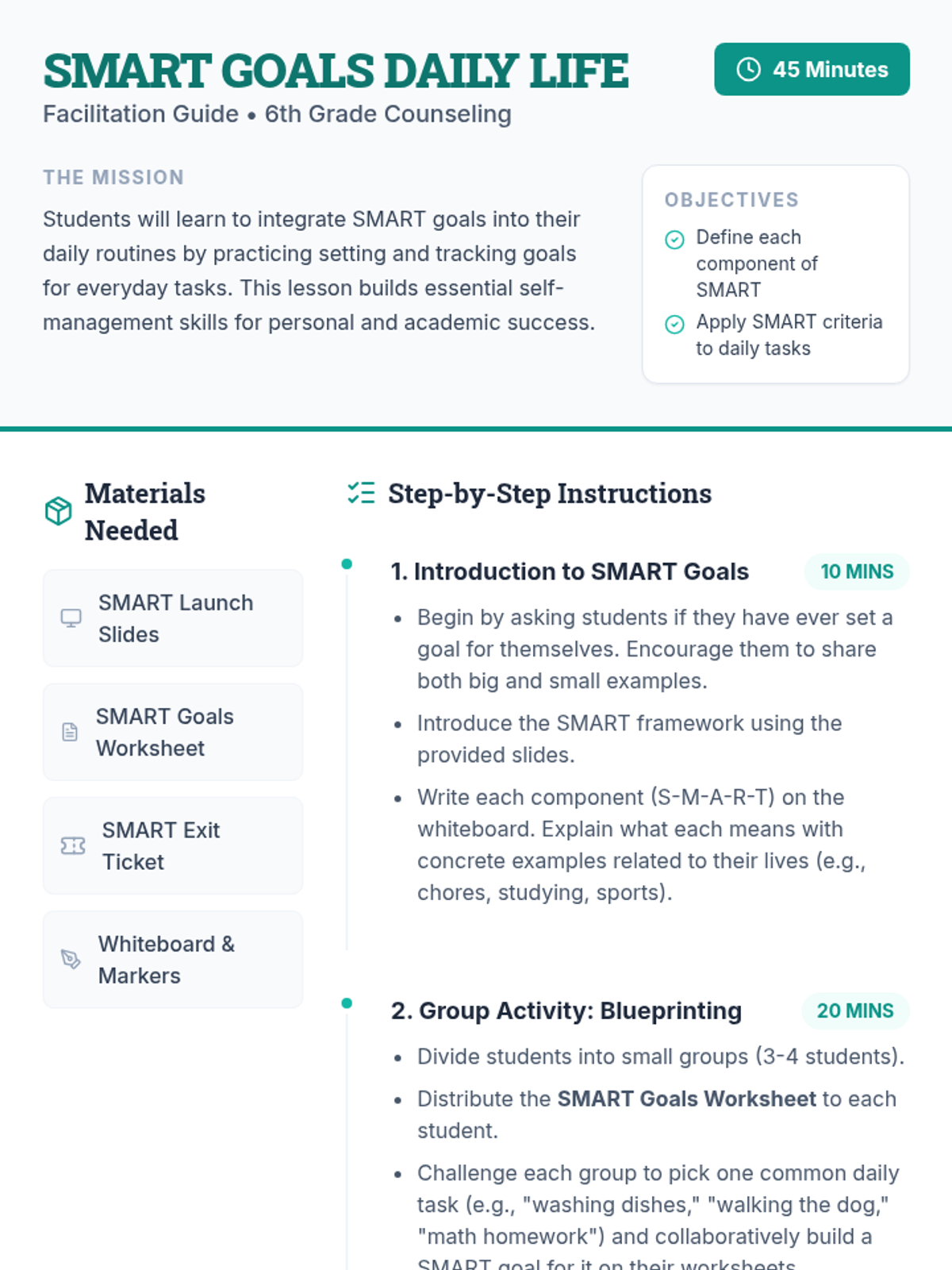 Students will learn to integrate SMART goals into their daily routines by practicing setting and tracking goals for everyday tasks, fostering essential personal and academic success skills.