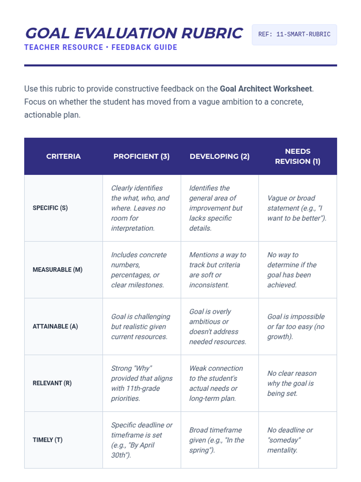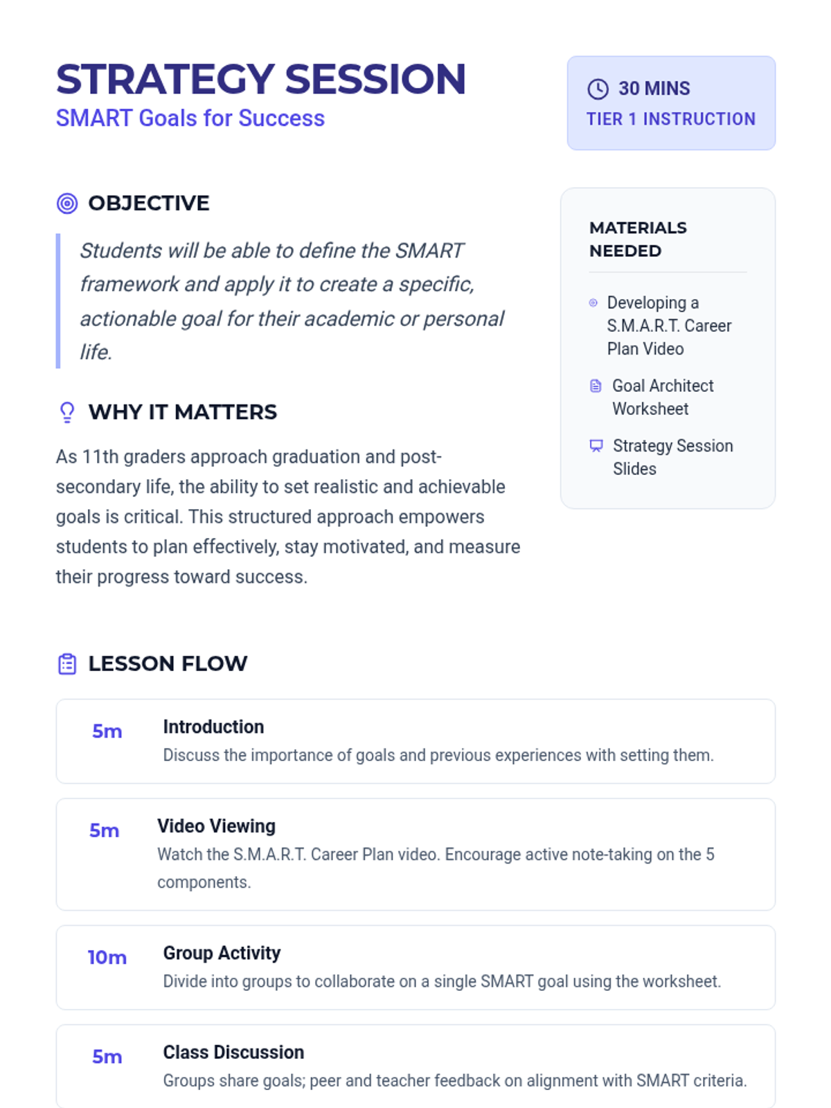 A comprehensive lesson designed for 11th-grade students to master the SMART goal-setting framework. Students will learn to transform vague ambitions into specific, actionable plans for academic and personal success.