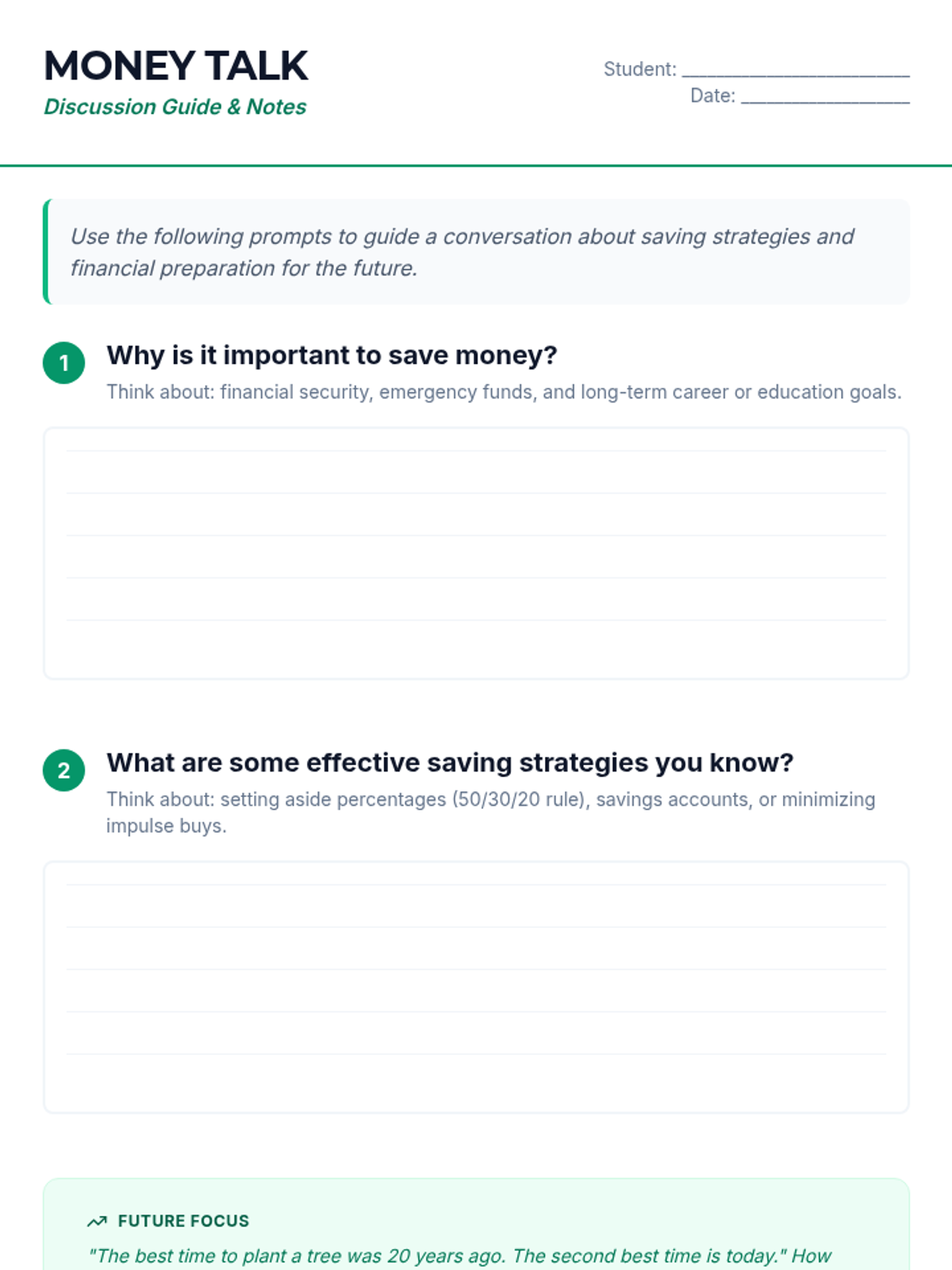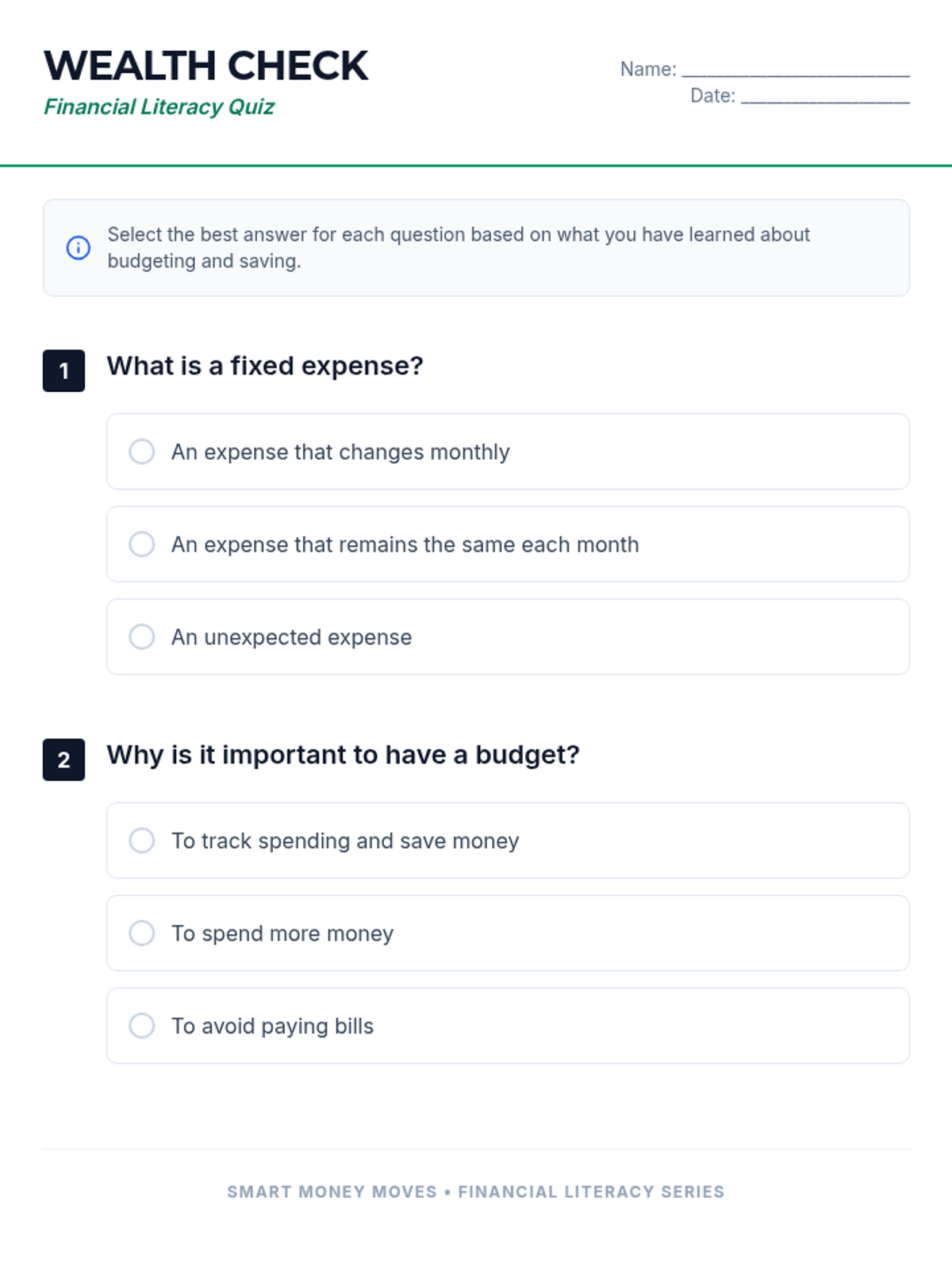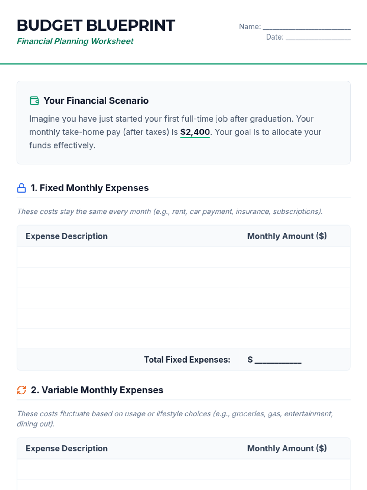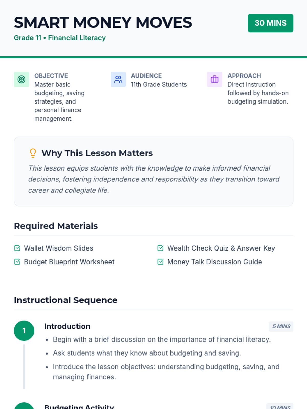 This lesson introduces 11th-grade students to essential financial literacy skills, focusing on budgeting, saving, and managing personal finances. Students will engage in activities that help them understand the importance of financial planning for their future careers.