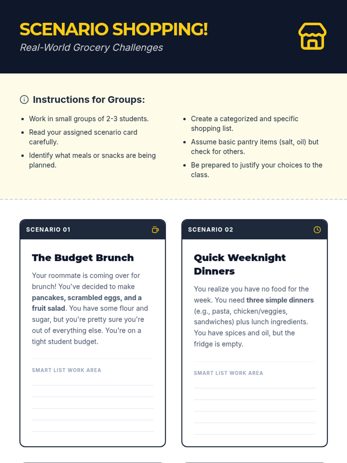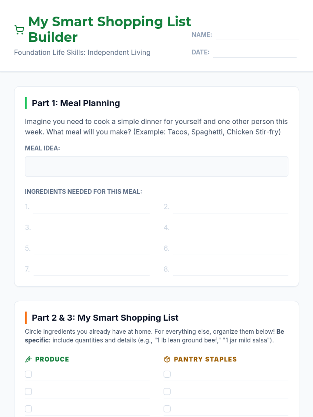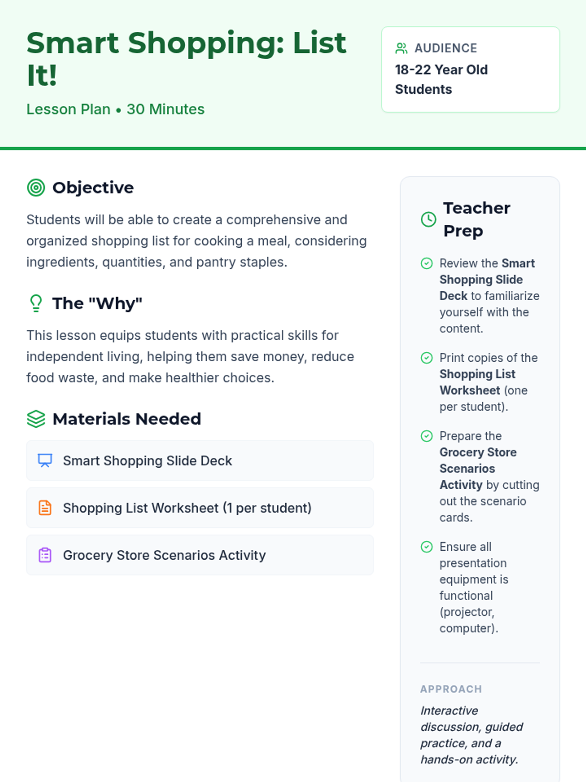 A 30-minute foundational lesson for young adults (18-22) on the essential life skill of creating effective, organized shopping lists to save money and reduce food waste.