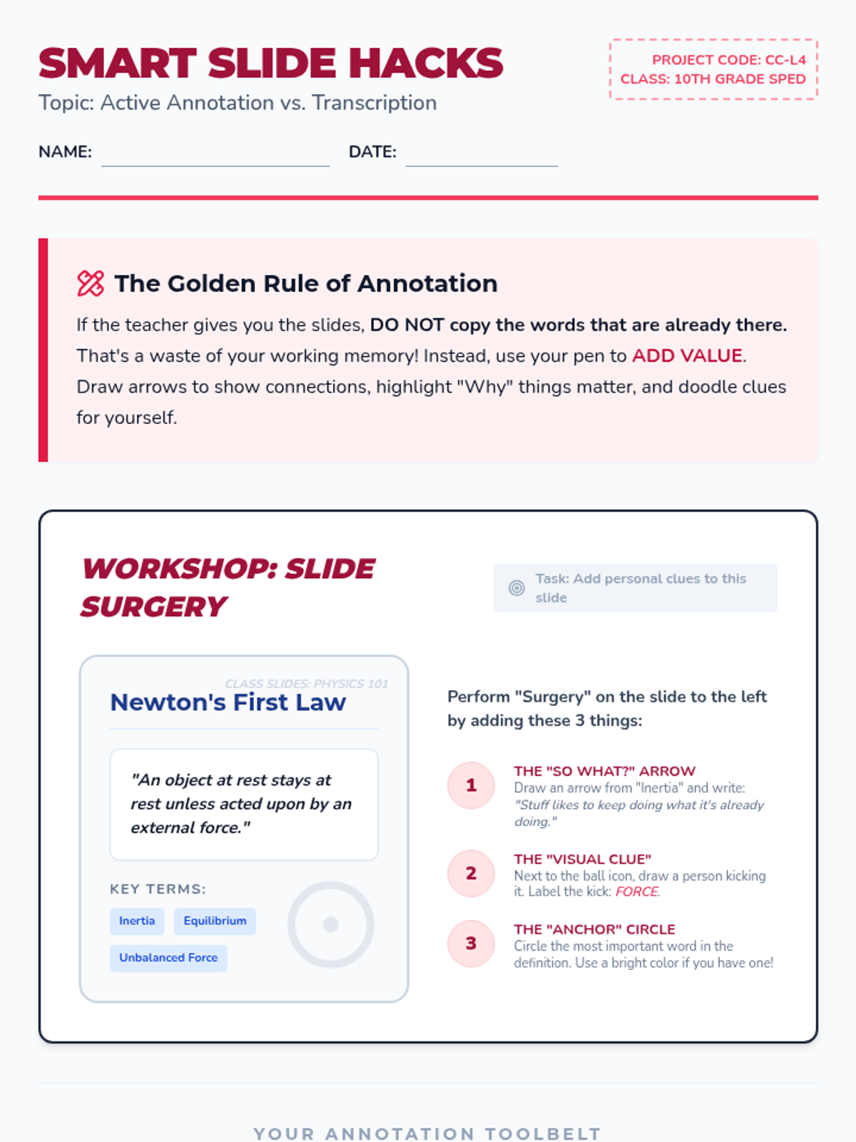 Strategies for annotating existing materials like slides and diagrams to reduce writing volume while increasing personal connection to the content.