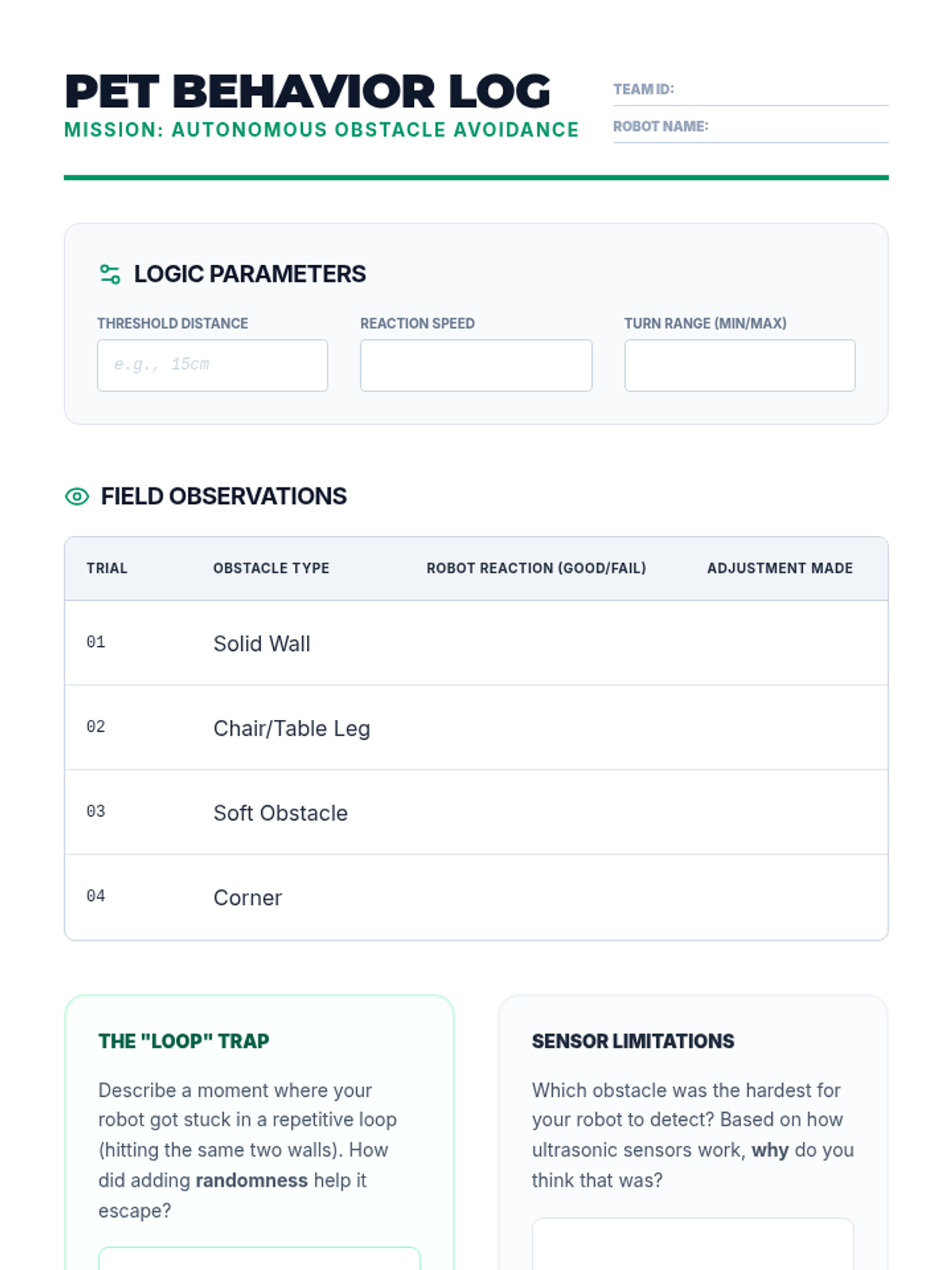 Students implement ultrasonic sensor logic to create 'smart wandering' behaviors, allowing robots to navigate obstacles autonomously.