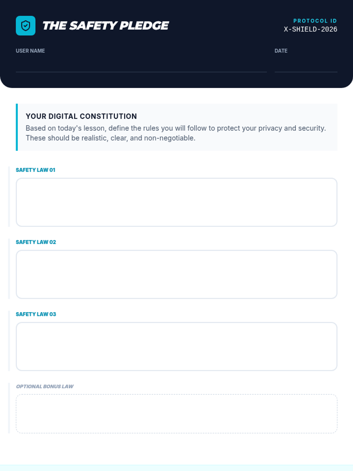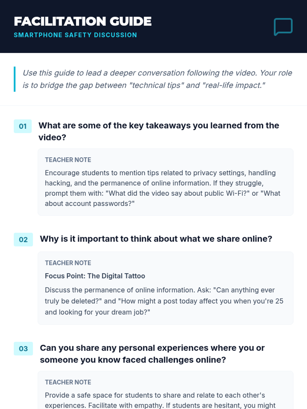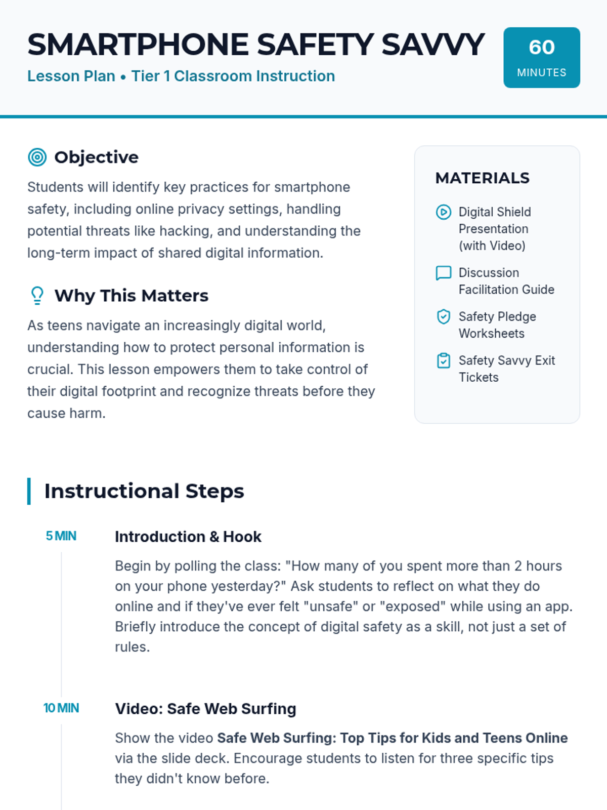 A comprehensive lesson for teens focused on smartphone safety, online privacy, and digital threats. Students watch an educational video, engage in guided discussions, and create a personal safety pledge.