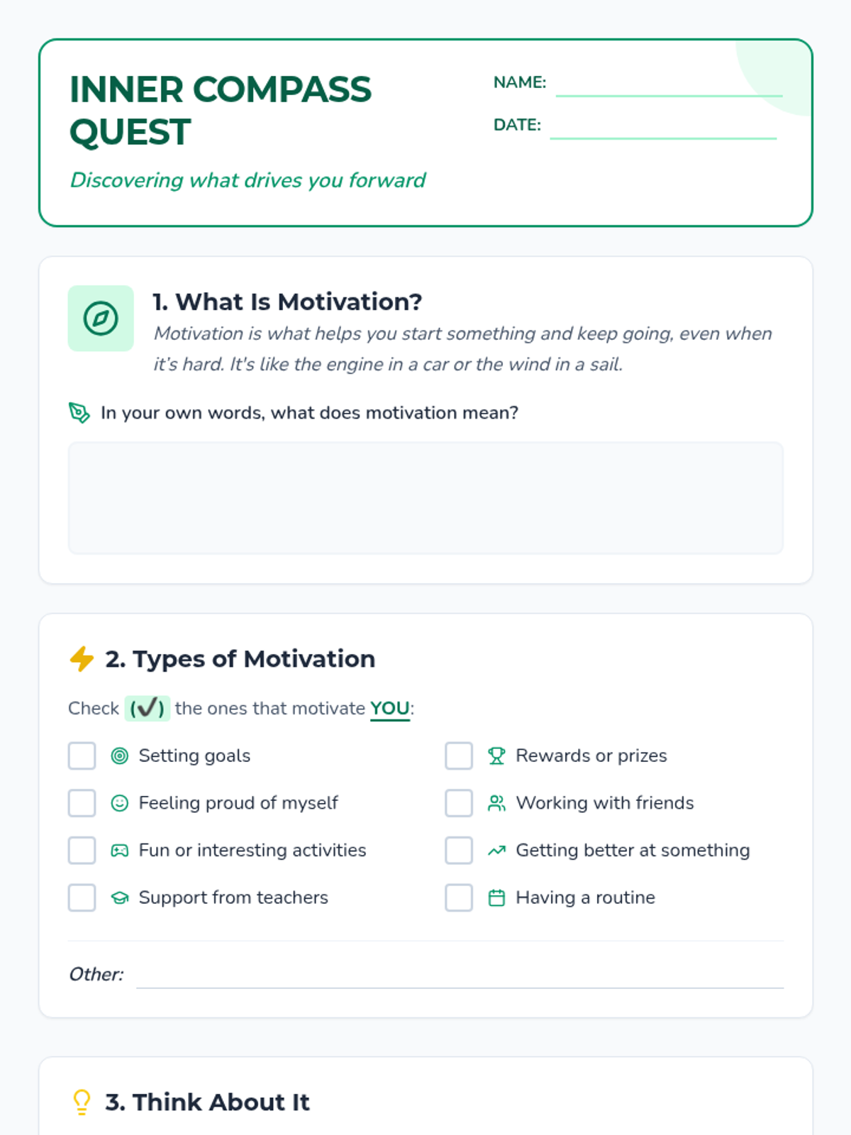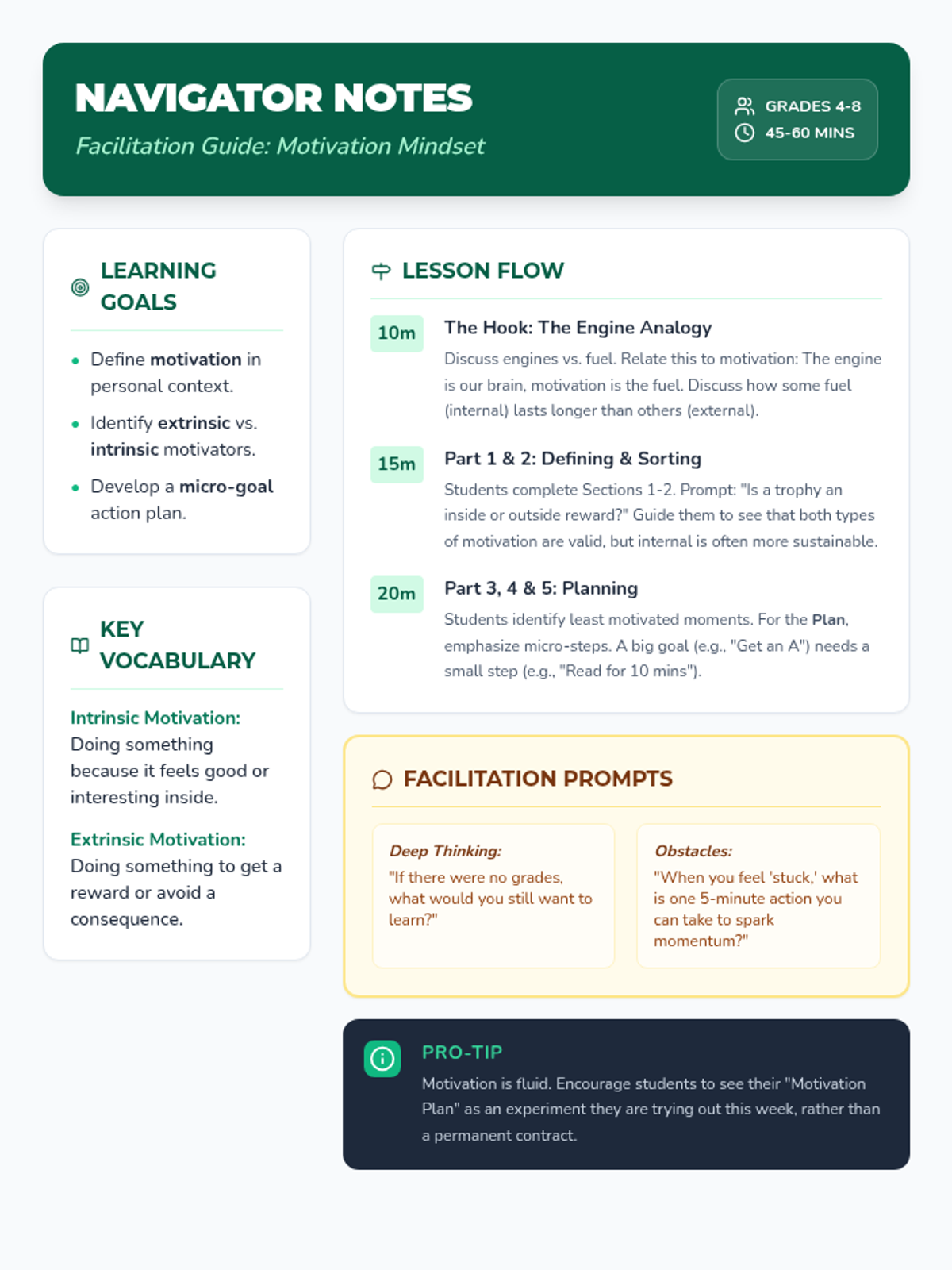 A lesson designed to help students identify their personal intrinsic and extrinsic motivators, set goals, and develop strategies for staying engaged when tasks become challenging.