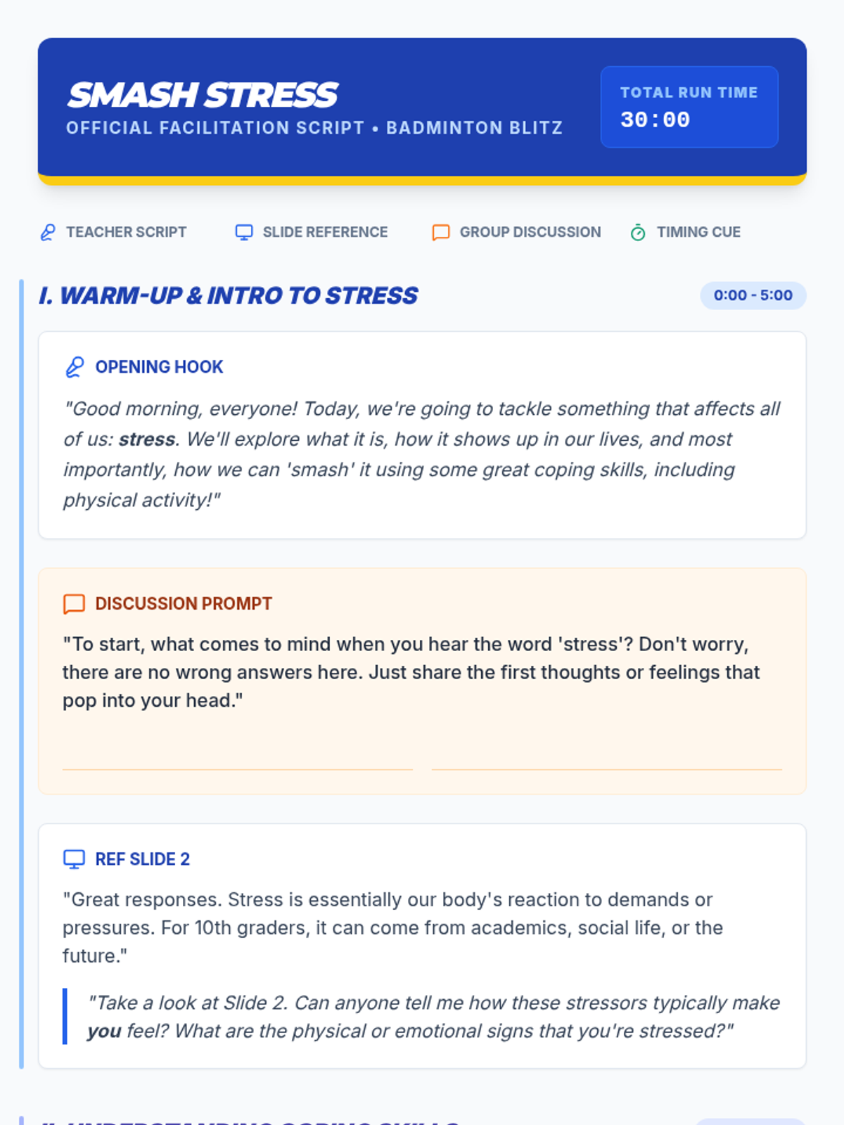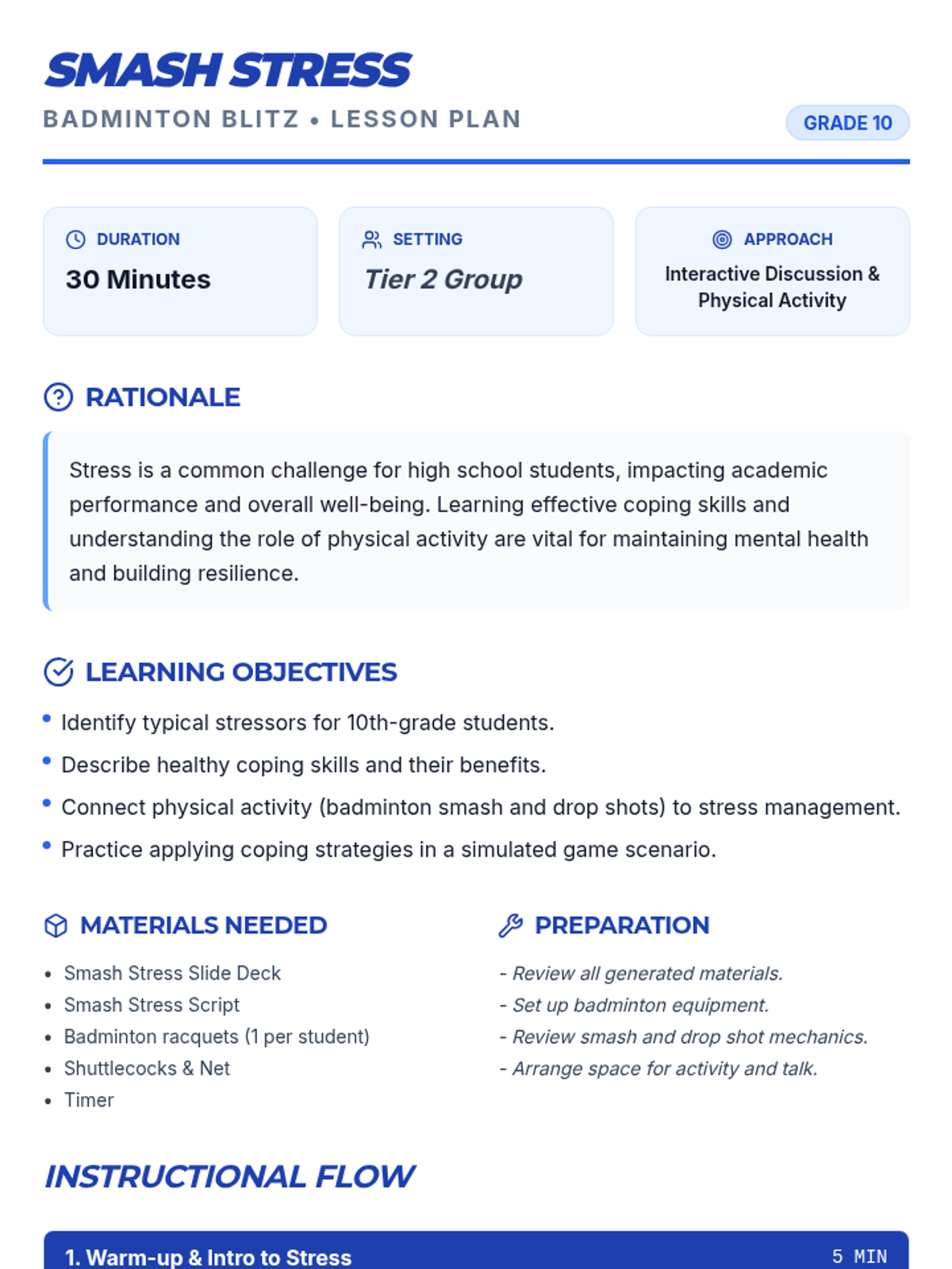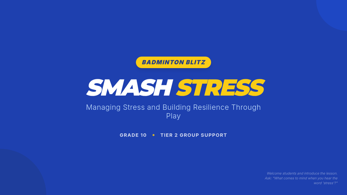 This 30-minute lesson for 10th-grade small groups teaches effective stress management and coping skills by connecting them to the physical activity and strategic thinking required in a fun badminton doubles game. Students will learn to identify stressors and apply healthy coping strategies, using a timer to manage activity duration.