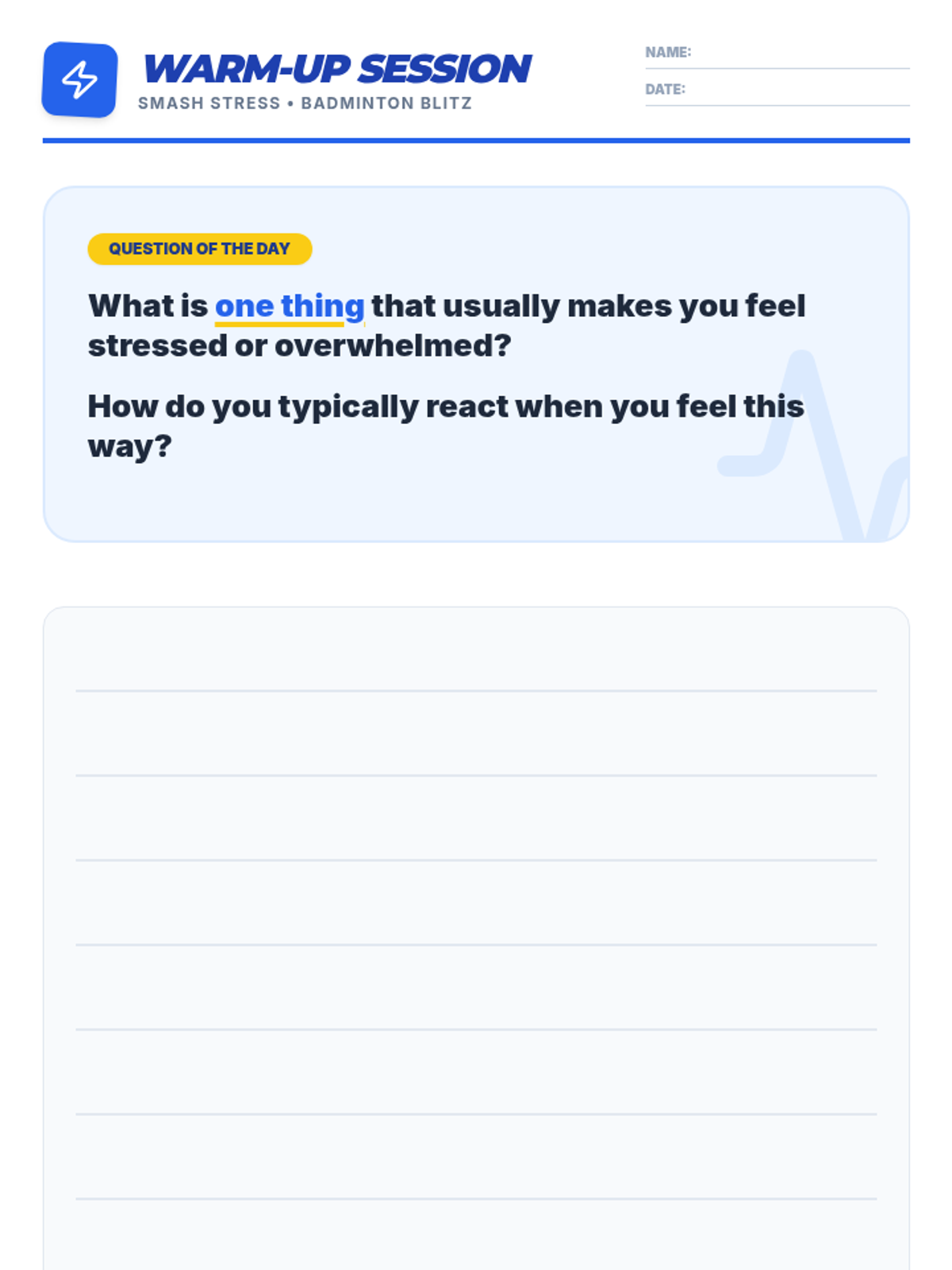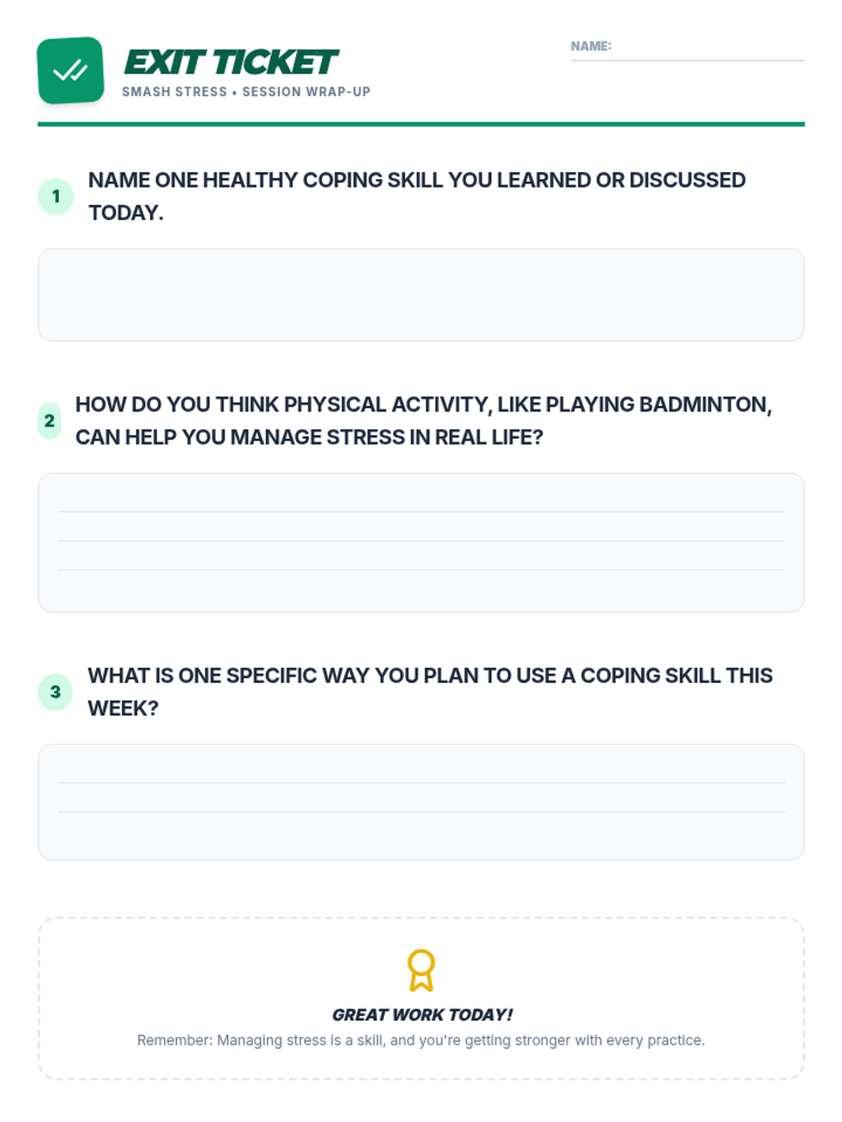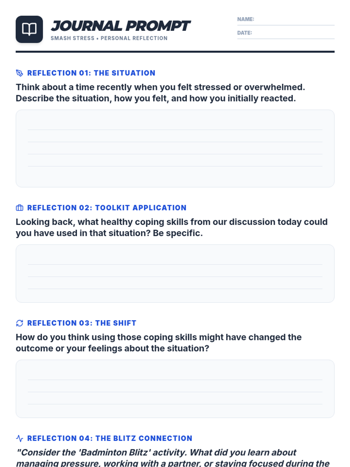 This 30-minute lesson for 10th-grade small groups teaches effective stress management and coping skills by connecting them to the physical activity and strategic thinking required in a fun badminton doubles game. Students will learn to identify stressors and apply healthy coping strategies, using a timer to manage activity duration.