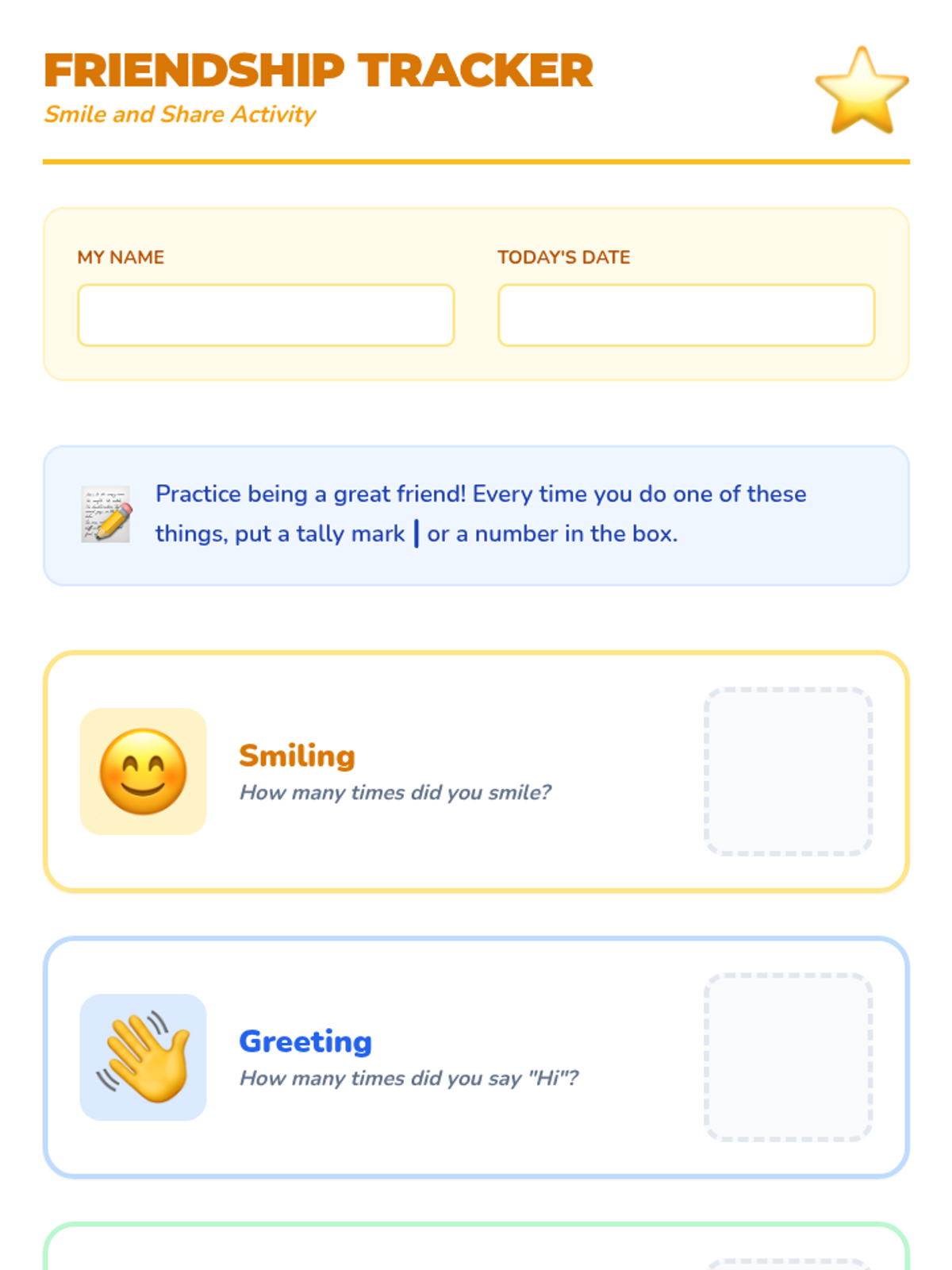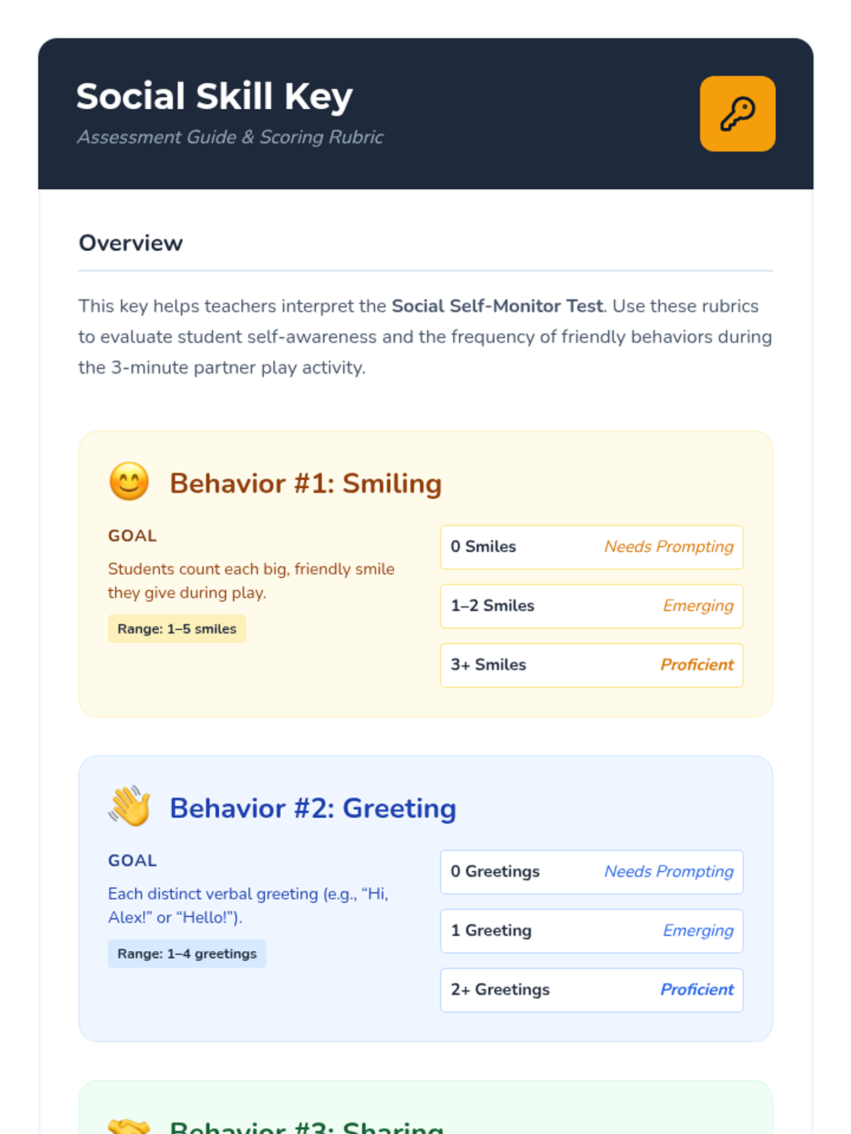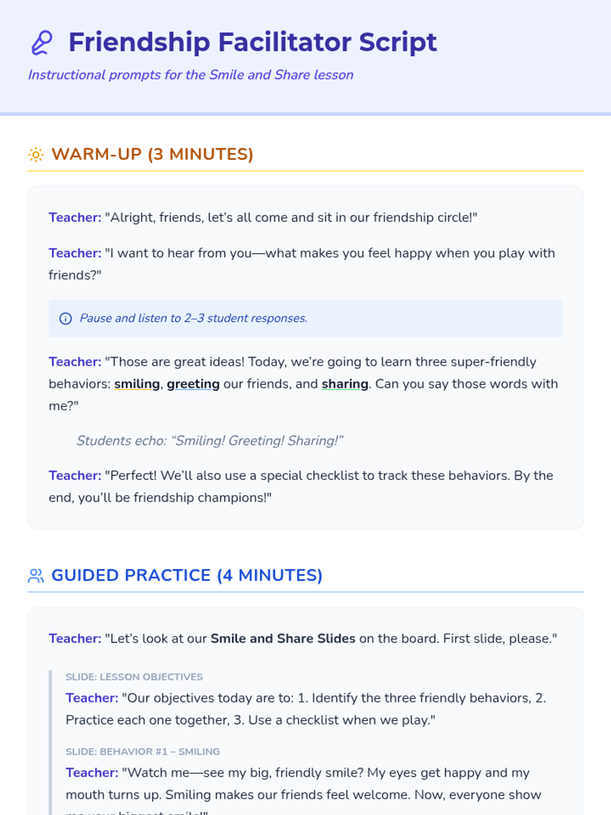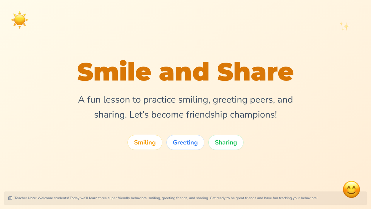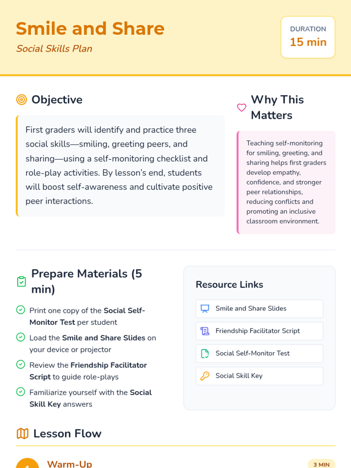 A 15-minute Tier 2 small-group lesson for first graders focused on self-monitoring smiling, greeting, and sharing behaviors to build stronger peer relationships.