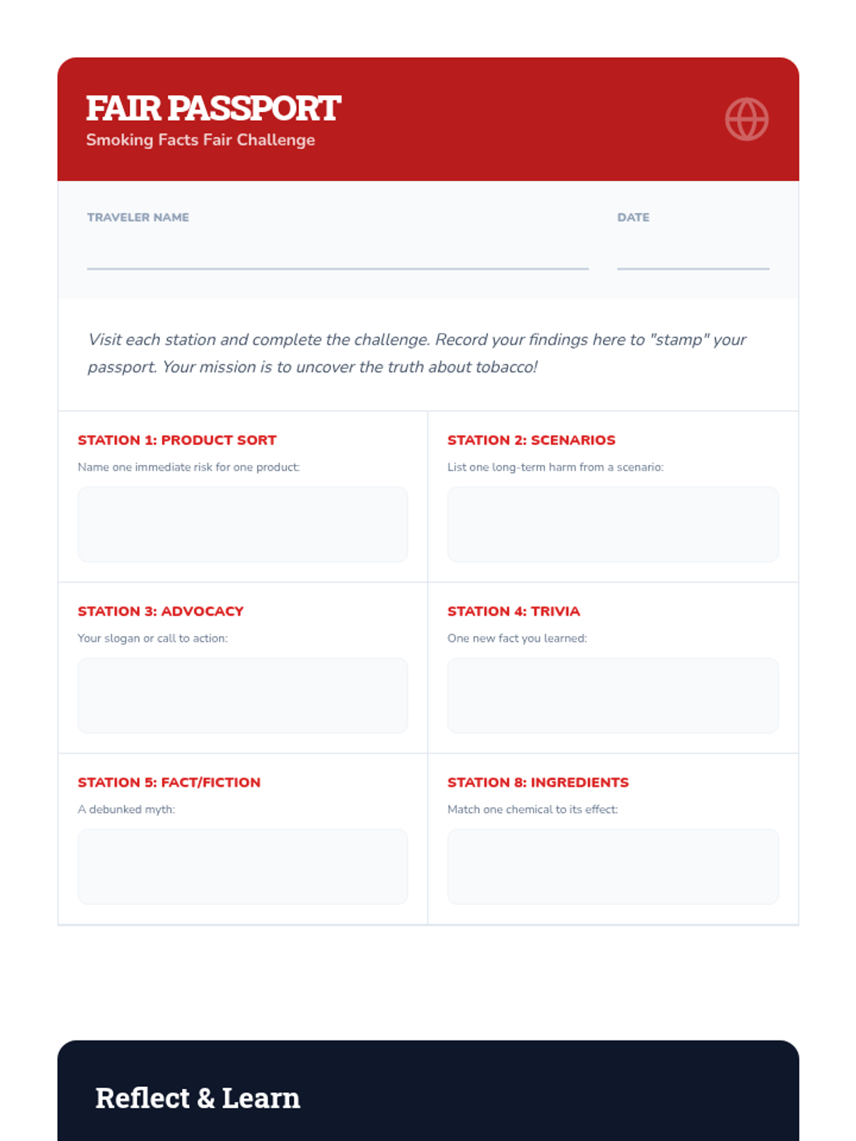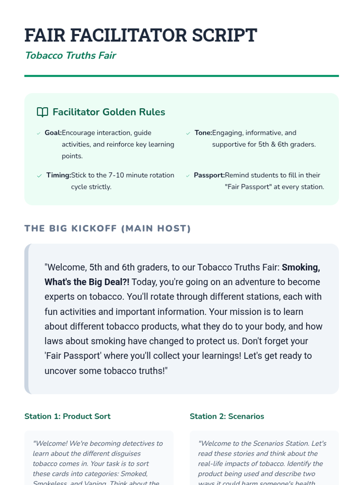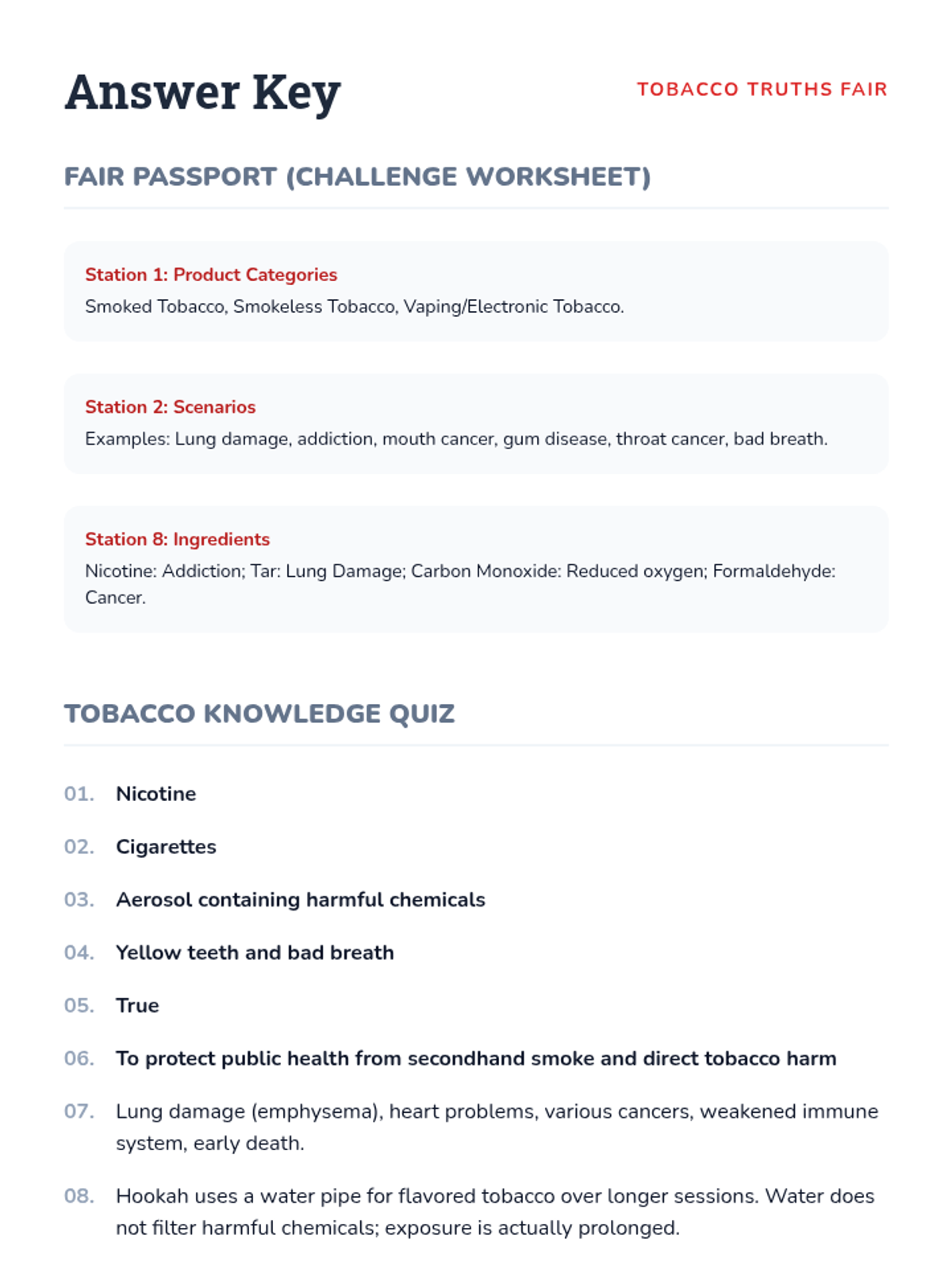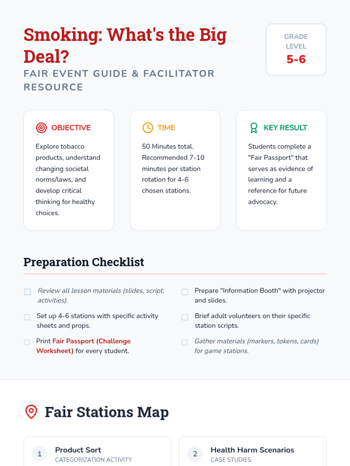 An interactive fair event for 5th and 6th-grade students to explore tobacco products, health risks, and evolving social norms through station-based learning.