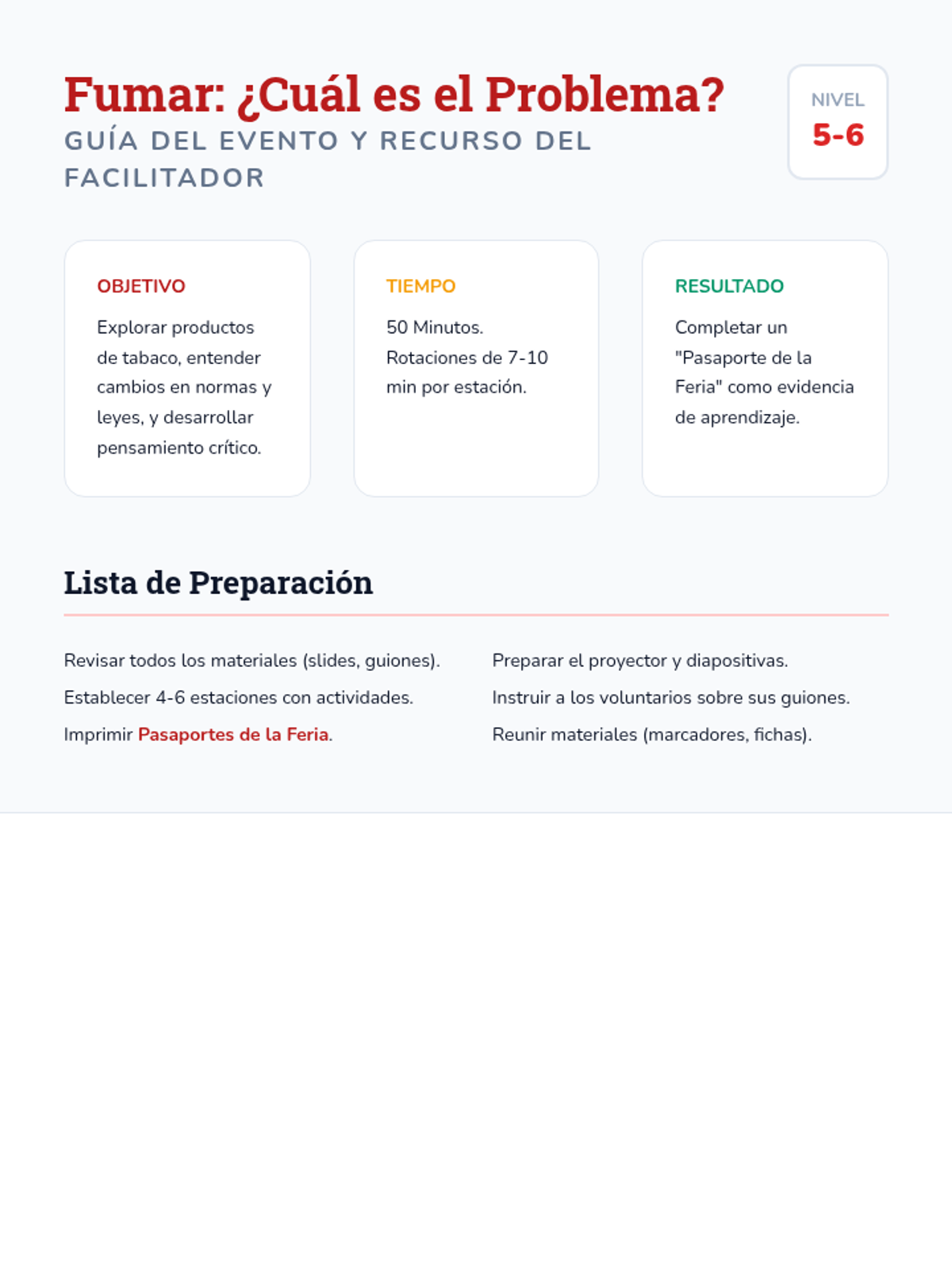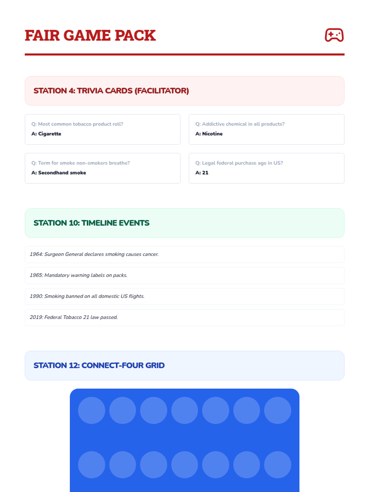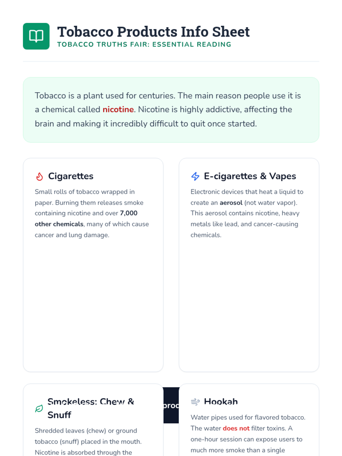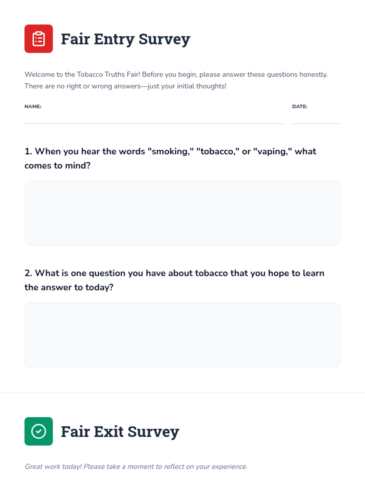 An interactive fair event for 5th and 6th-grade students to explore tobacco products, health risks, and evolving social norms through station-based learning.