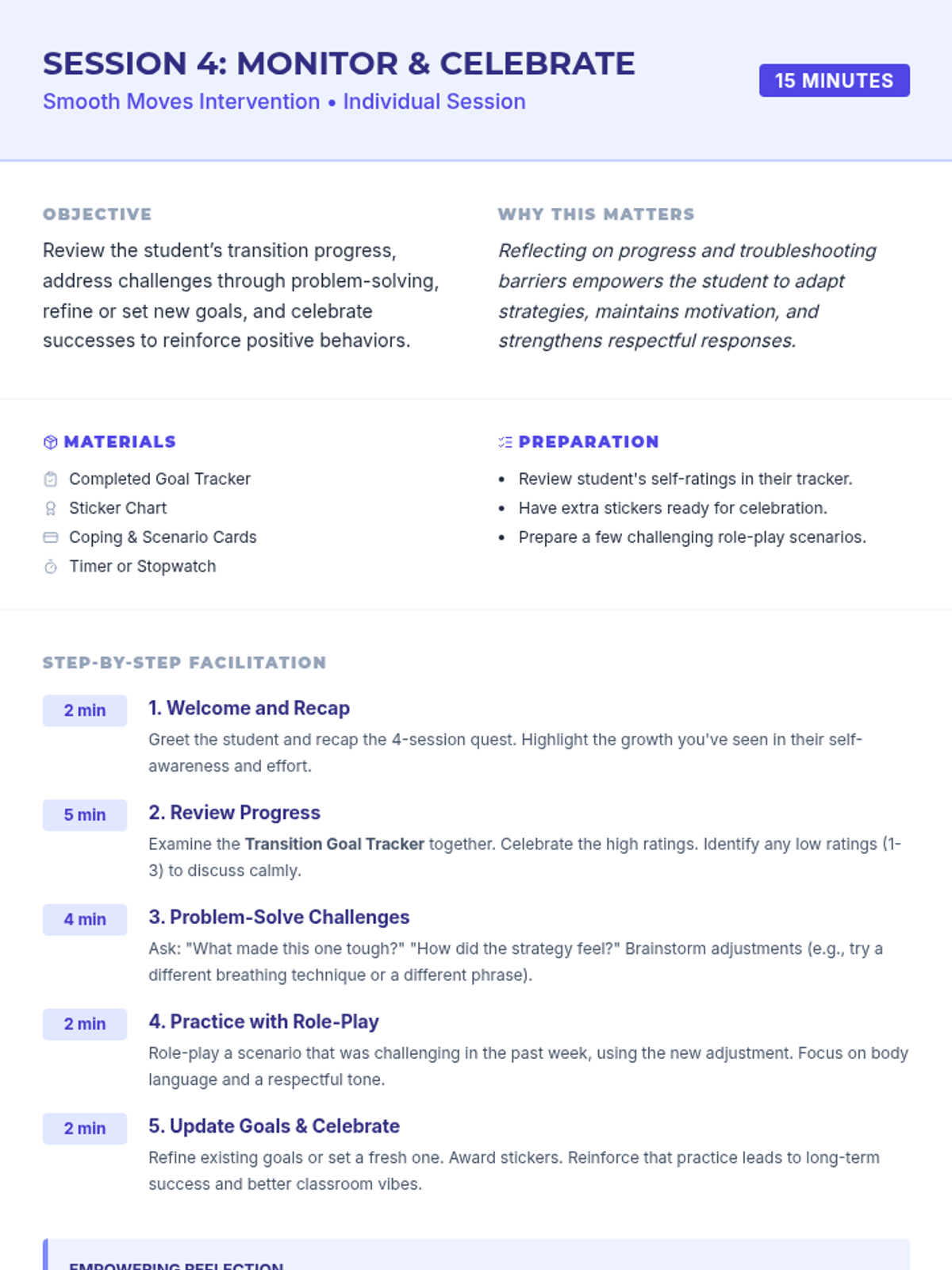 Review tracker progress, problem-solve challenges, and celebrate successes in mastering classroom transitions.