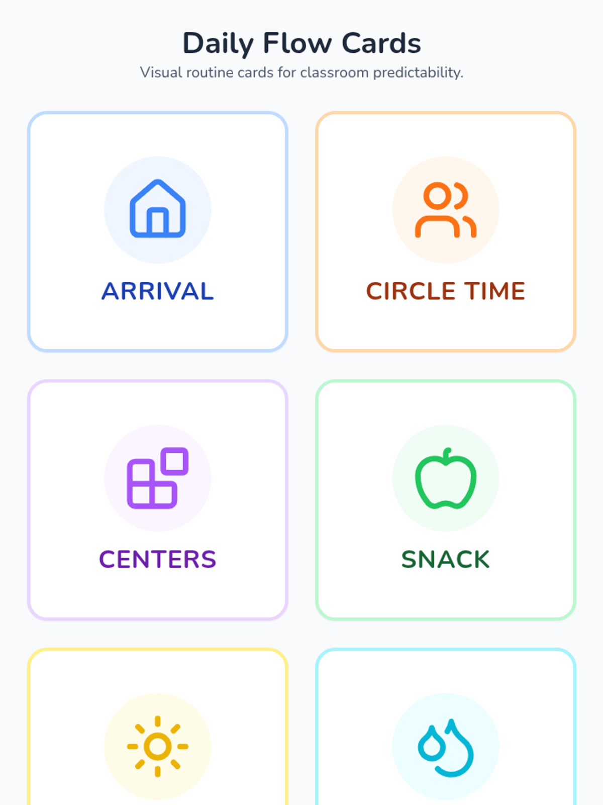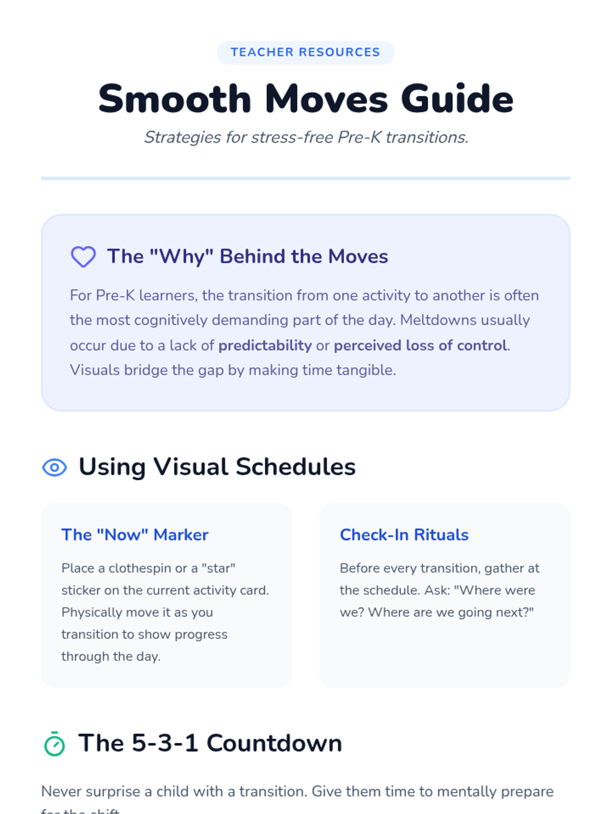 A collection of visual supports designed to help Pre-K students navigate classroom transitions with ease, reducing anxiety and preventing meltdowns through predictability.