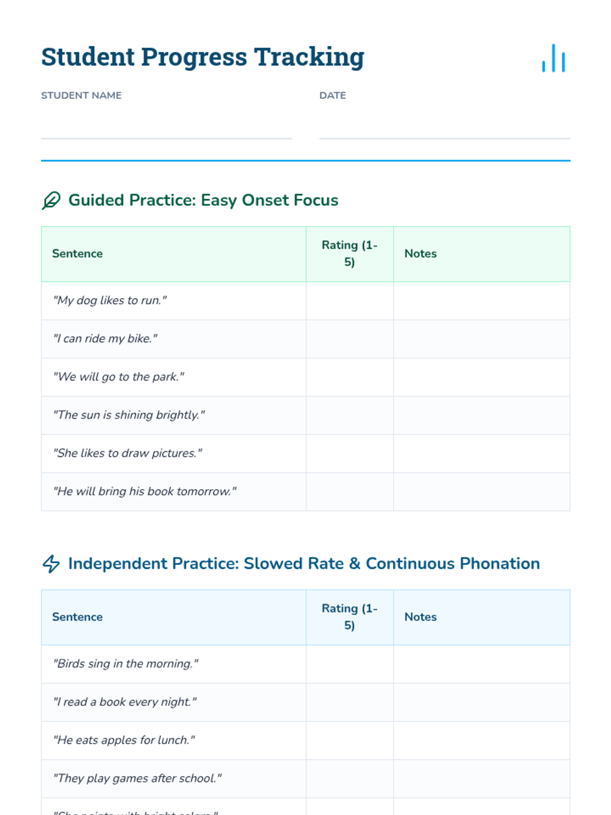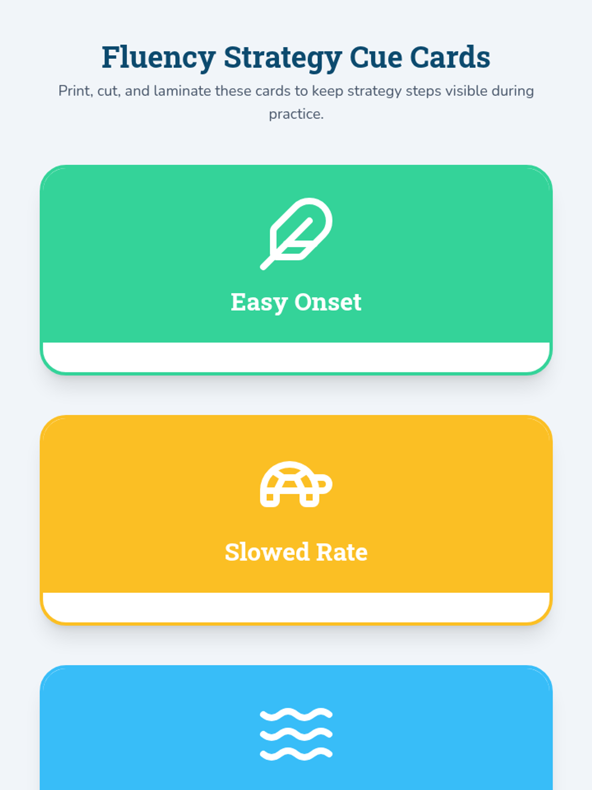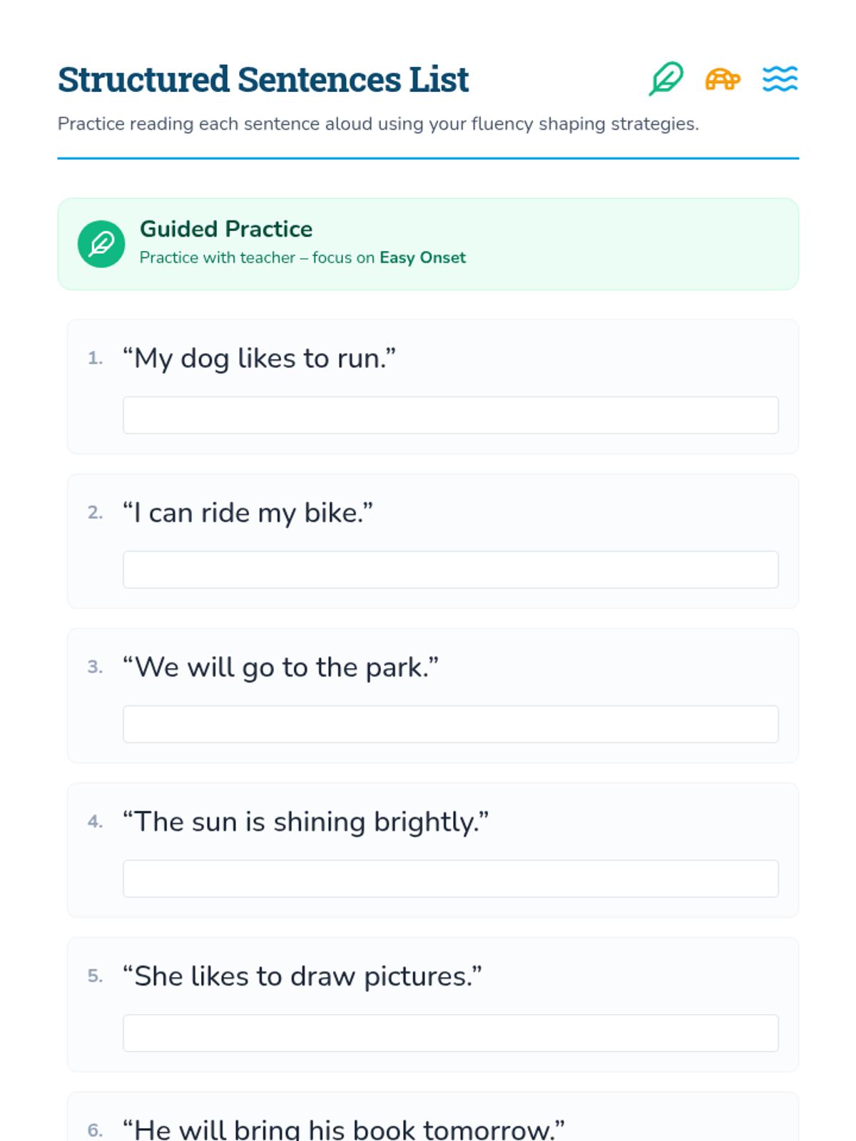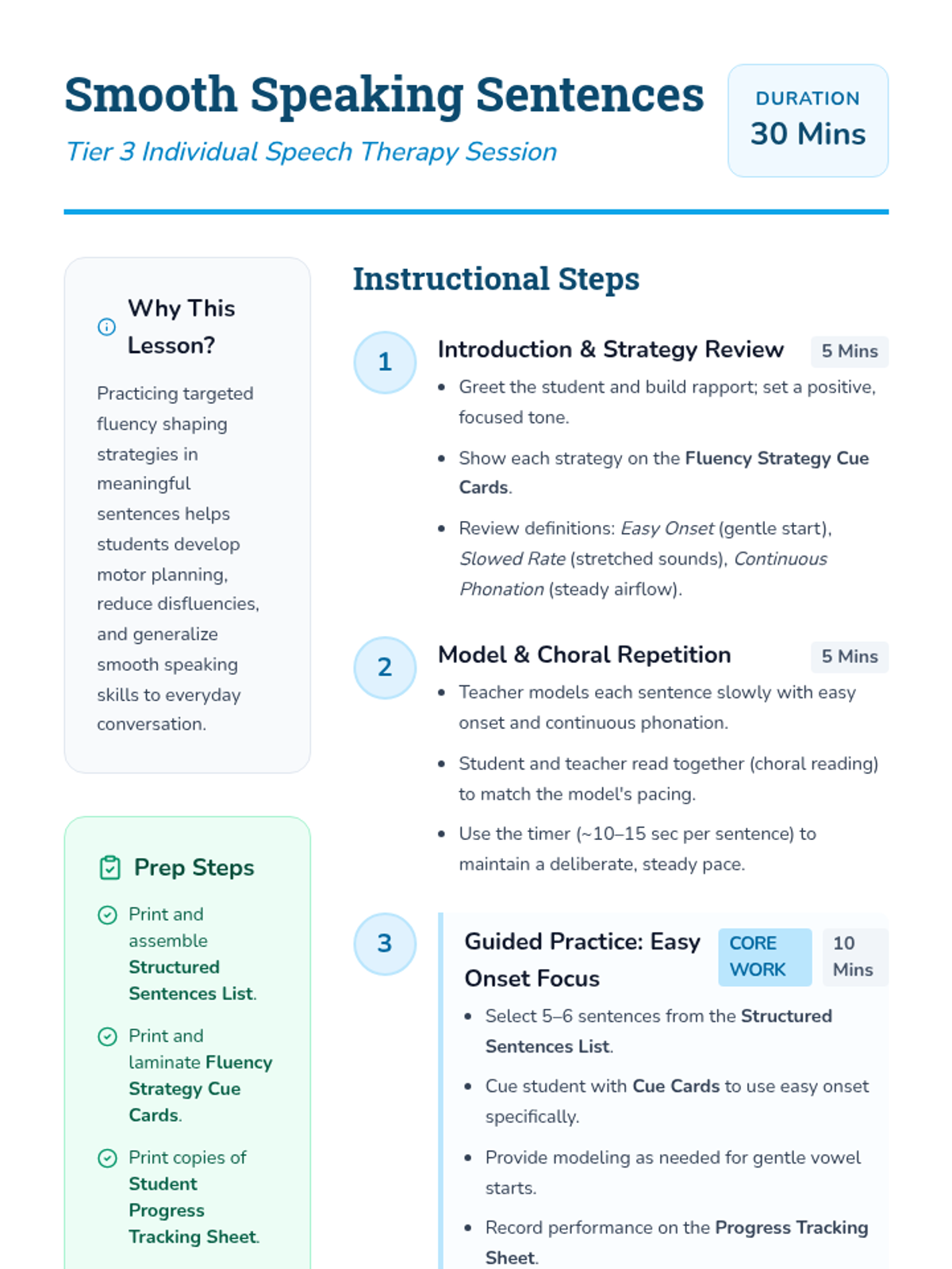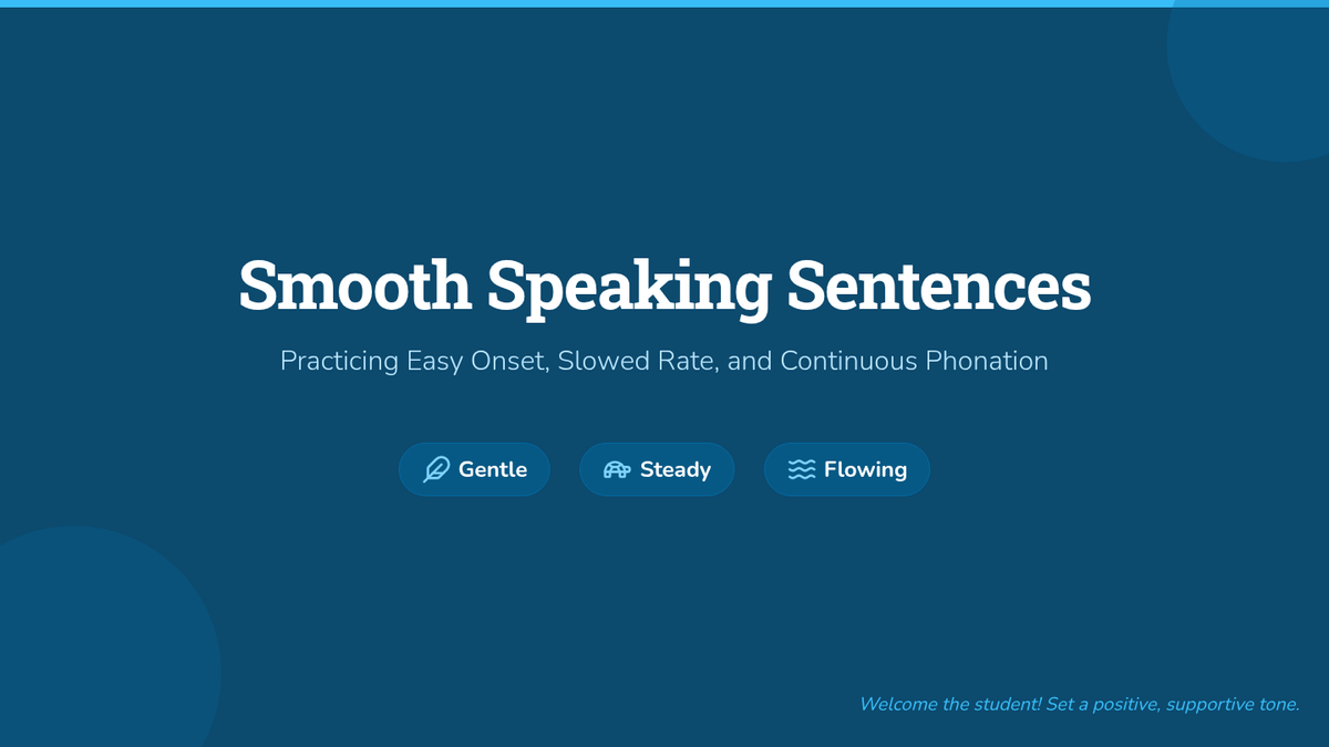 A 30-minute Tier 3 individual speech therapy session for a 4th grader to practice fluency shaping strategies (easy onset, slowed rate, continuous phonation) using structured sentences.