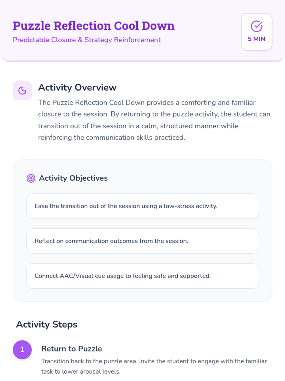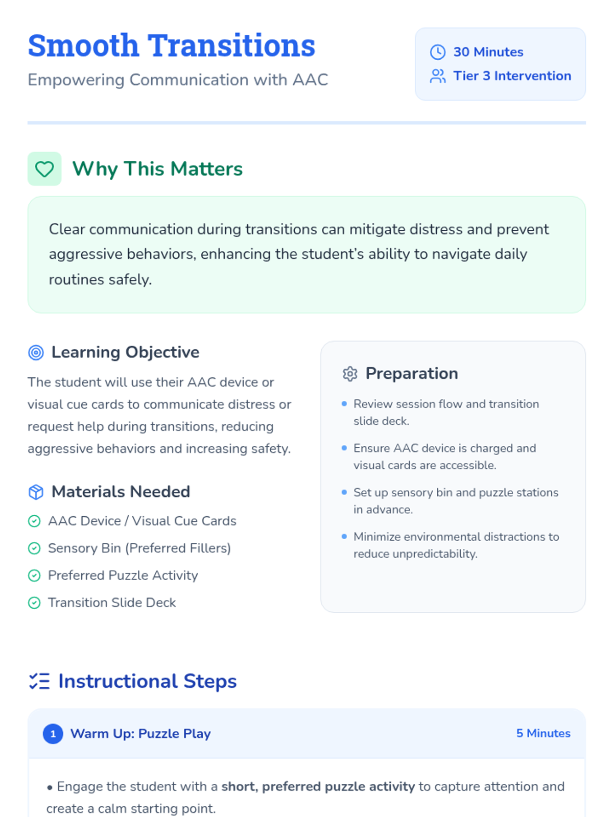 A Tier 3 intervention lesson for nonverbal 2nd grade students with ASD, focusing on using AAC devices and visual cues to communicate distress and request help during transitions to reduce aggressive behaviors.