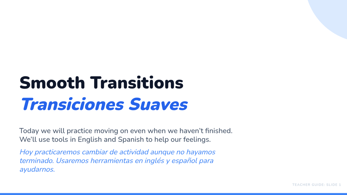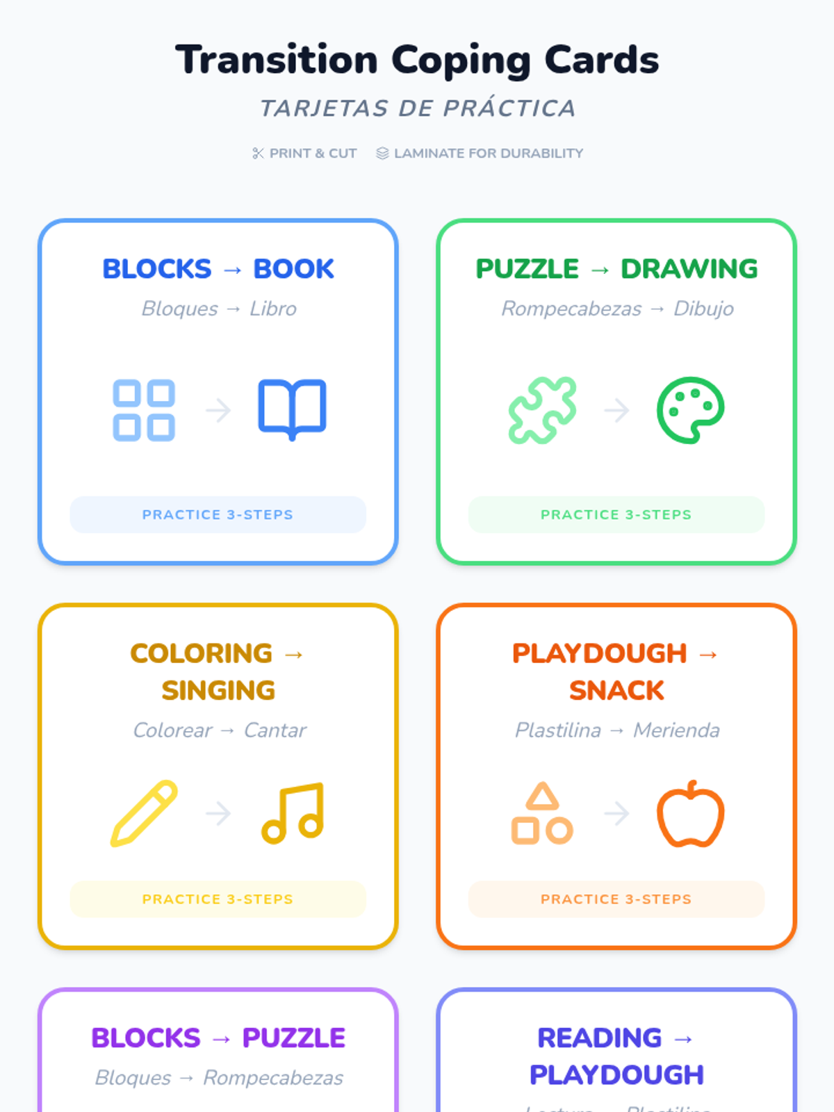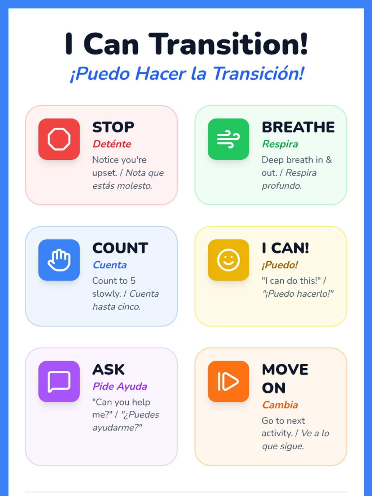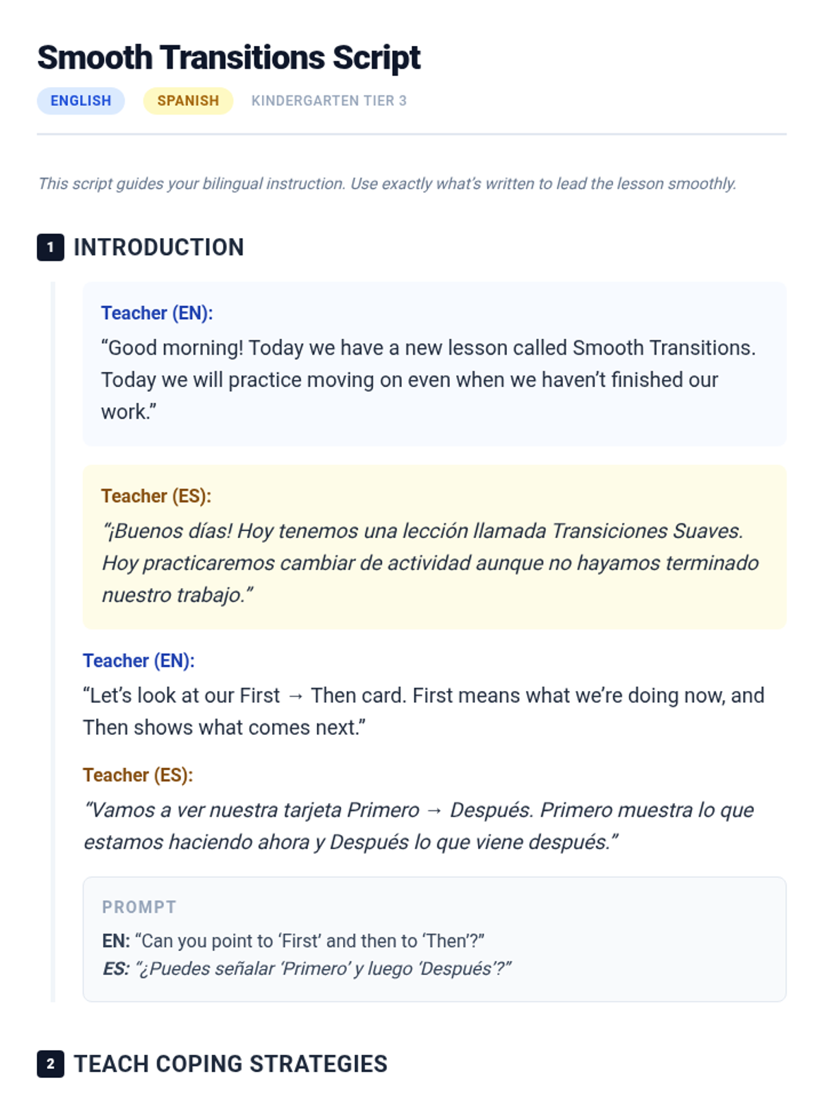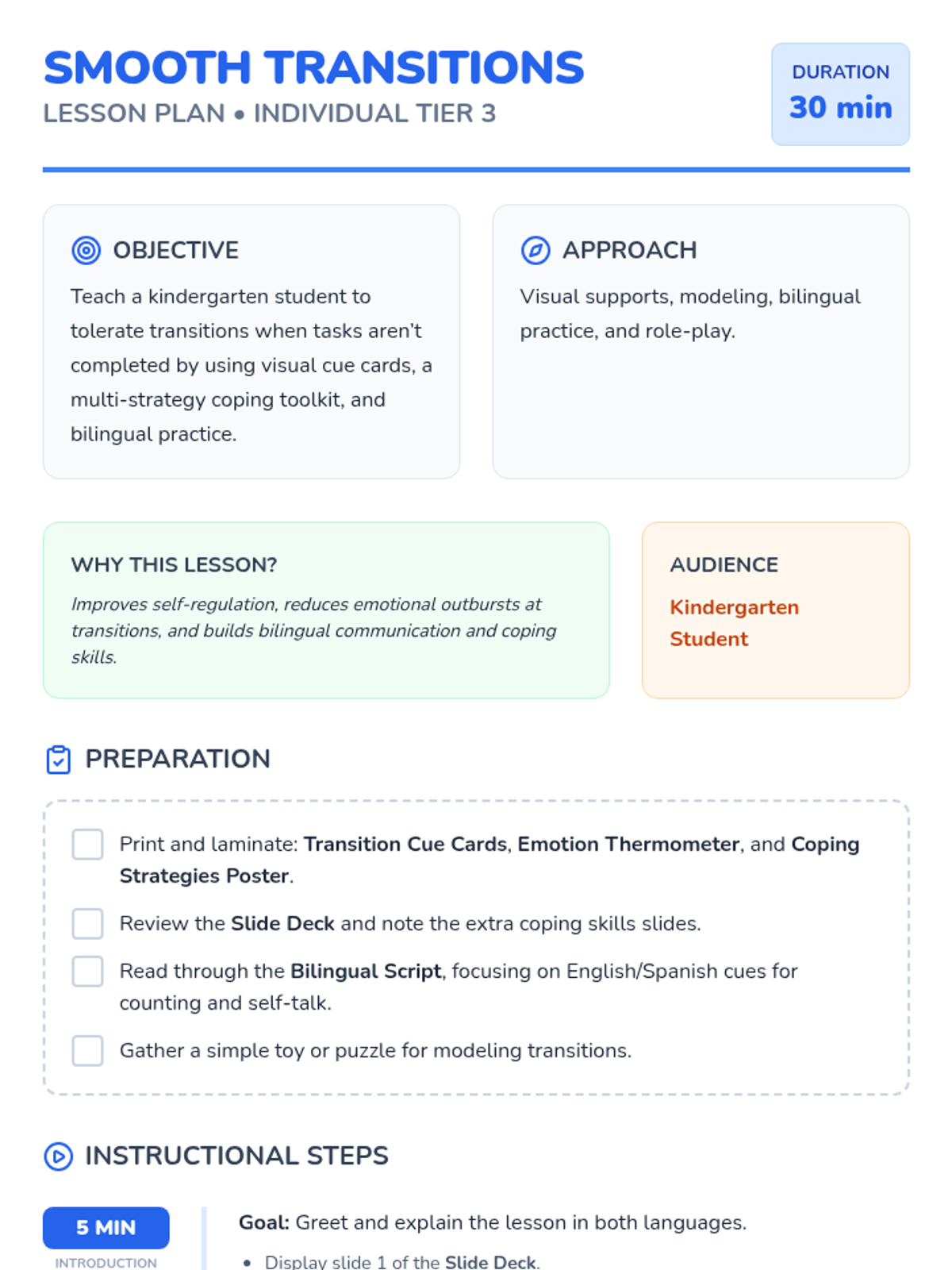 A 30-minute Tier 3 individual lesson for kindergarteners focused on using visual cues and bilingual coping strategies to navigate transitions when tasks are unfinished.