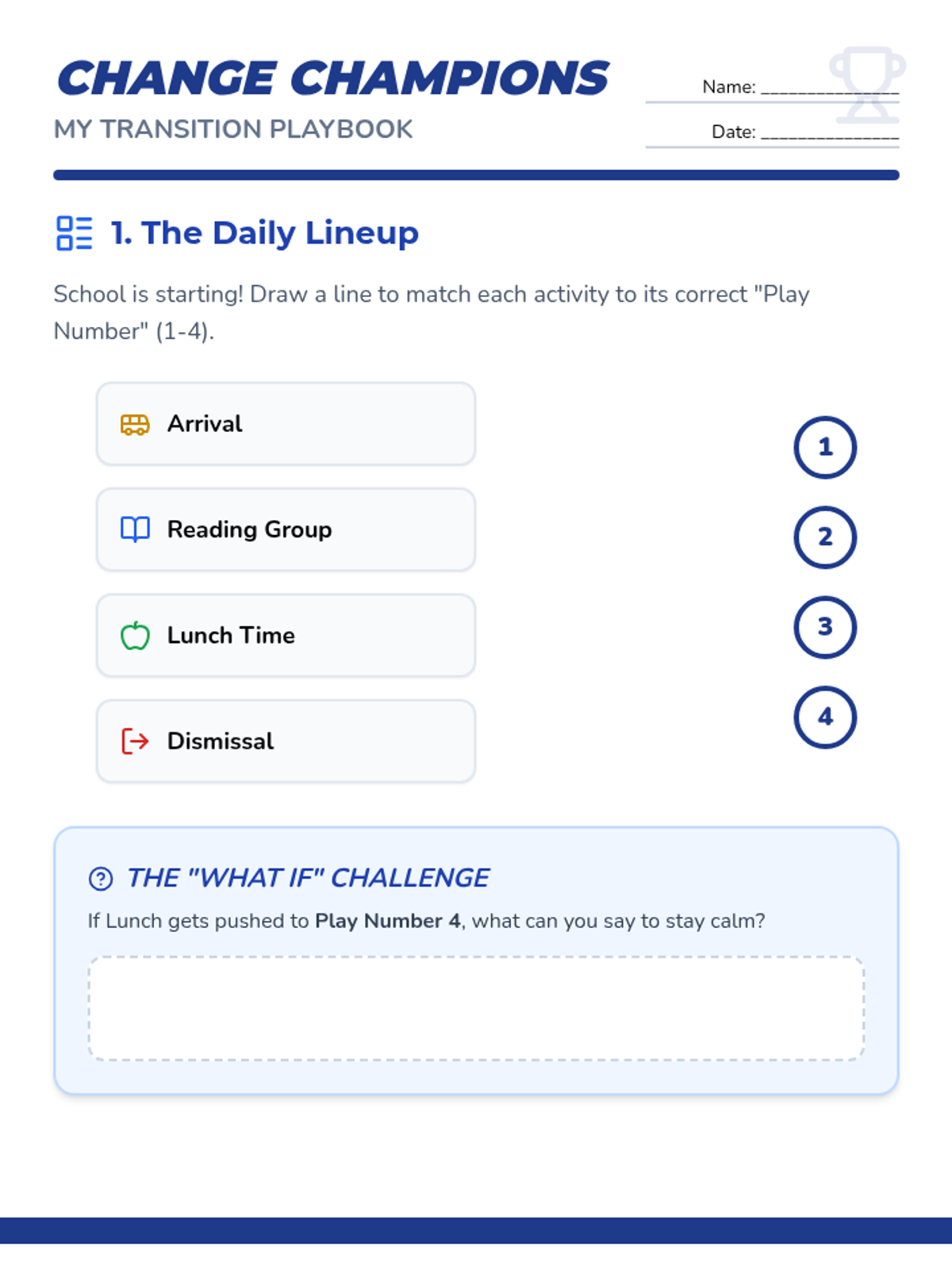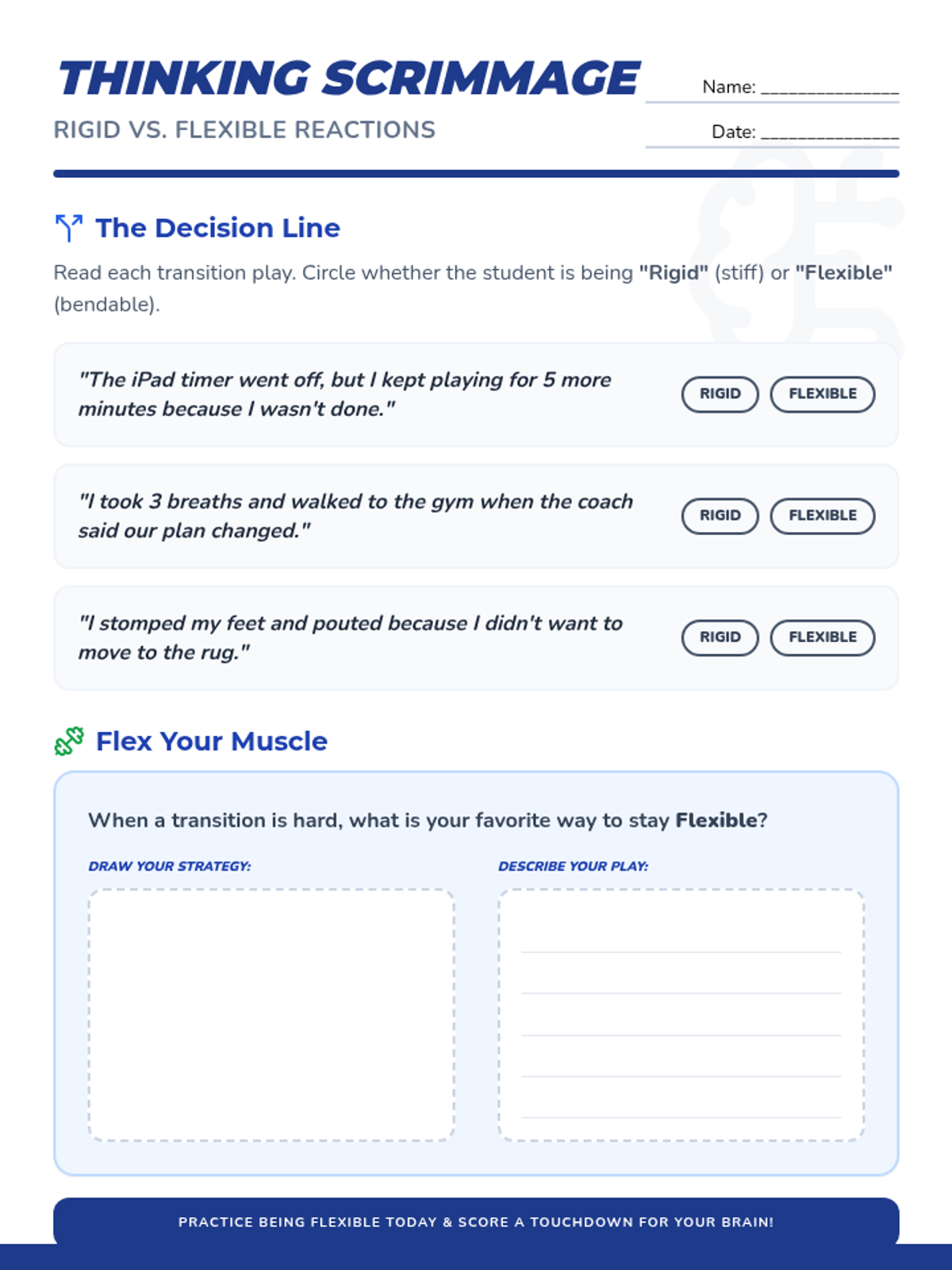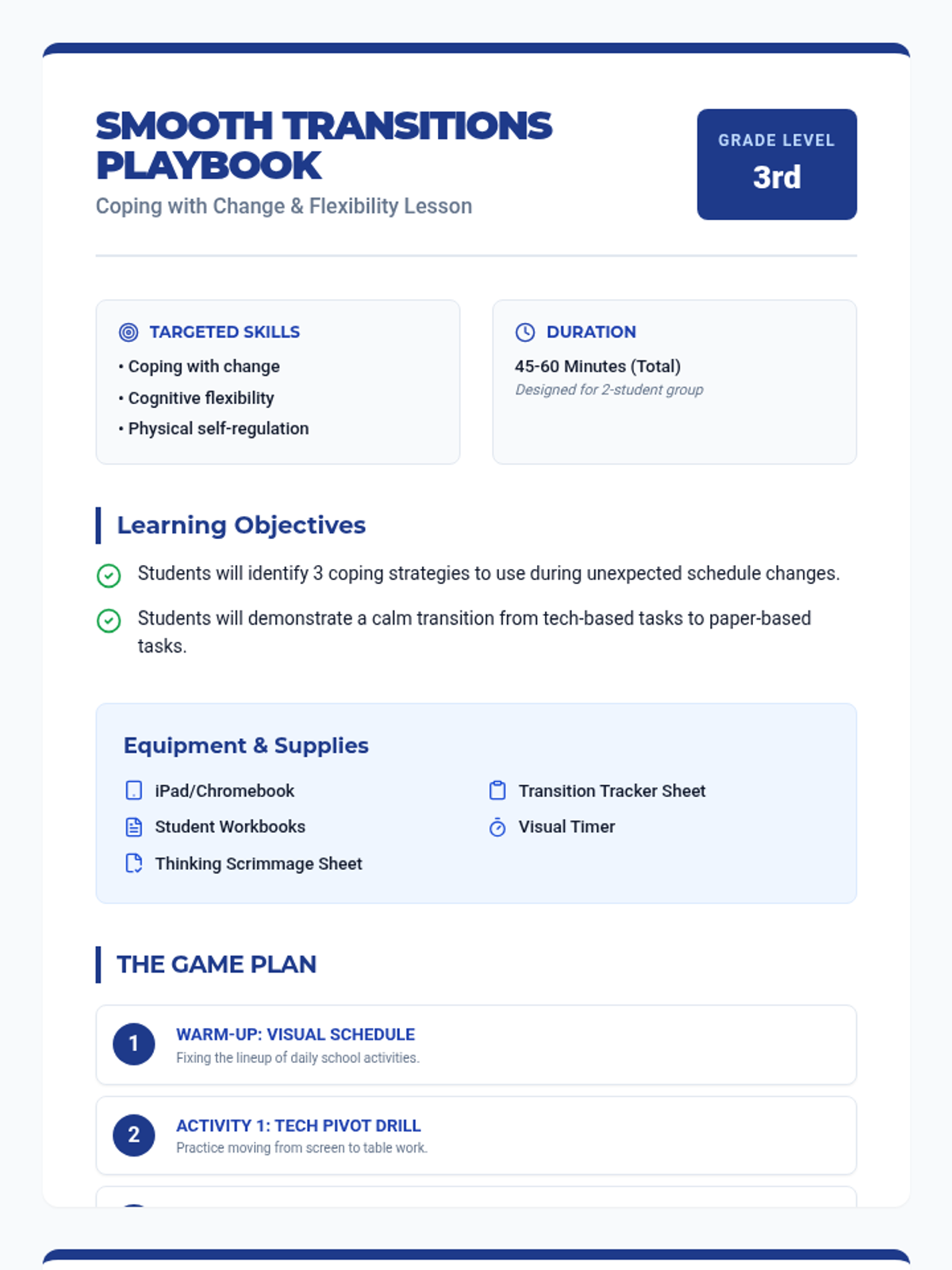 A comprehensive lesson for 3rd-grade students focused on building flexibility and coping skills during transitions between activities, including tech-to-paper shifts and schedule changes.