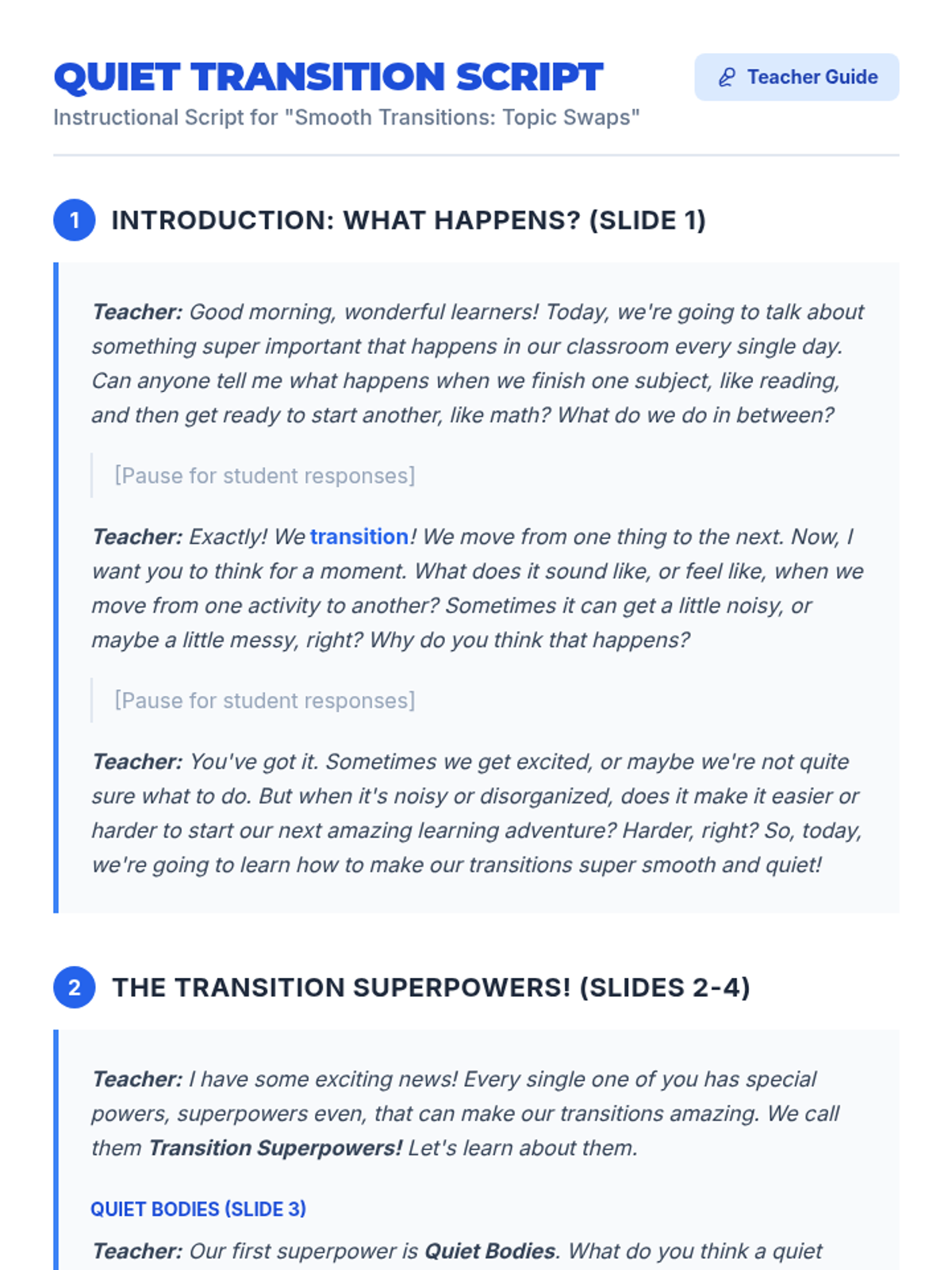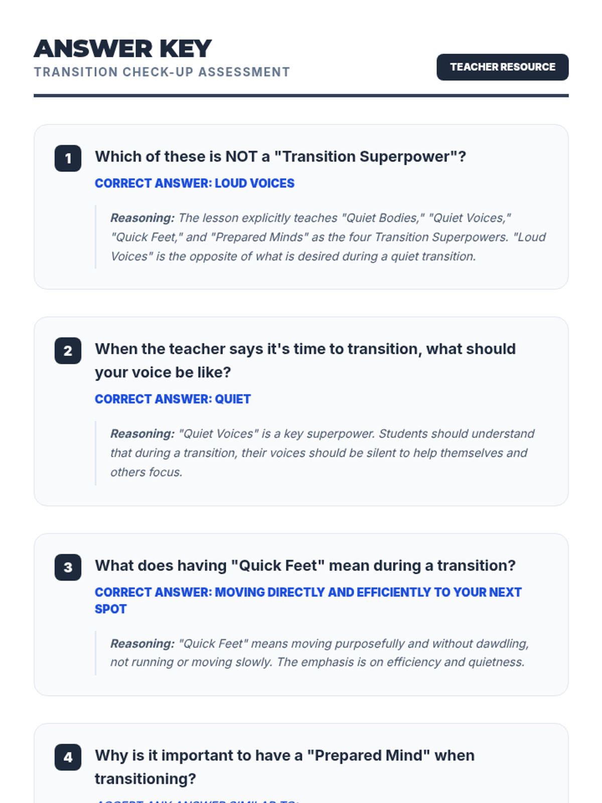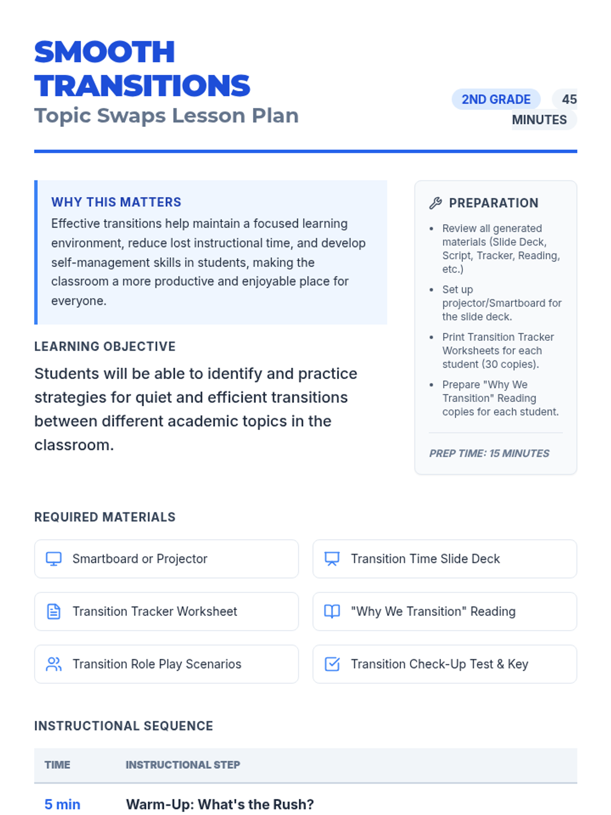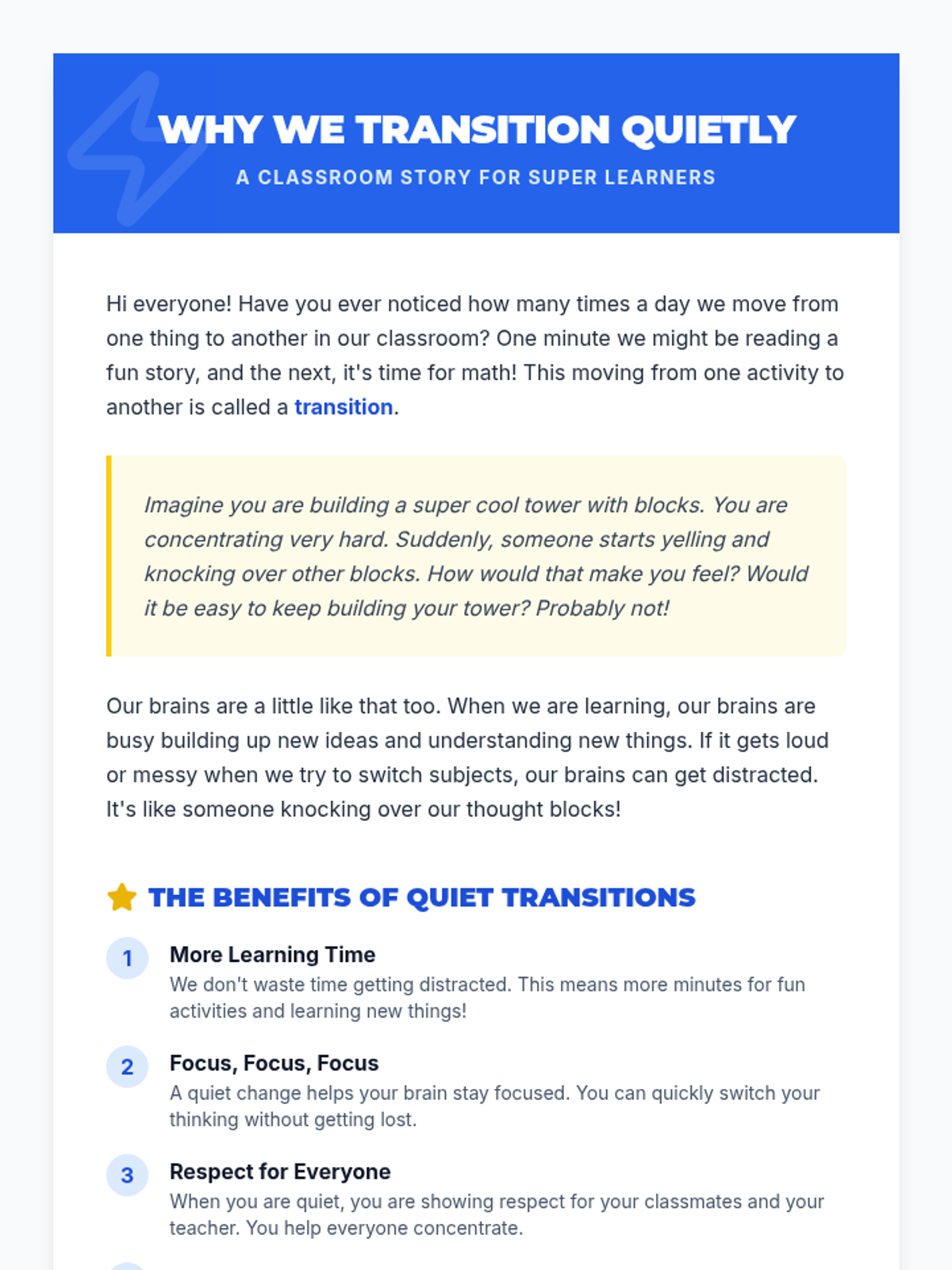 This lesson teaches 2nd graders effective strategies for transitioning between academic topics quietly and respectfully using the concept of 'Transition Superpowers'. It addresses common classroom disruptions through direct instruction, role-play, and self-reflection.