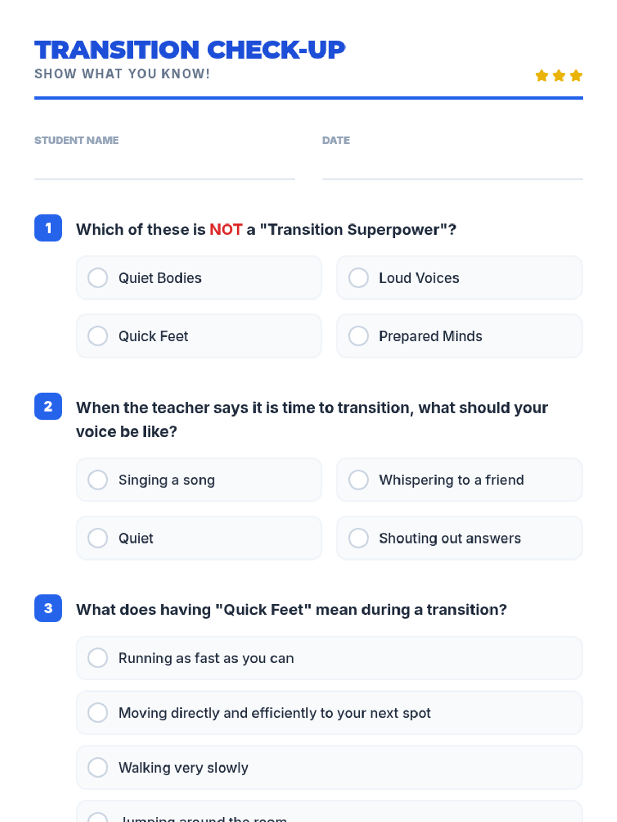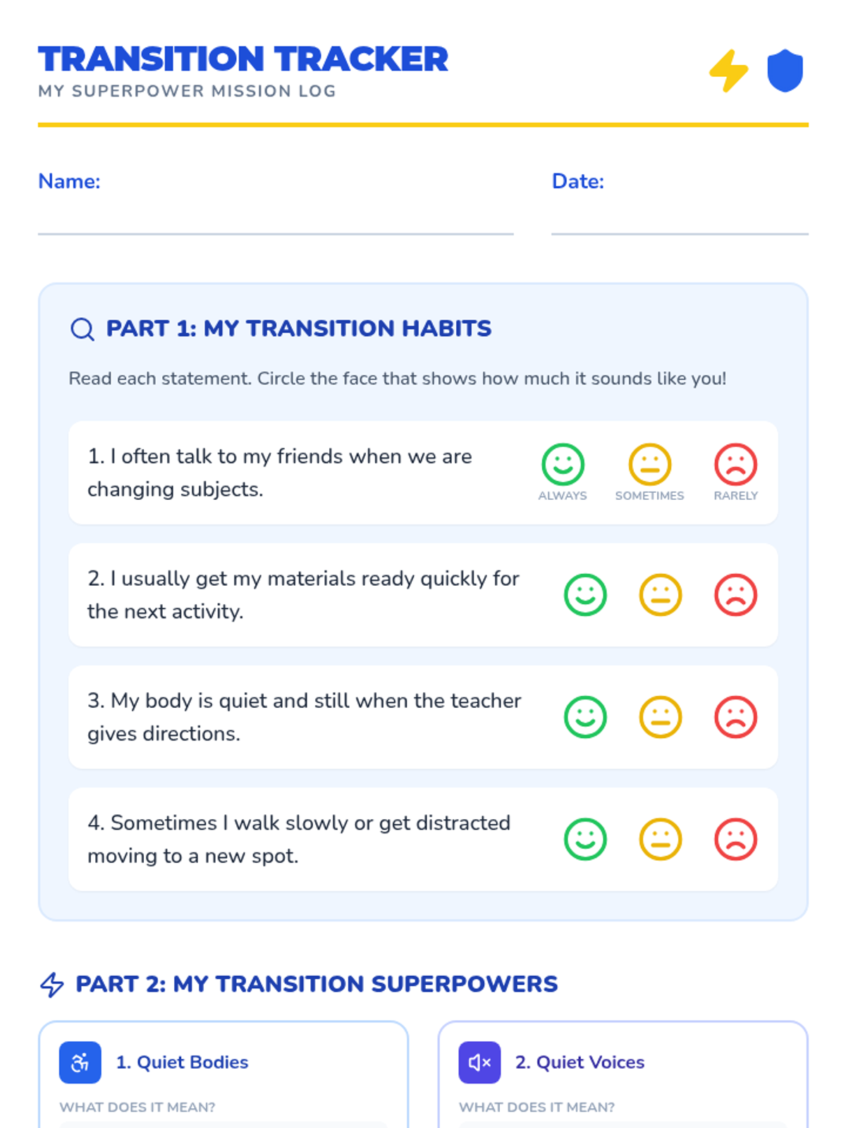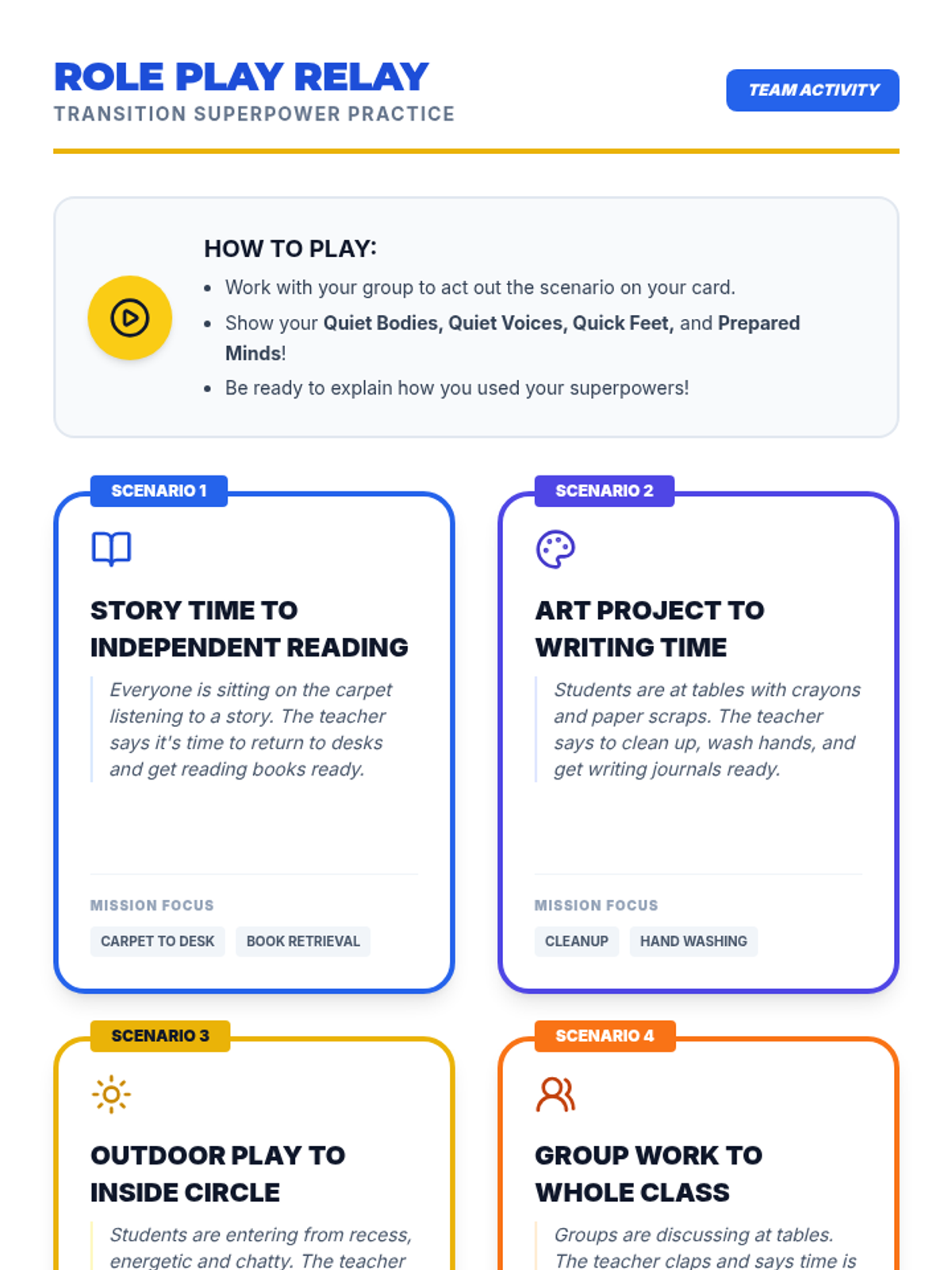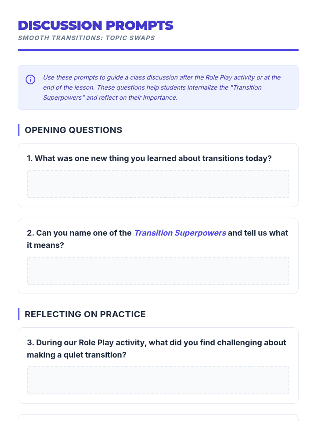 This lesson teaches 2nd graders effective strategies for transitioning between academic topics quietly and respectfully using the concept of 'Transition Superpowers'. It addresses common classroom disruptions through direct instruction, role-play, and self-reflection.
