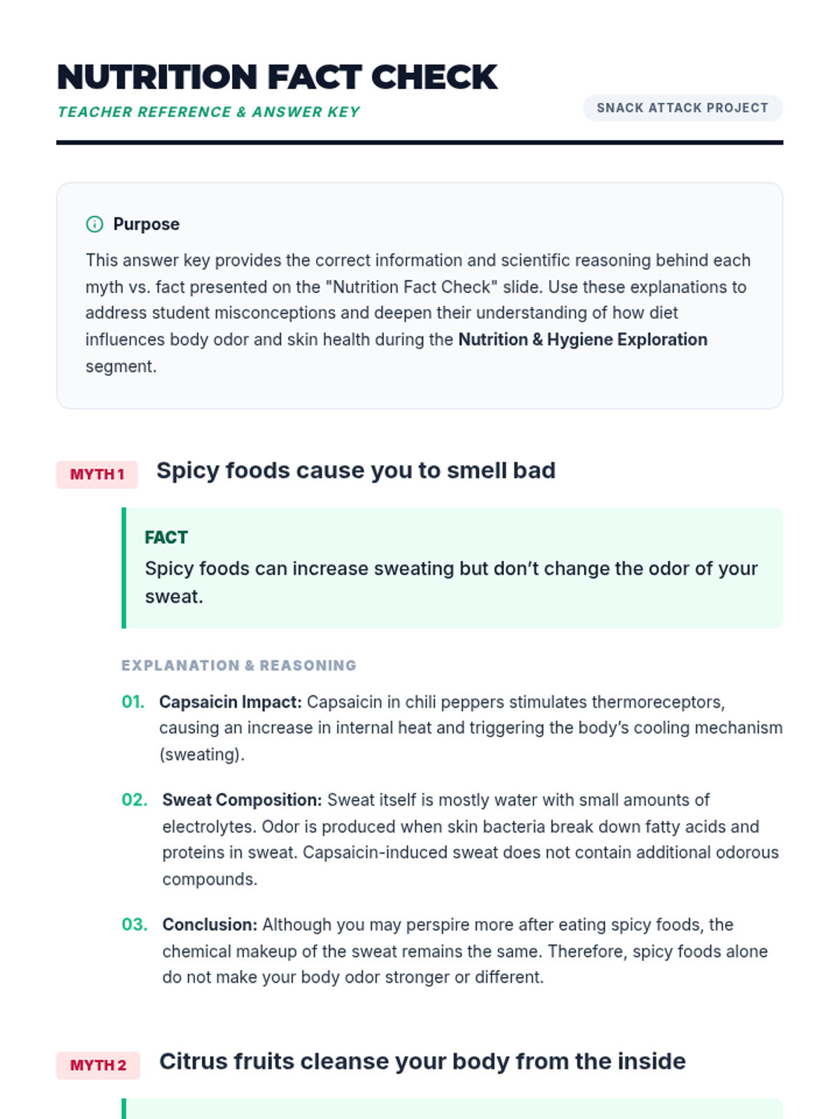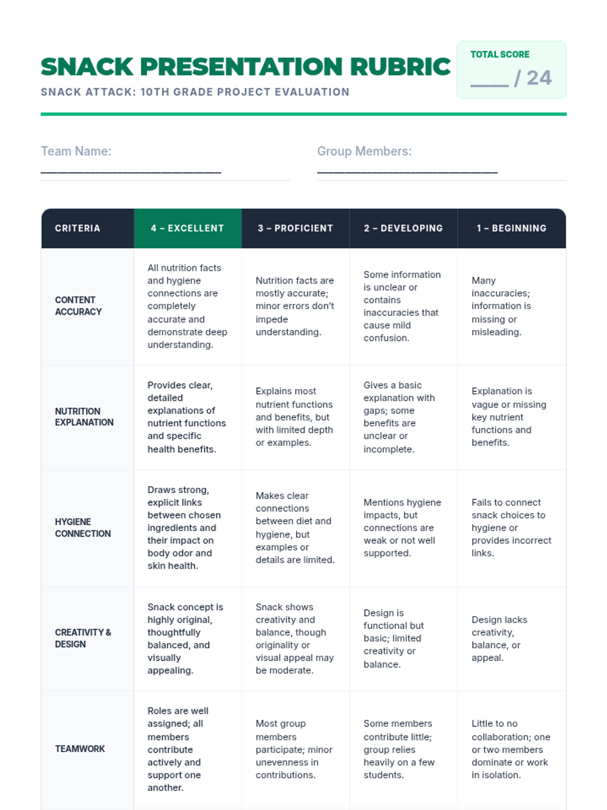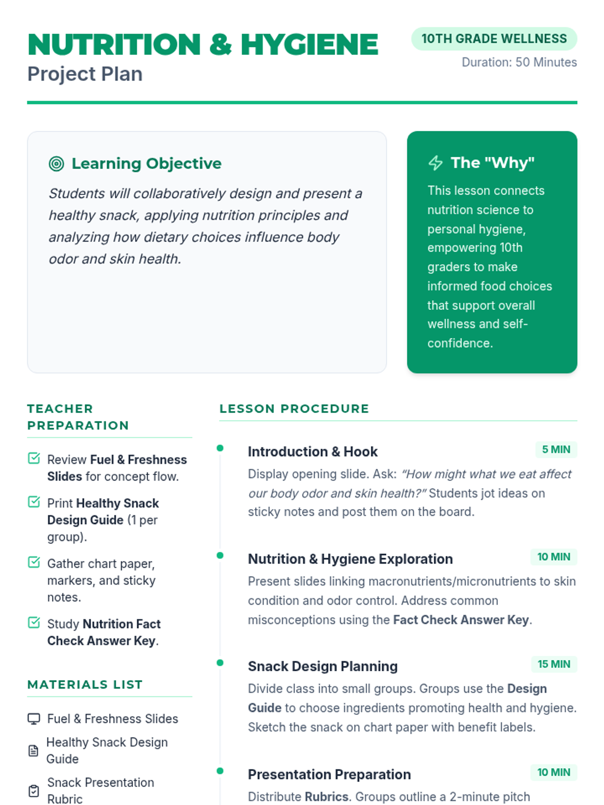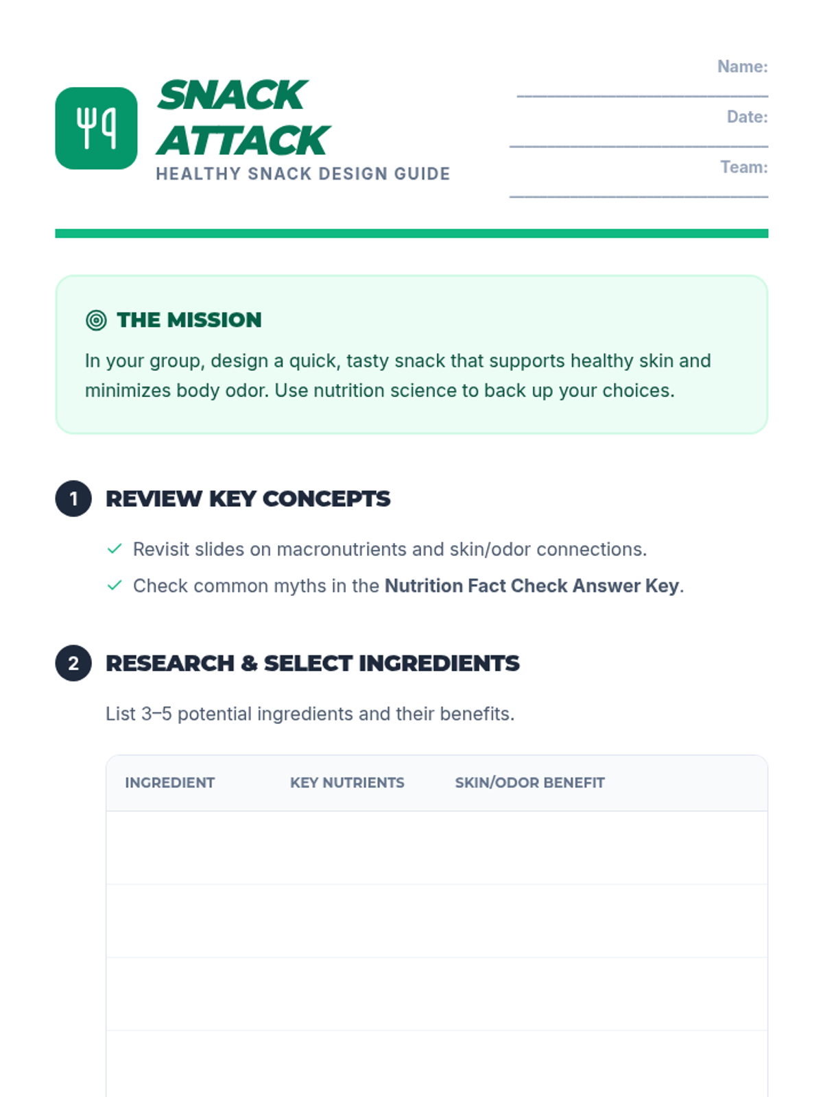 A dynamic project-based lesson for 10th graders connecting nutrition science to personal hygiene, skin health, and body odor through healthy snack design.