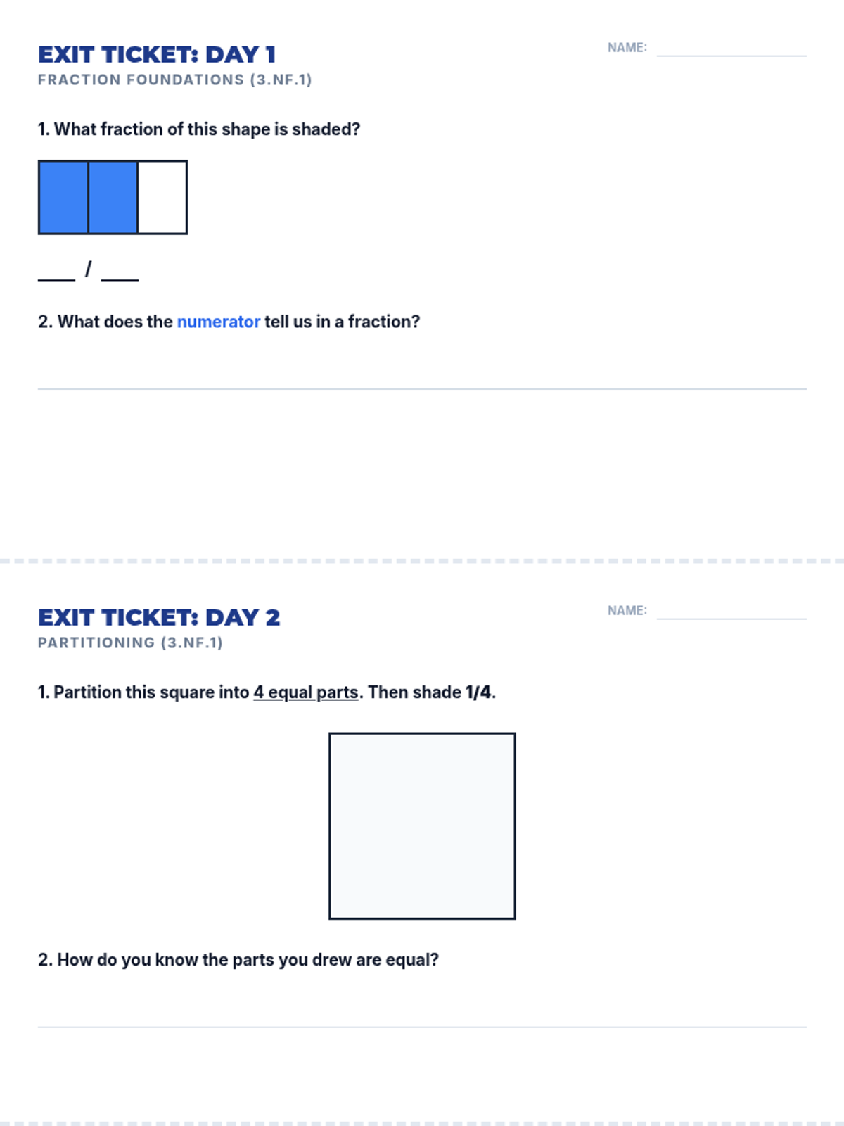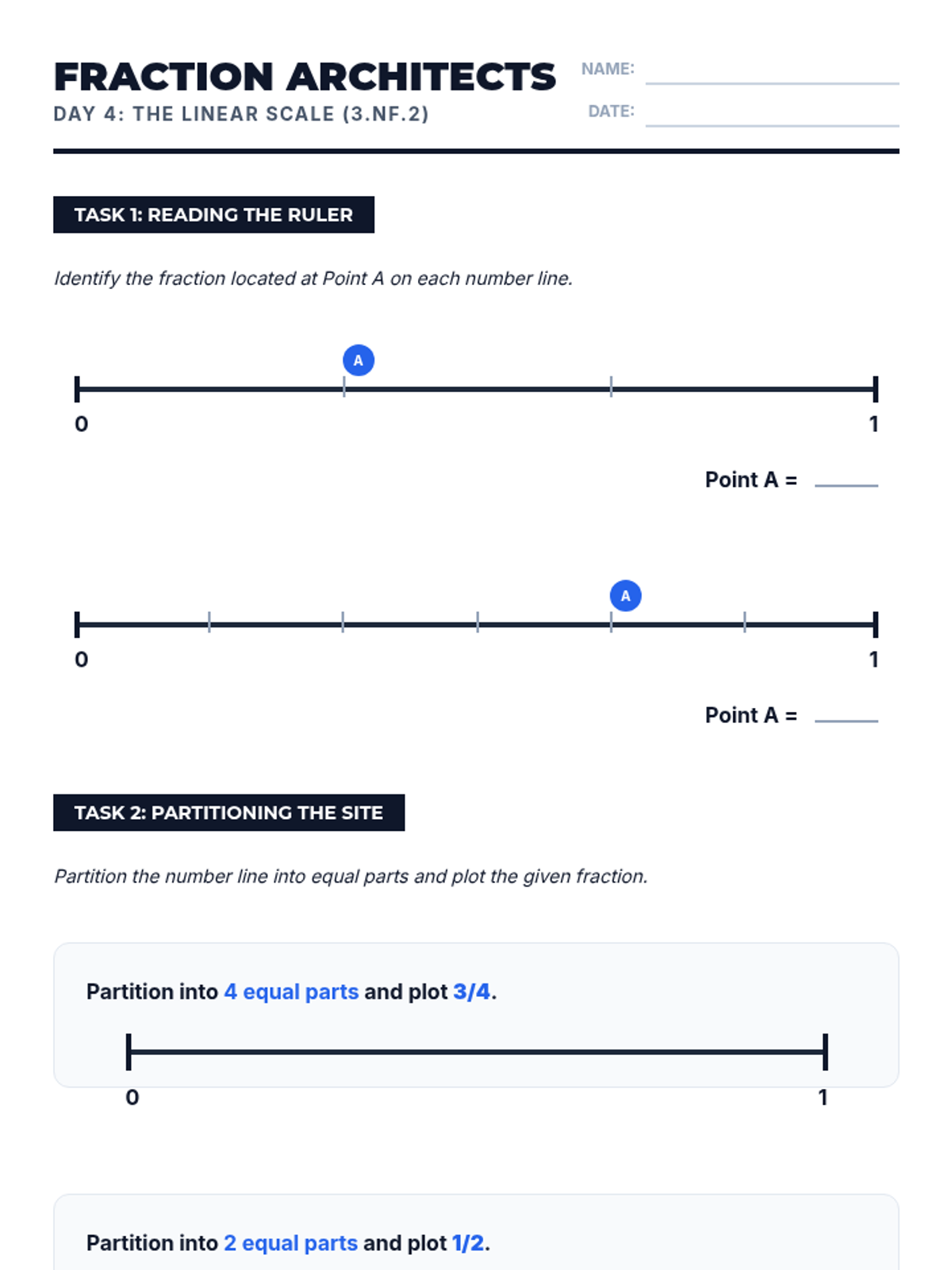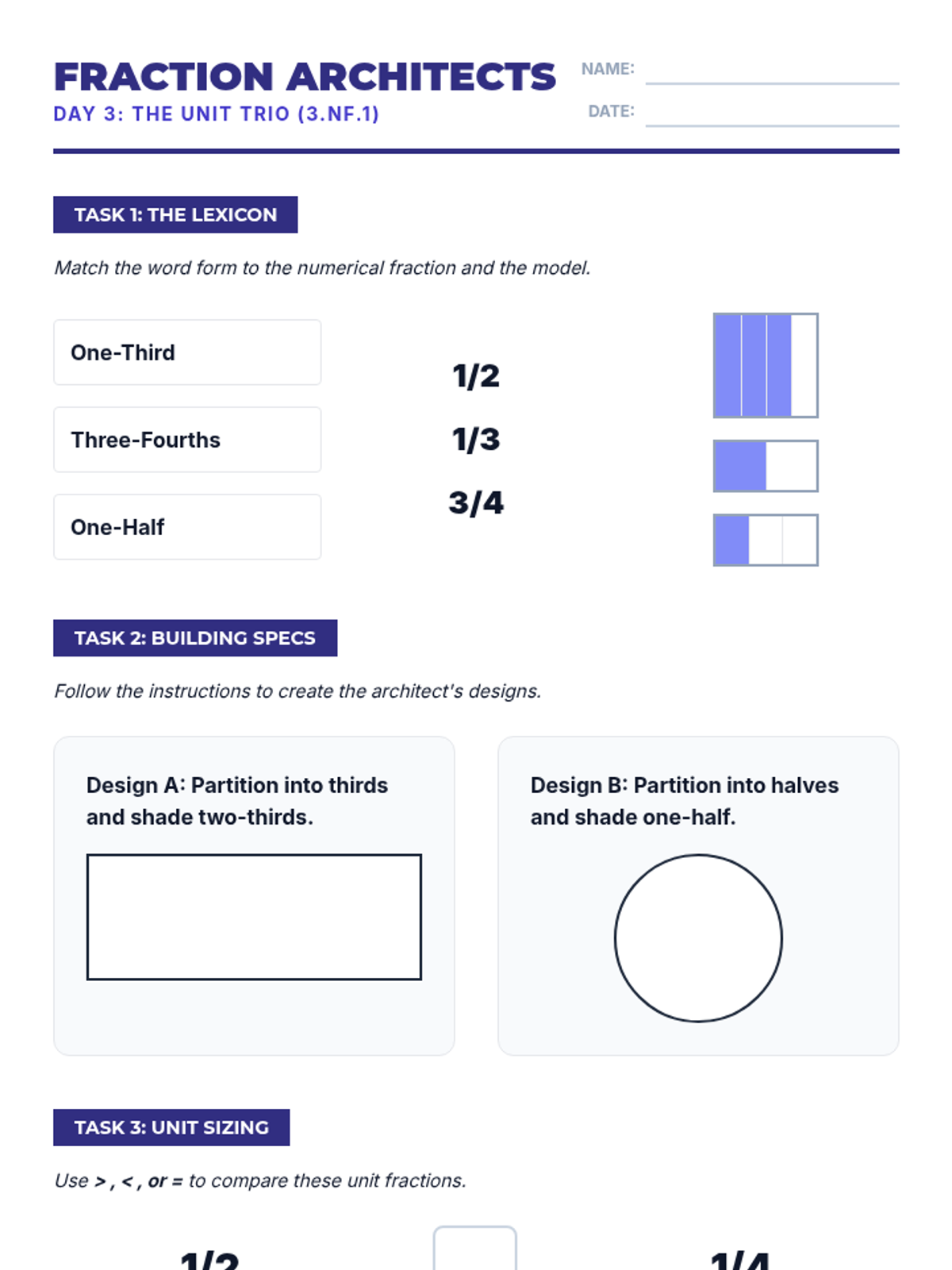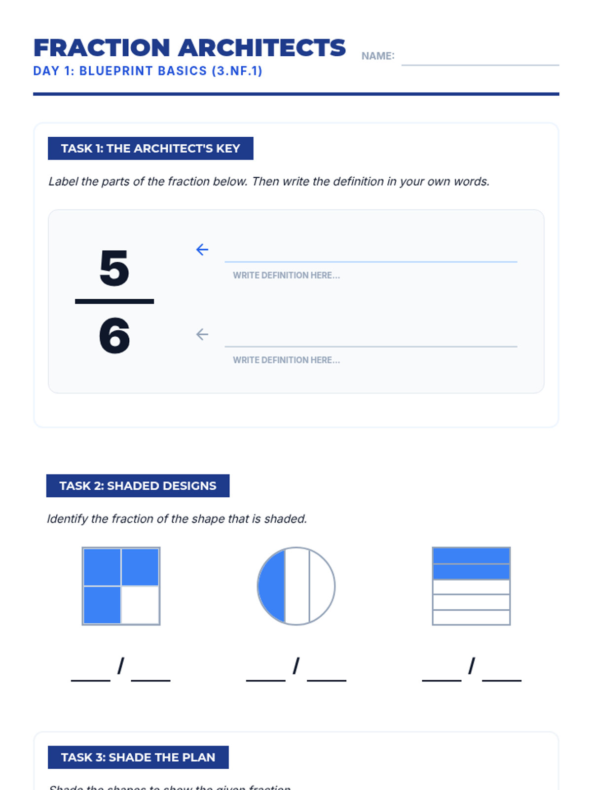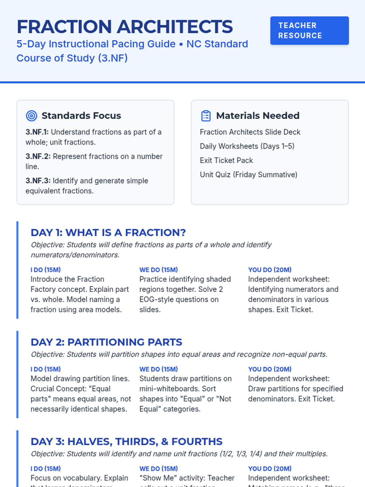 A comprehensive 5-day lesson covering the basics of fractions, partitioning shapes, unit fractions, number lines, and equivalent fractions using the I Do, We Do, You Do model.