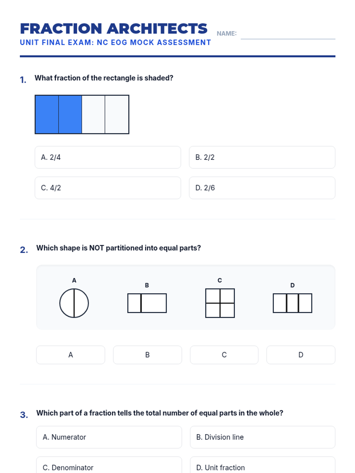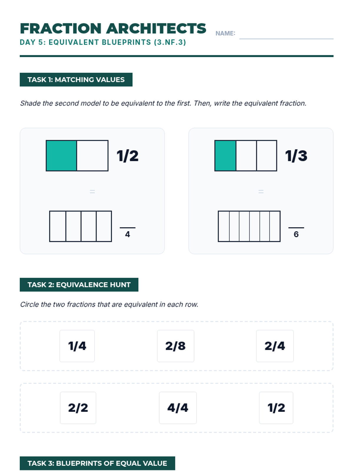 Daily warm-ups and practice for equivalent fractions, whole numbers, and comparisons designed to prepare students for EOG-style questions.