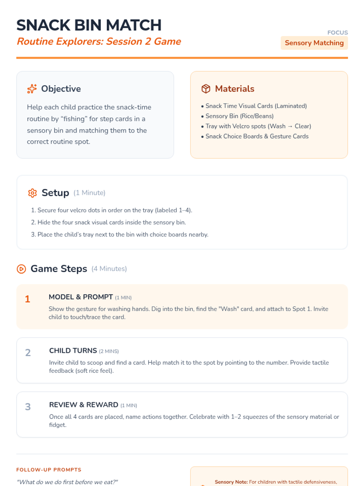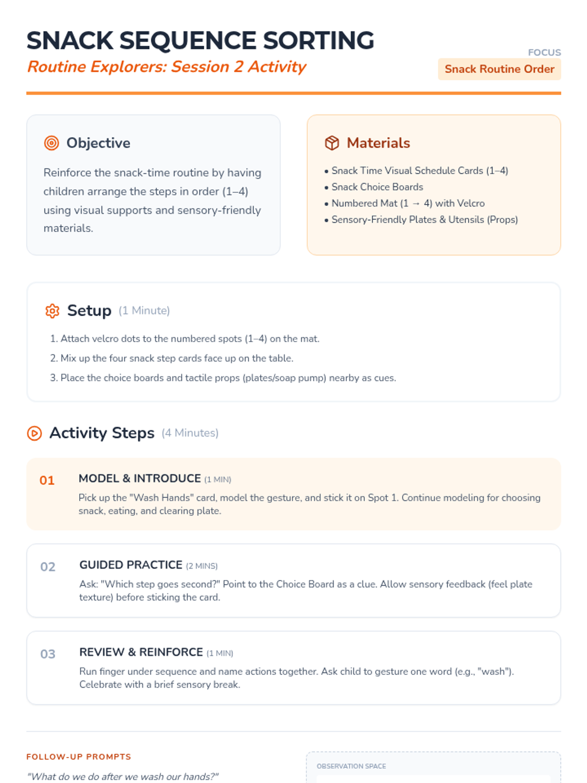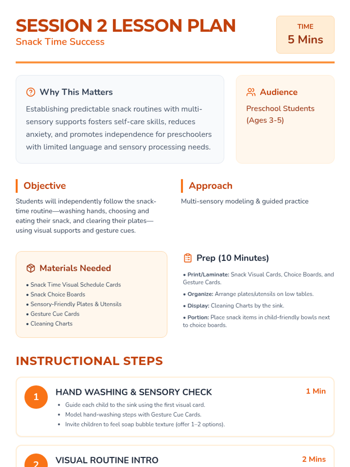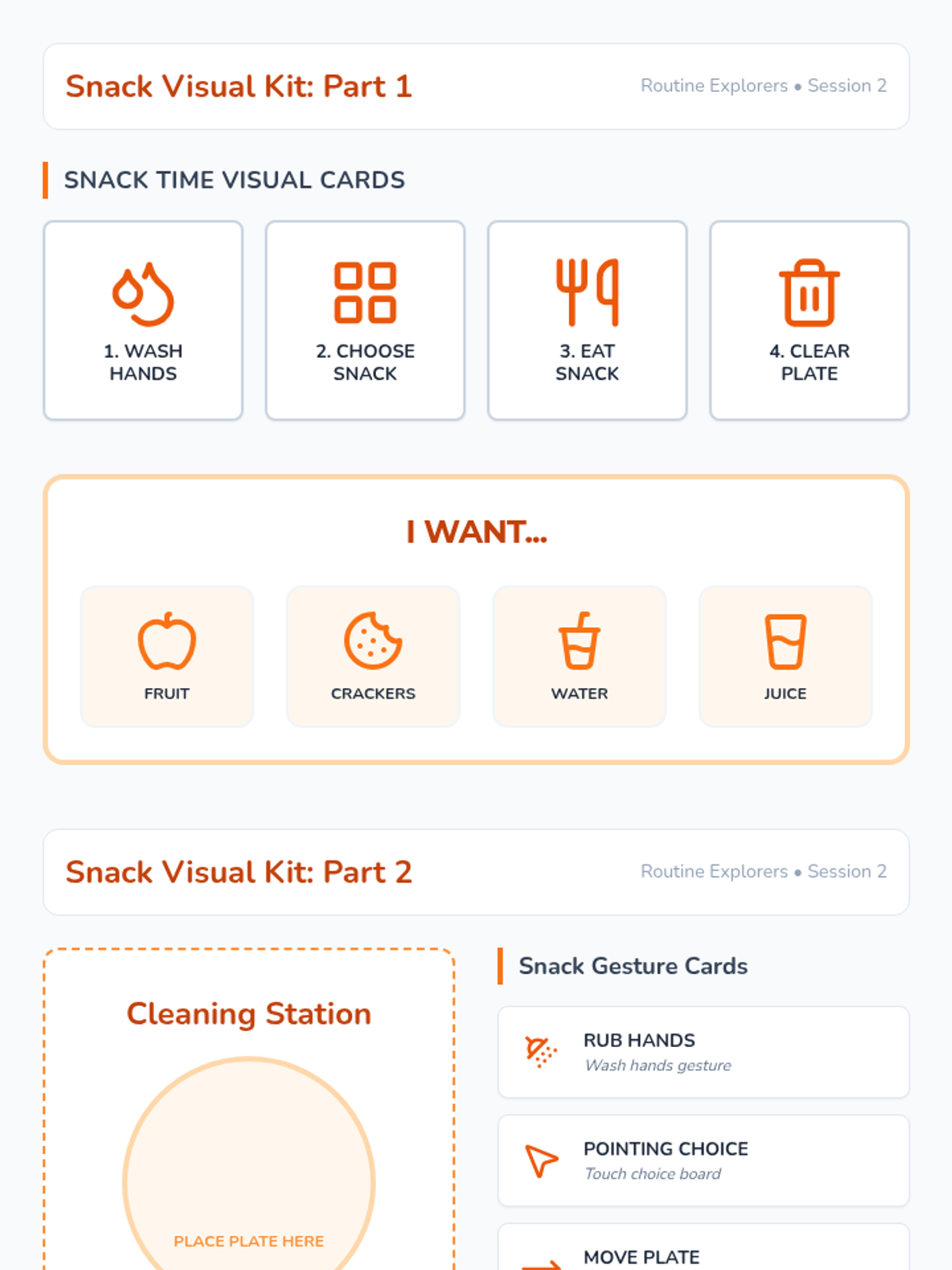 Students practice the multi-step snack routine, including hand washing, making choices, and cleaning up, using visual boards and tactile props.