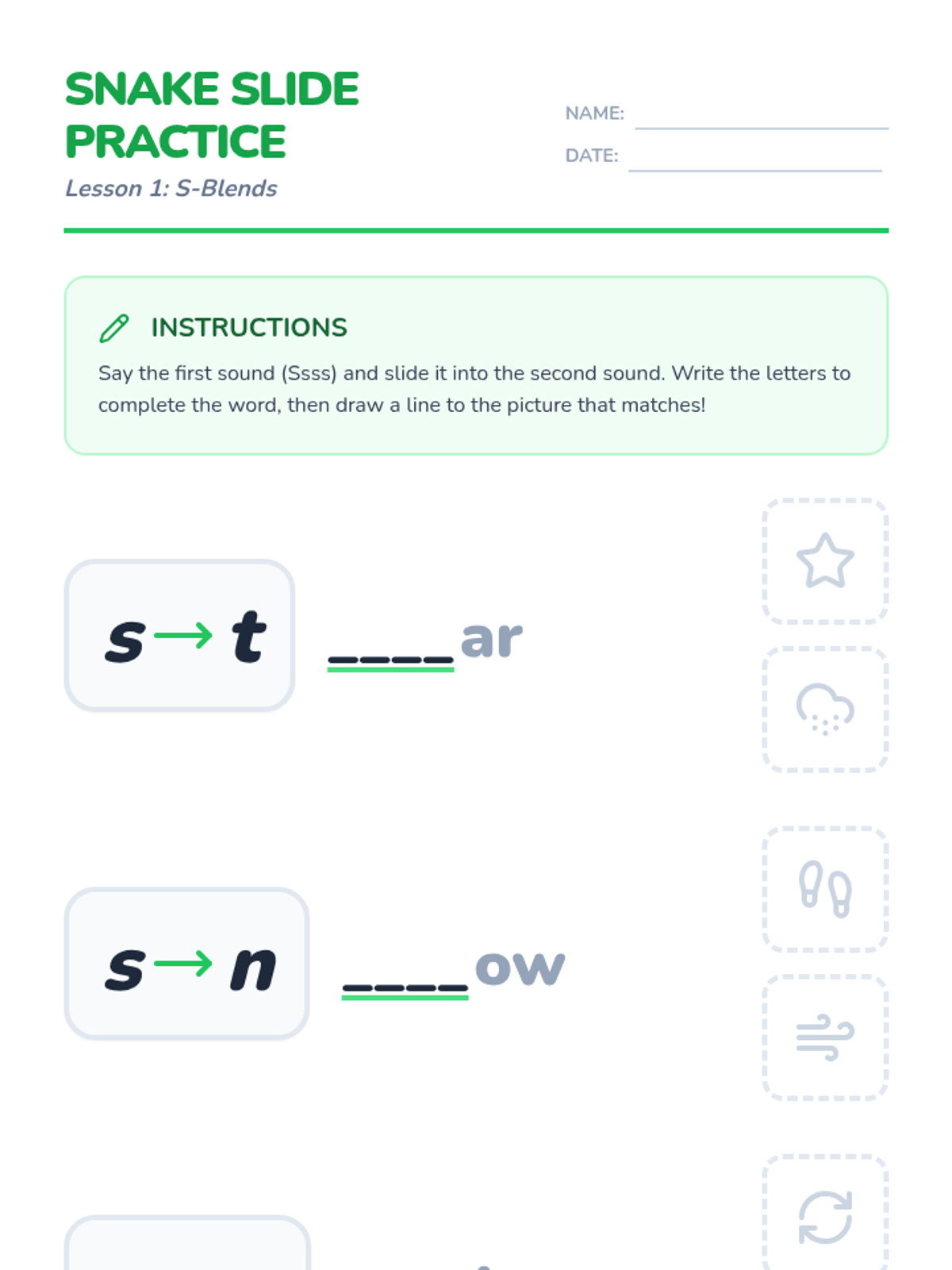Students learn to slide the 's' sound into other consonants (st, sp, sn, sm) without stopping. They engage in 'slide' activities where they physically move to represent the blending of two distinct sounds.