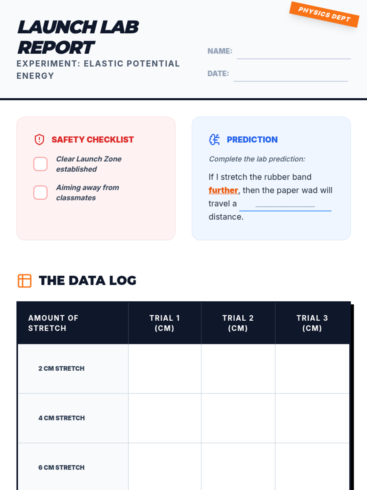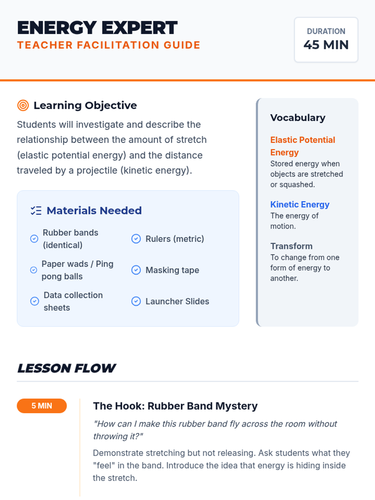 A high-energy lesson exploring how stretching objects like rubber bands stores elastic potential energy that transforms into kinetic energy, featuring a hands-on launcher experiment.