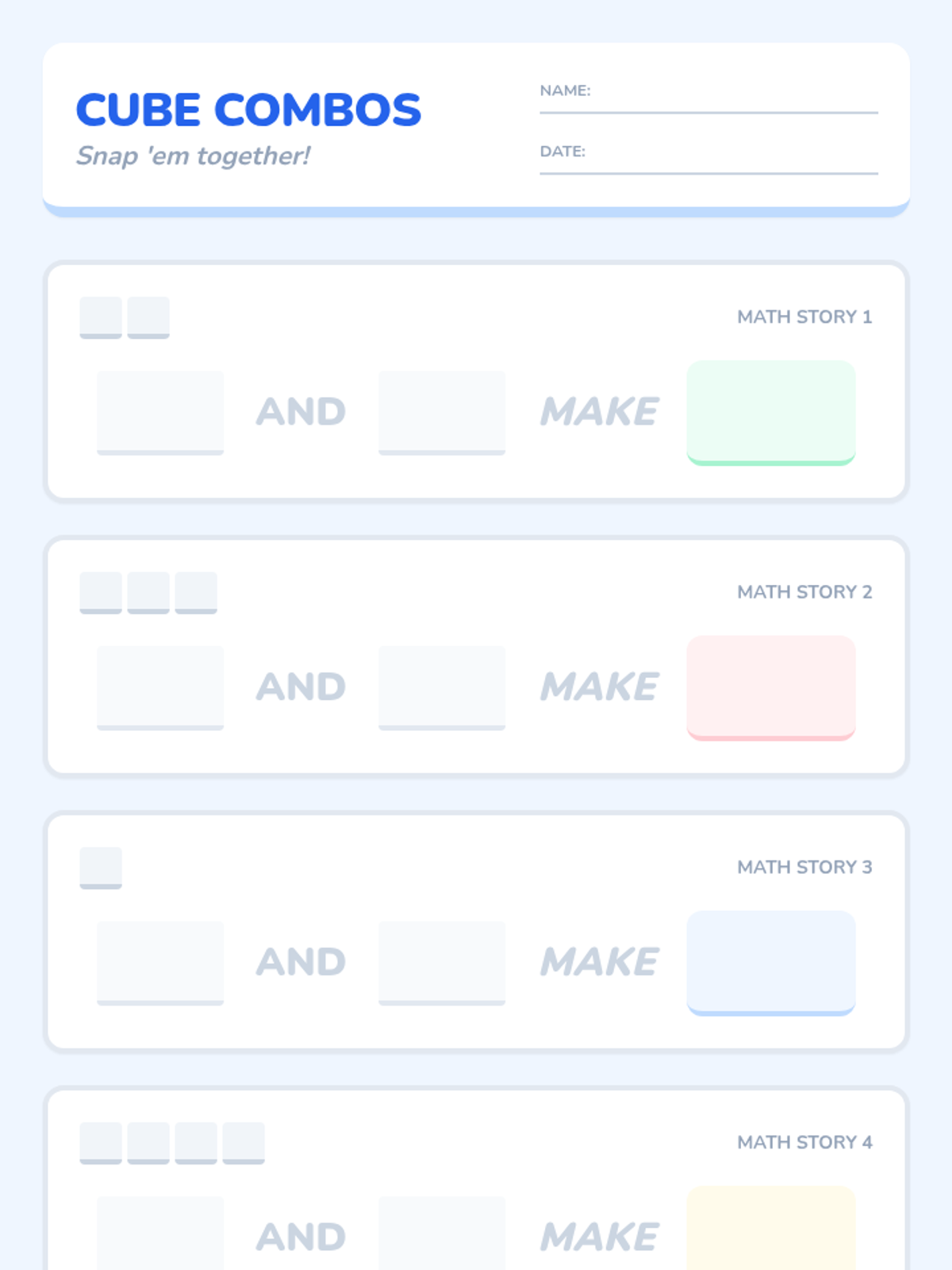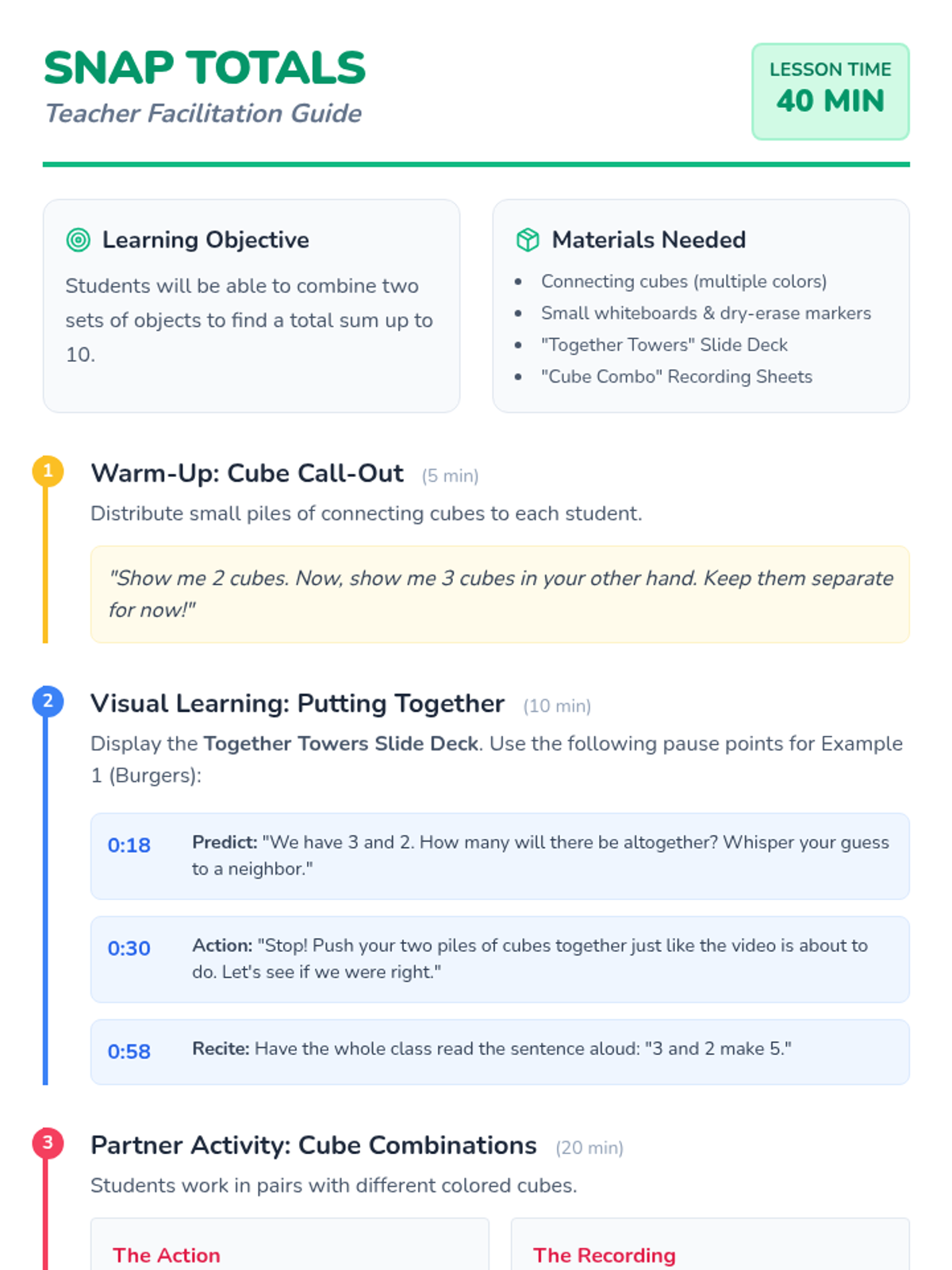 A foundational addition lesson for Kindergarten focused on the 'putting together' concept using connecting cubes and visual models to find sums up to 10.