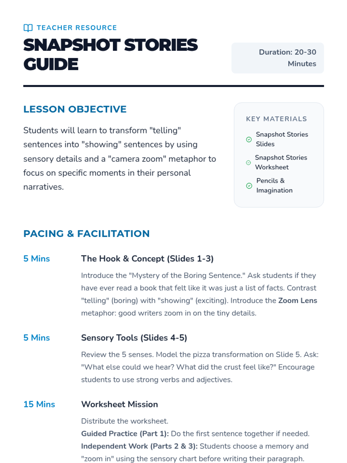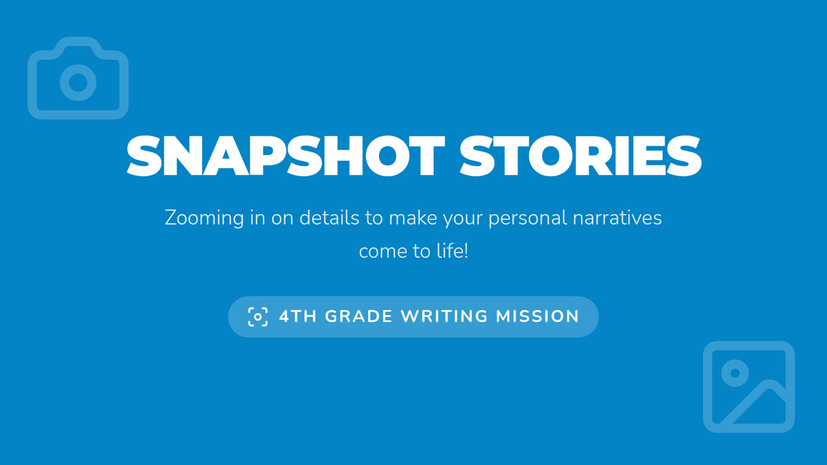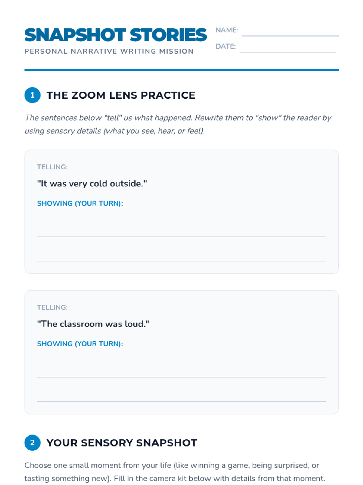 A quick, high-impact lesson for 4th graders to improve their personal narratives by using sensory details and 'show, don't tell' techniques. Students will use a 'camera lens' metaphor to zoom in on specific moments.