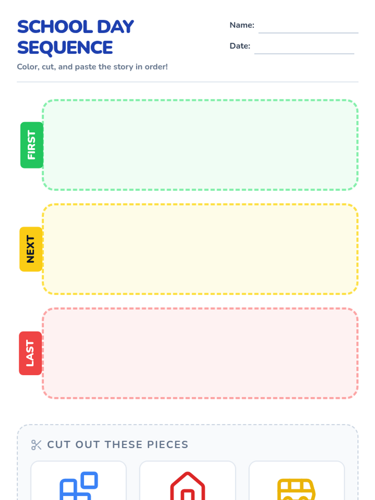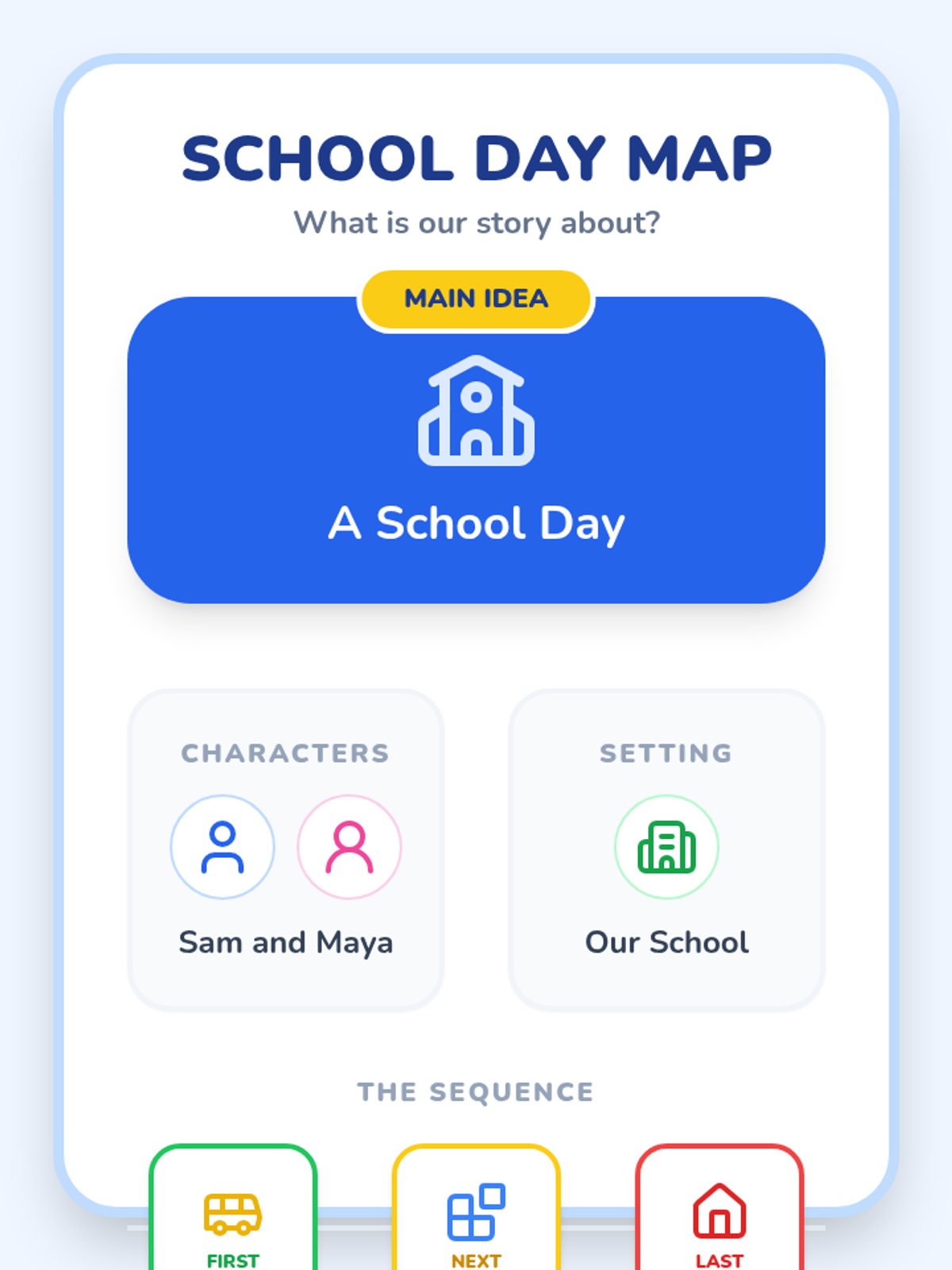 Review the entire school day sequence to identify the main idea and demonstrate overall comprehension.