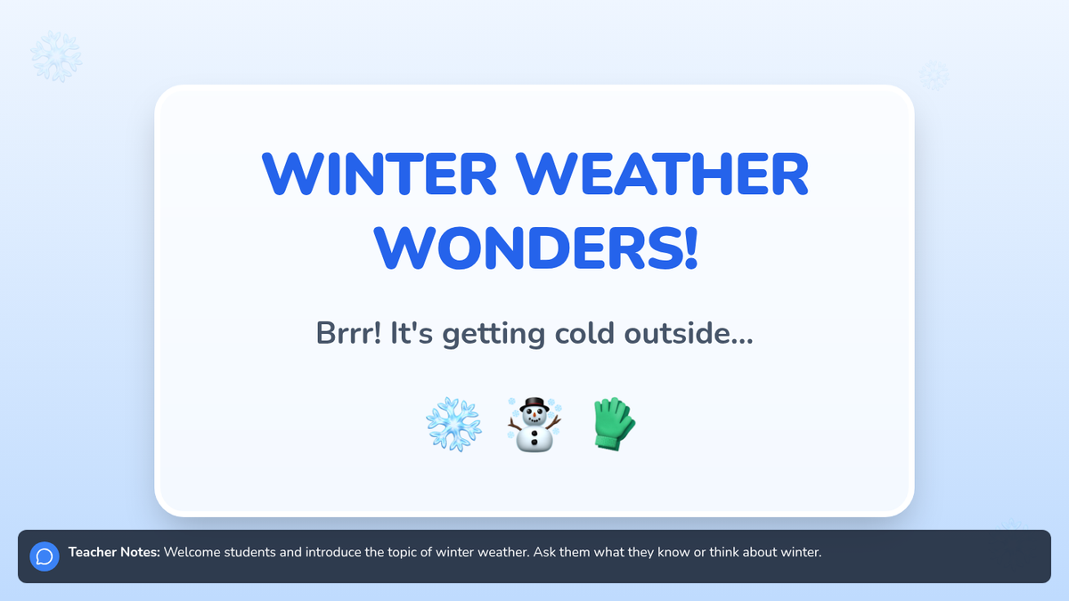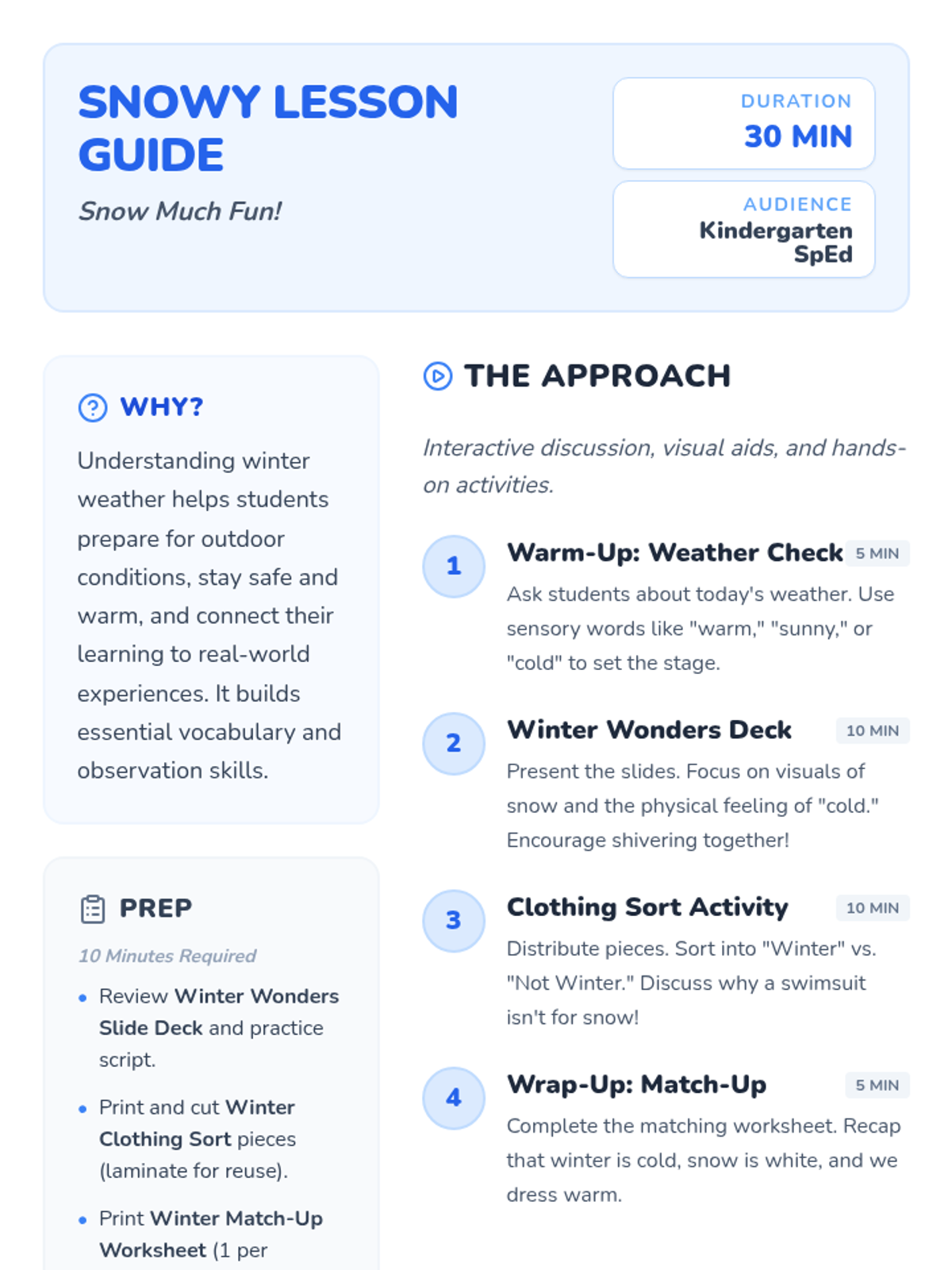 A 30-minute introductory lesson for kindergarten special education students about winter weather, snow, and appropriate clothing using interactive slides, a sorting activity, and a matching worksheet.