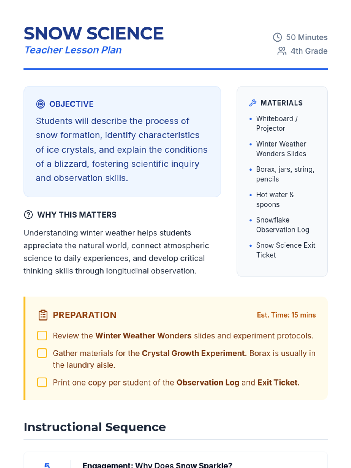Explore the science behind winter phenomena like snow formation, ice crystals, and blizzards. This lesson engages 4th Grade students with hands-on science and critical thinking about the natural world.