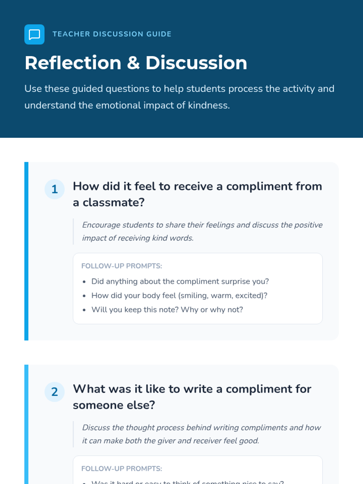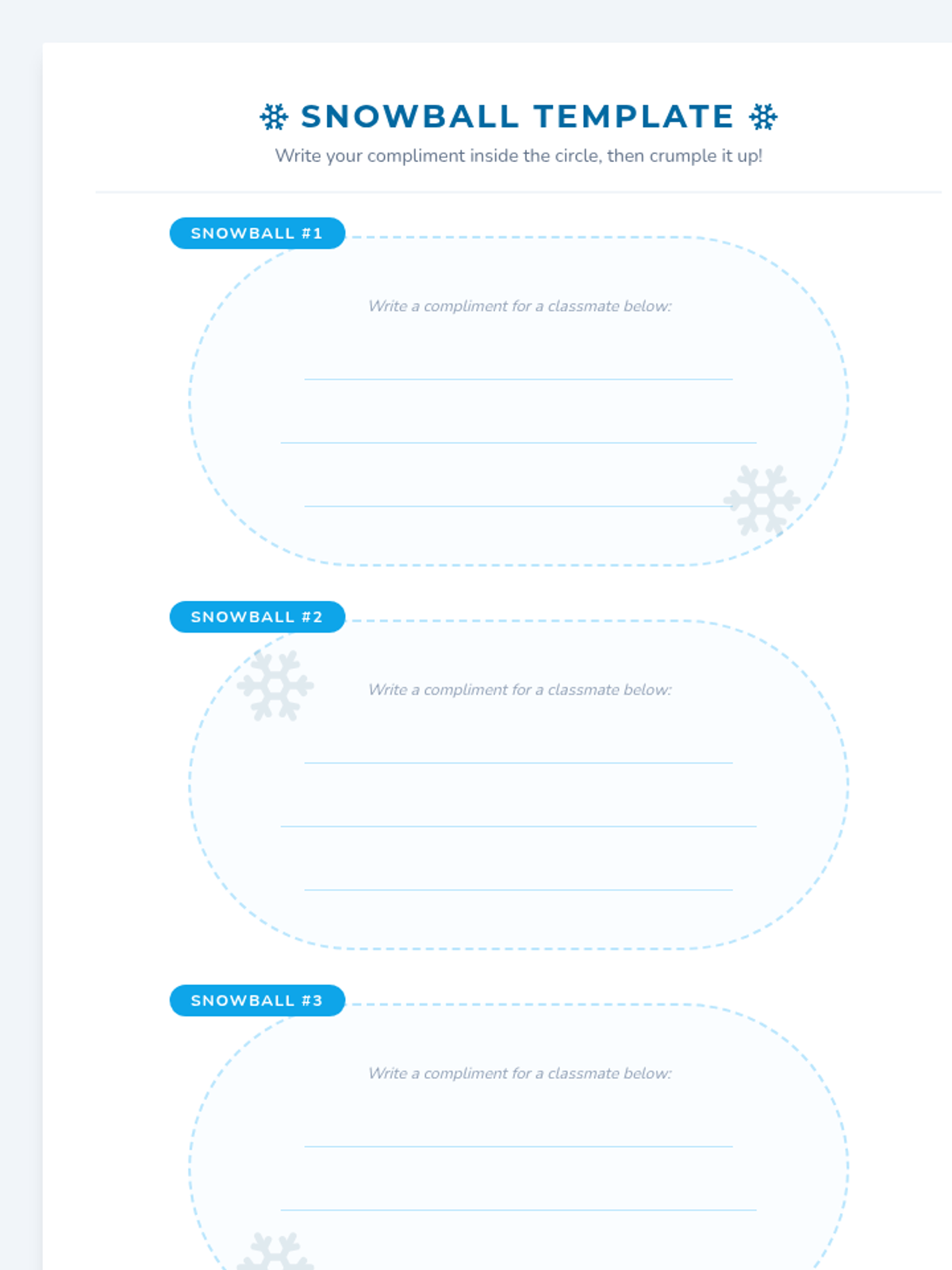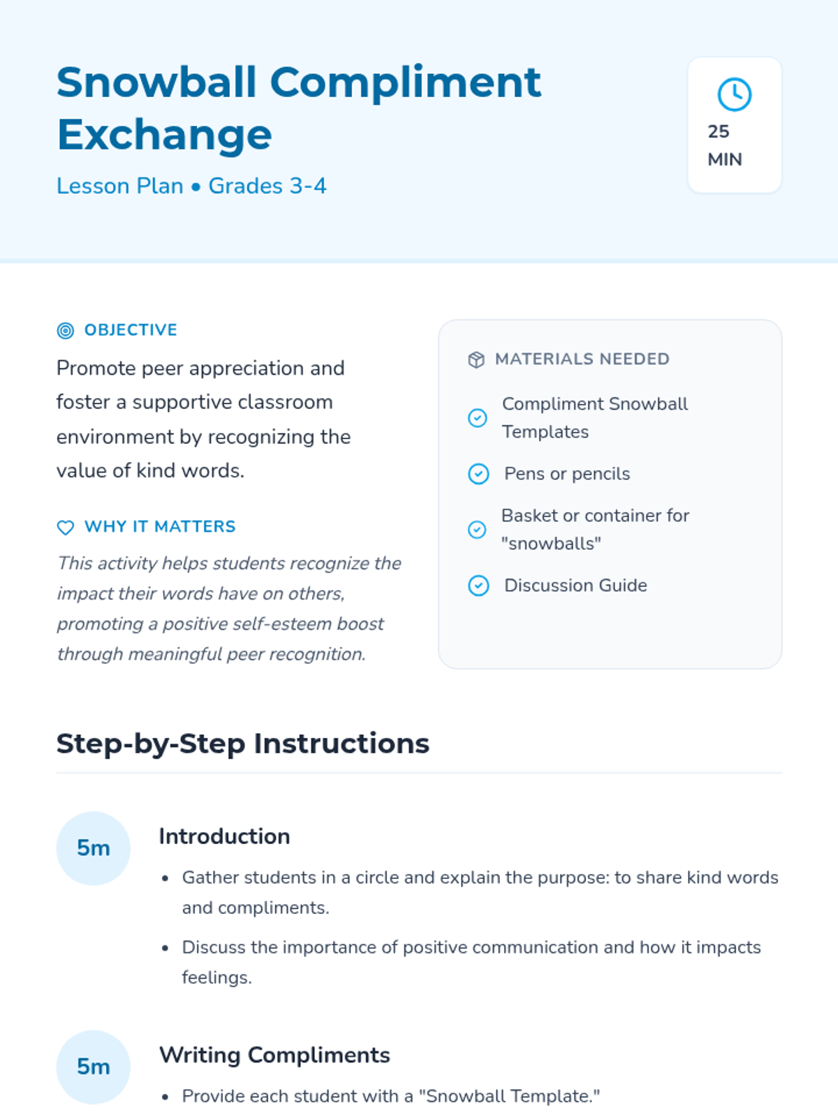 A fun, high-energy activity where students write kind notes, have a 'snowball fight', and read their compliments to boost self-esteem and peer appreciation.