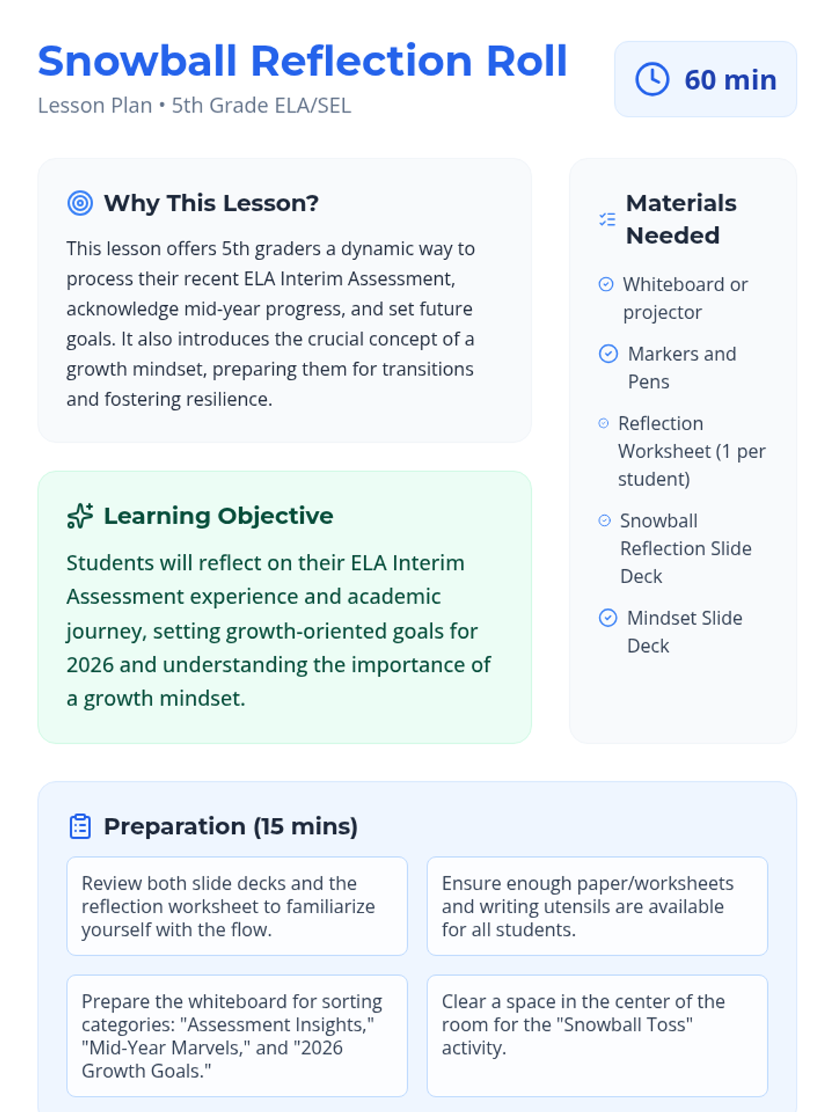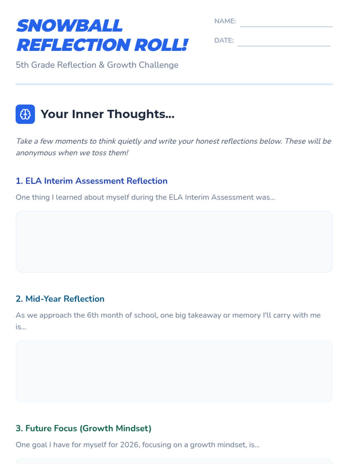 A fun, interactive 60-minute reflection lesson for 5th graders to process their ELA Interim Assessment, celebrate mid-year milestones, and set growth mindset goals for 2026 using a 'snowball fight' activity.