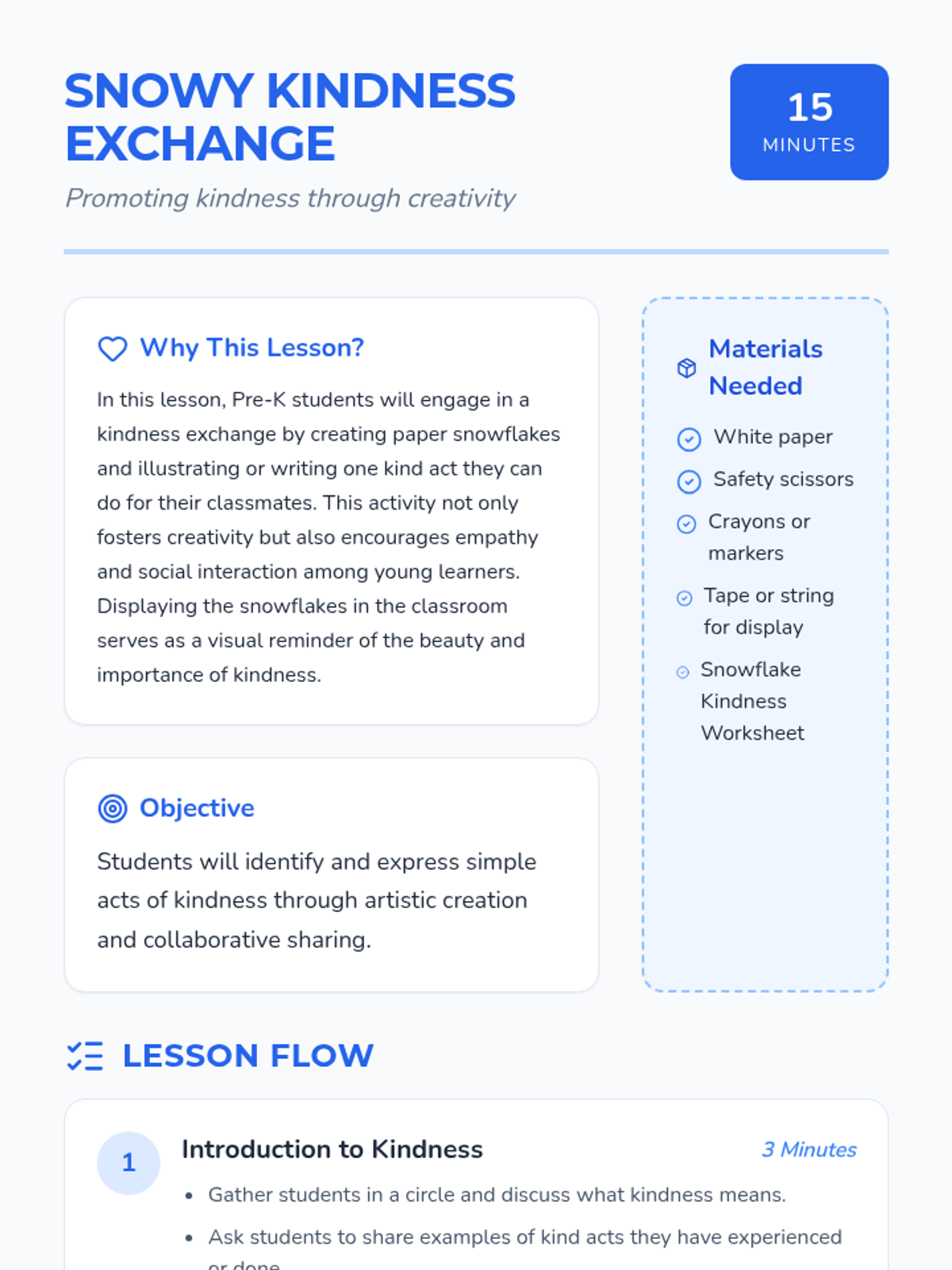 A heartwarming Pre-K lesson where students explore empathy and social interaction by creating decorative paper snowflakes that illustrate acts of kindness. This lesson fosters a positive classroom culture through creative expression and collaborative display.