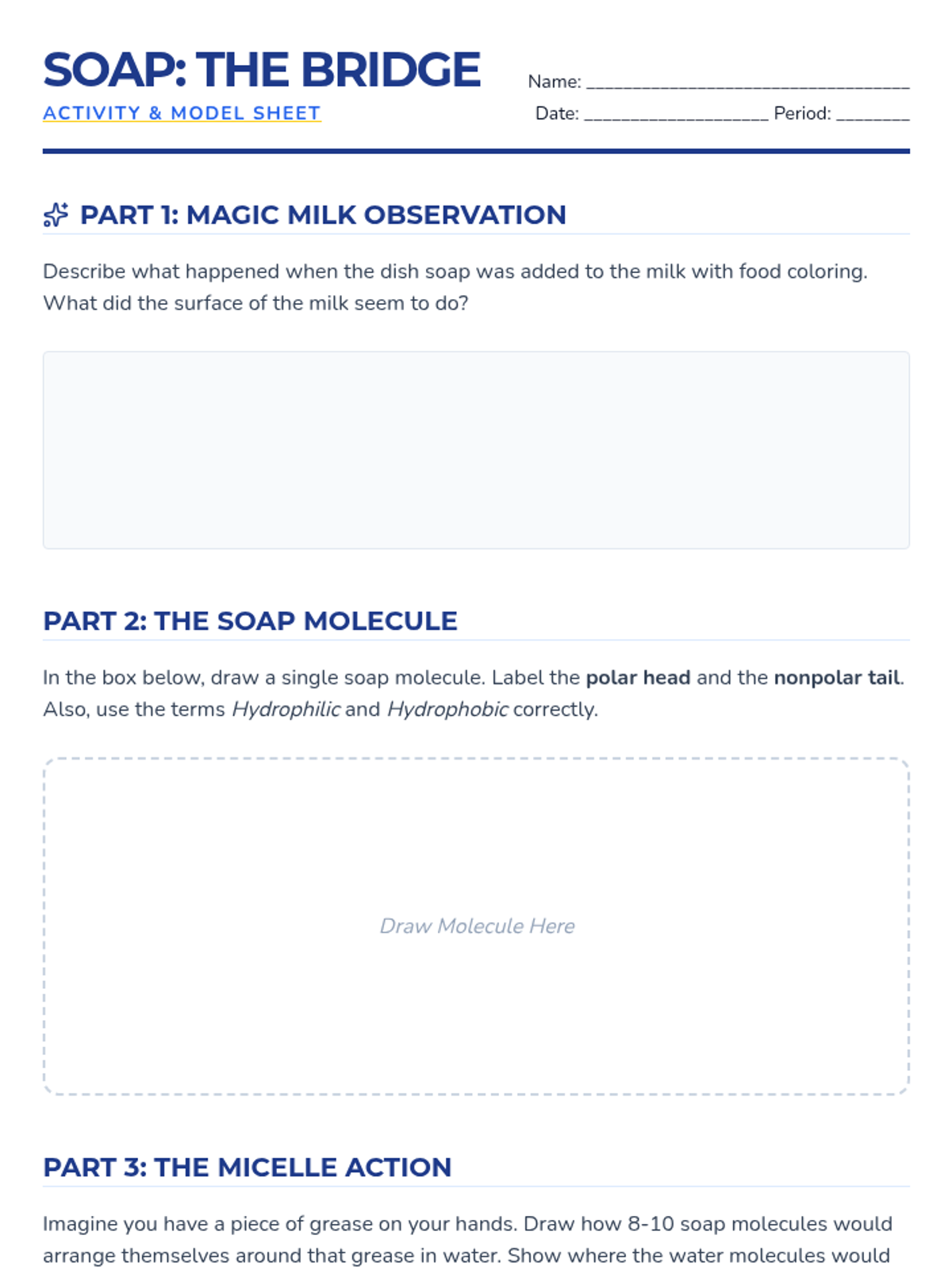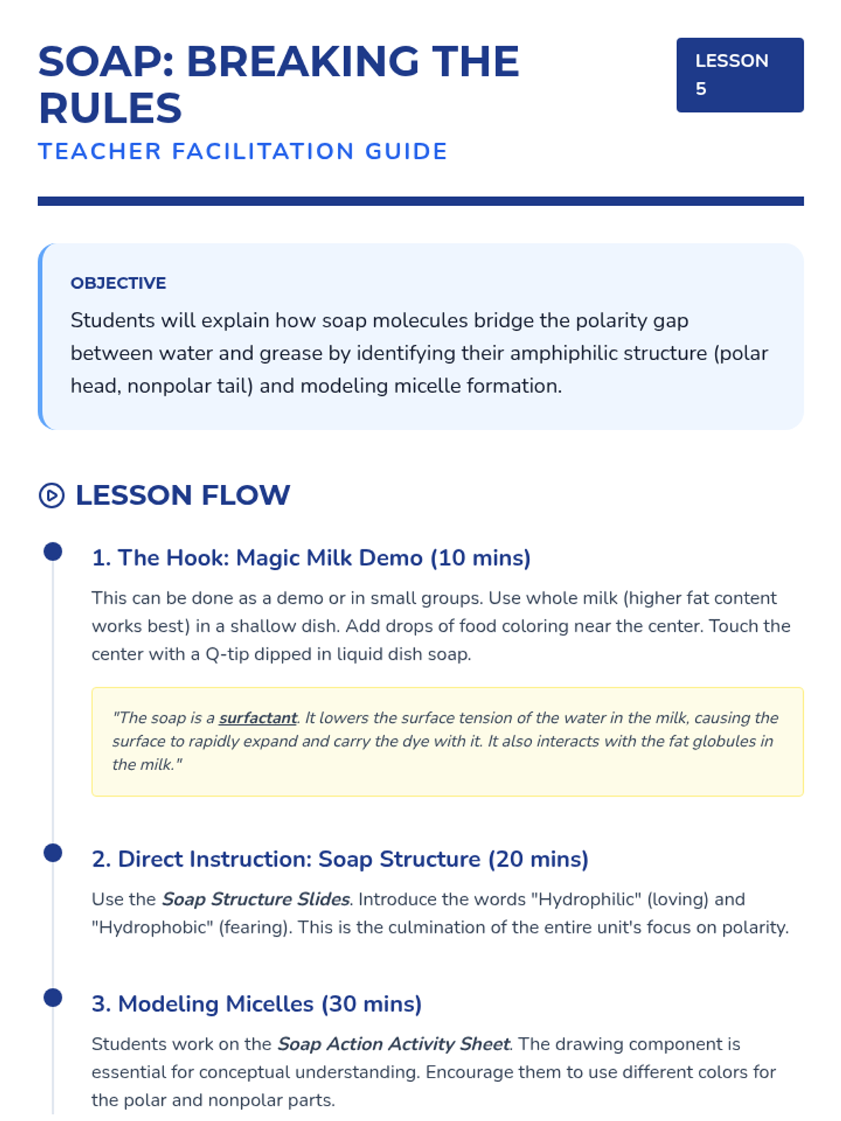 This lesson analyzes the structure of a soap molecule, which has both polar and nonpolar ends. Students discuss how this unique structure allows soap to bridge the gap between water and grease, culminating in a cleaning action lab.