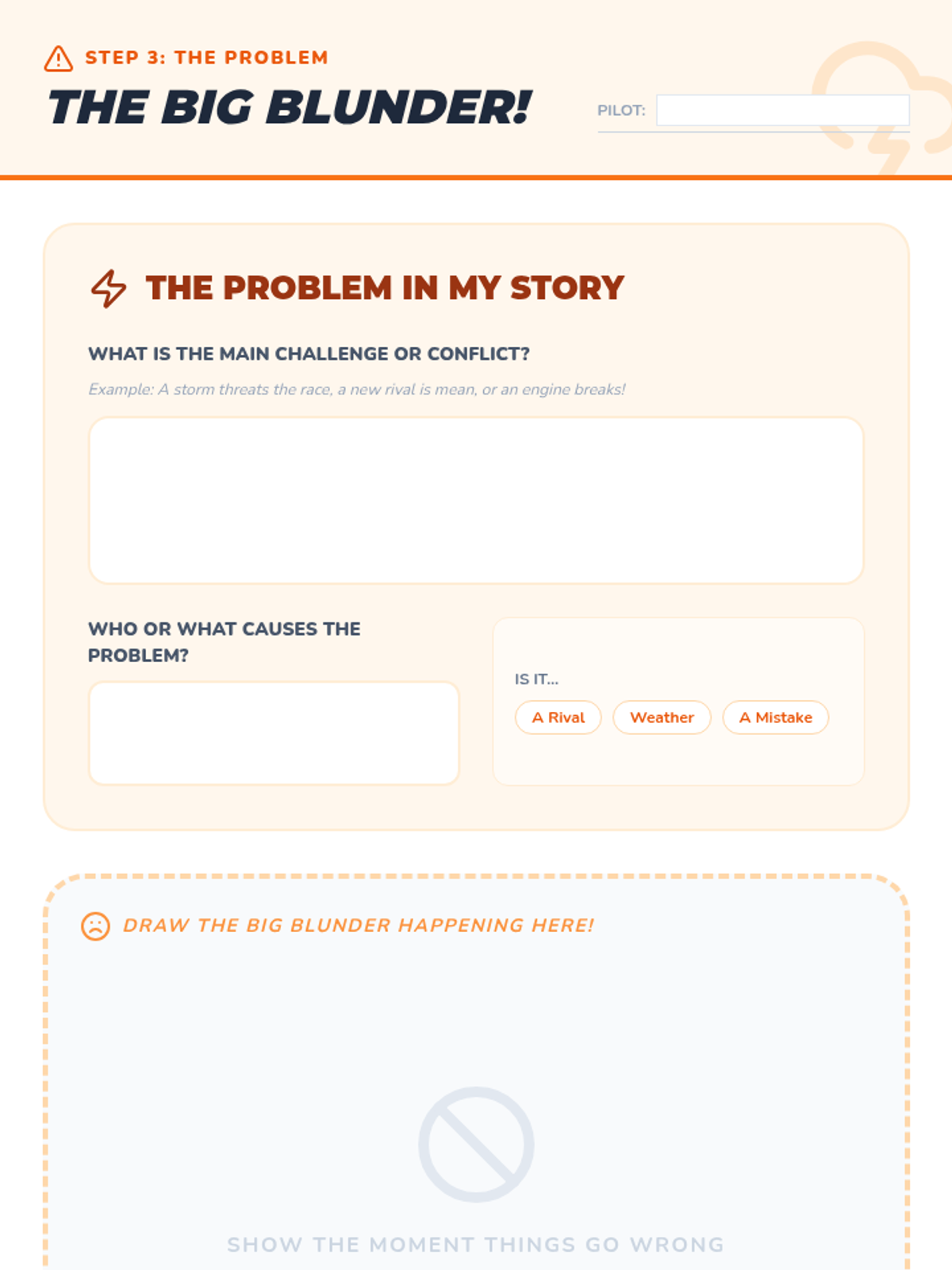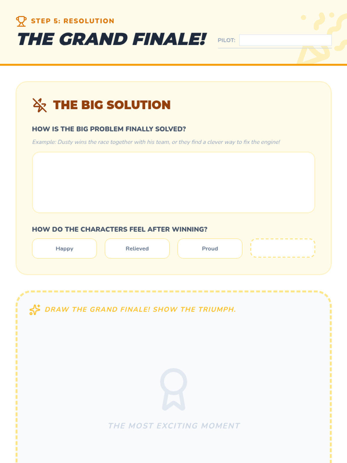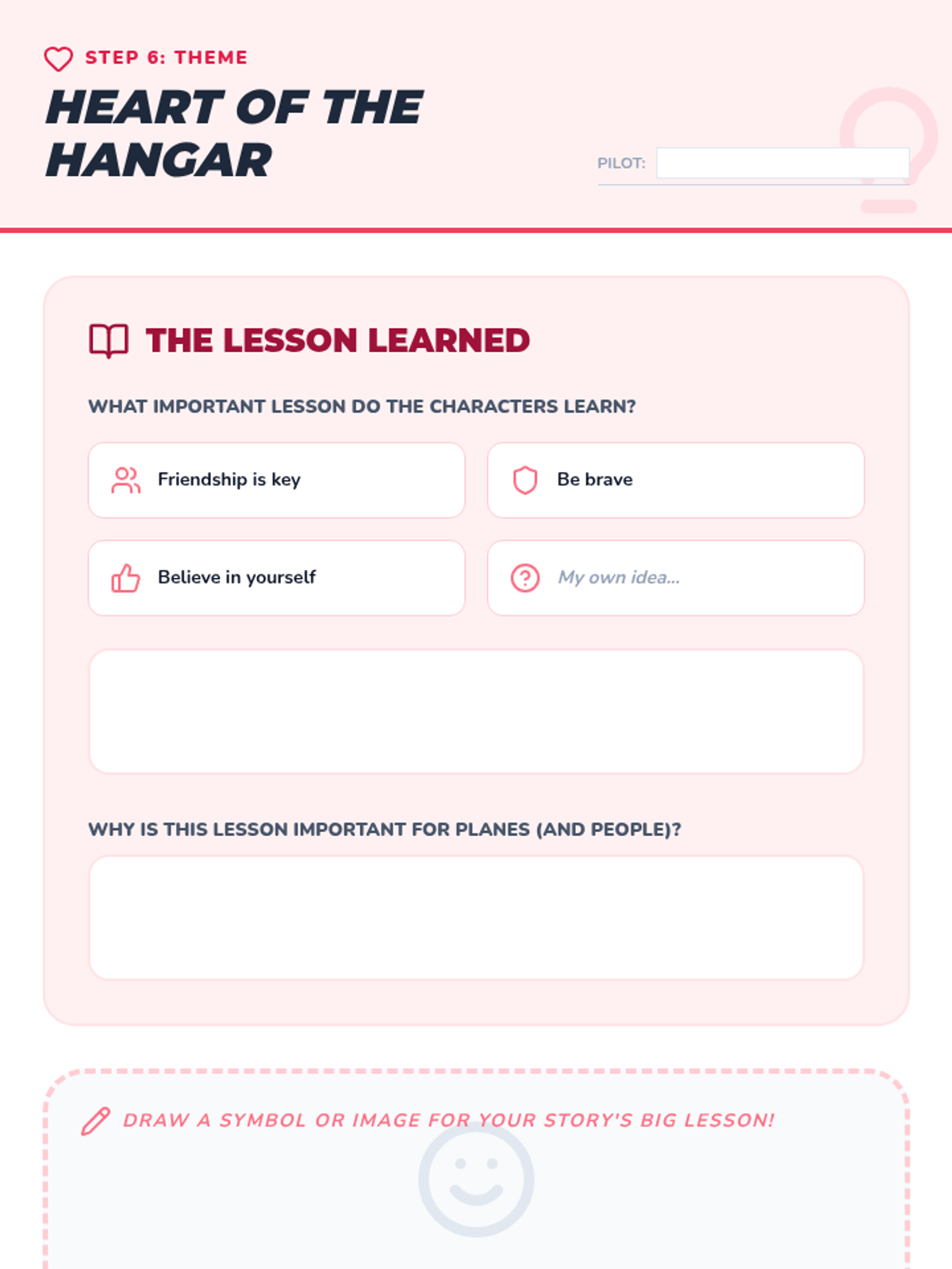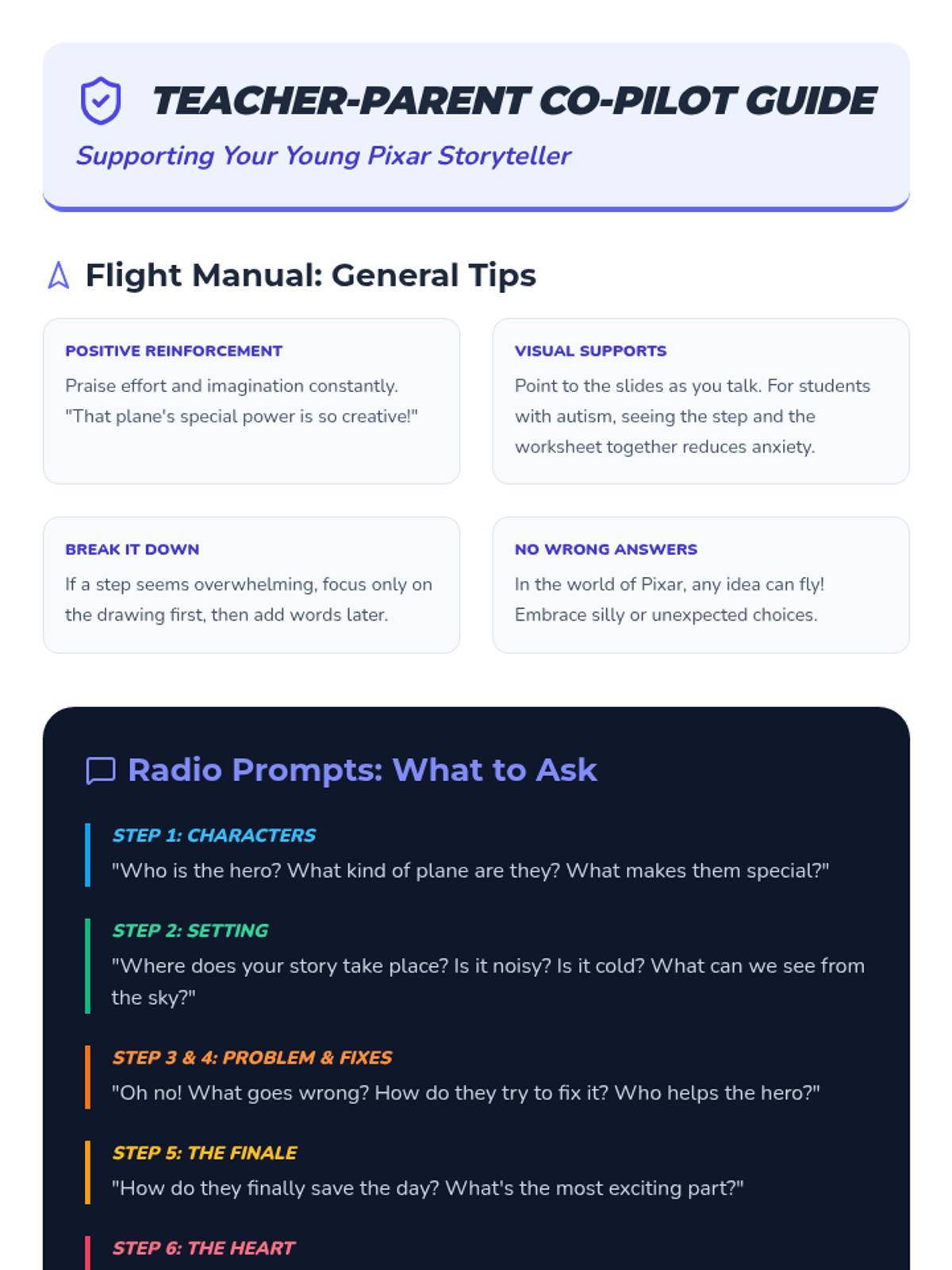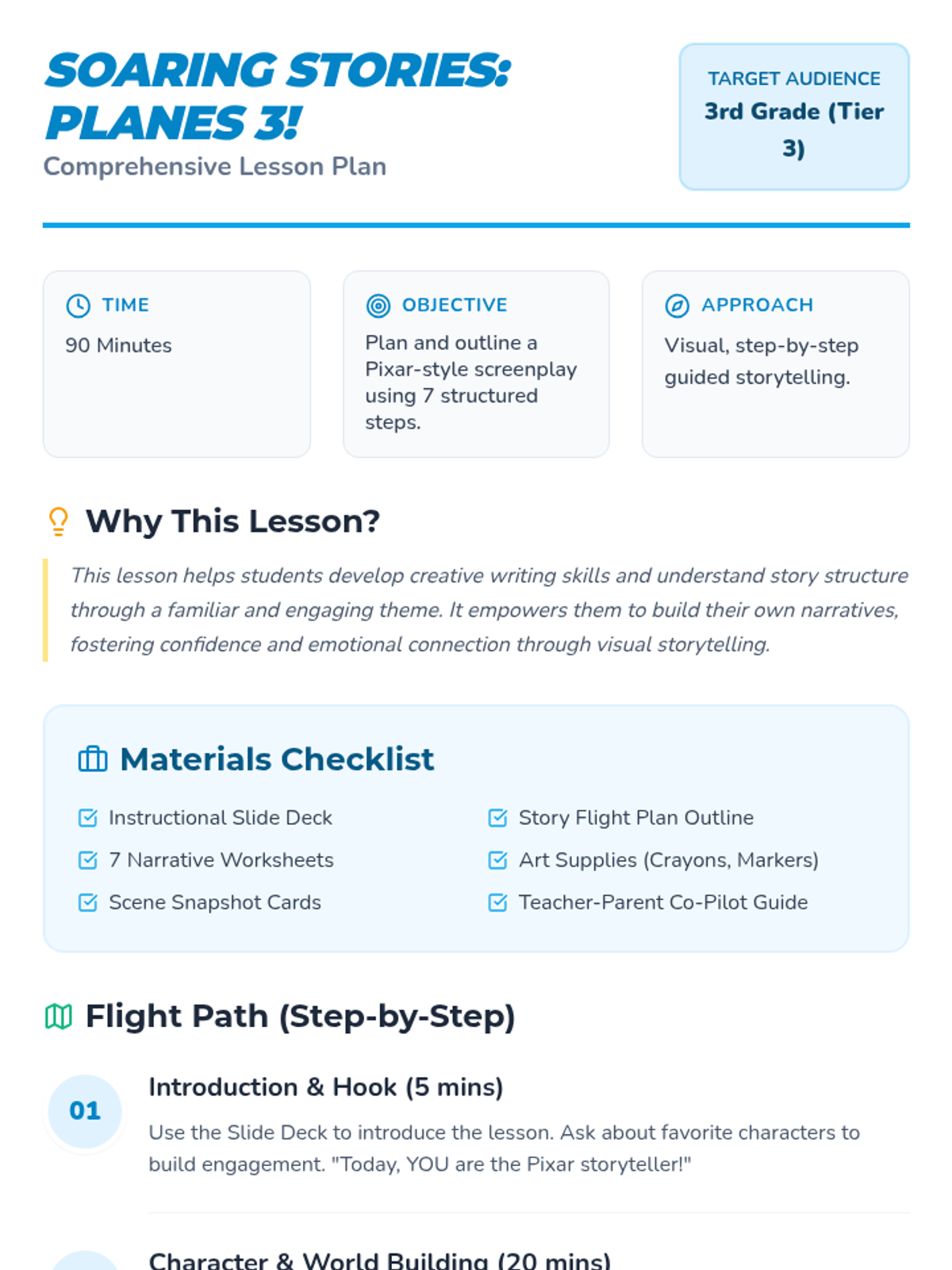 This lesson guides a 3rd-grade student with autism through the creative process of writing a Pixar-style screenplay, specifically 'Planes 3'. It breaks down storytelling into 7 visual steps, encouraging creativity, problem-solving, and emotional connection.