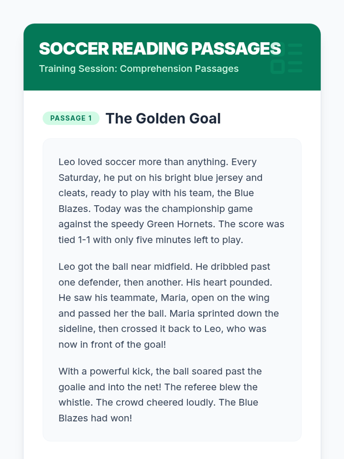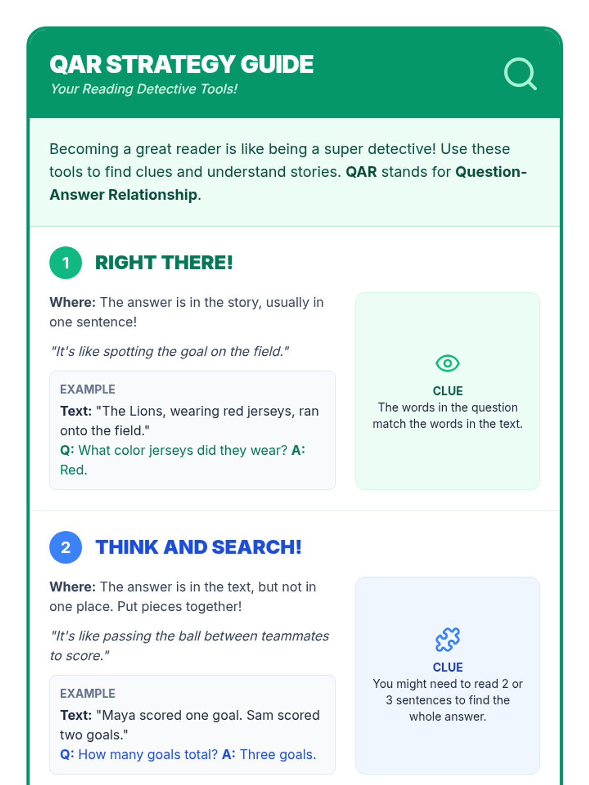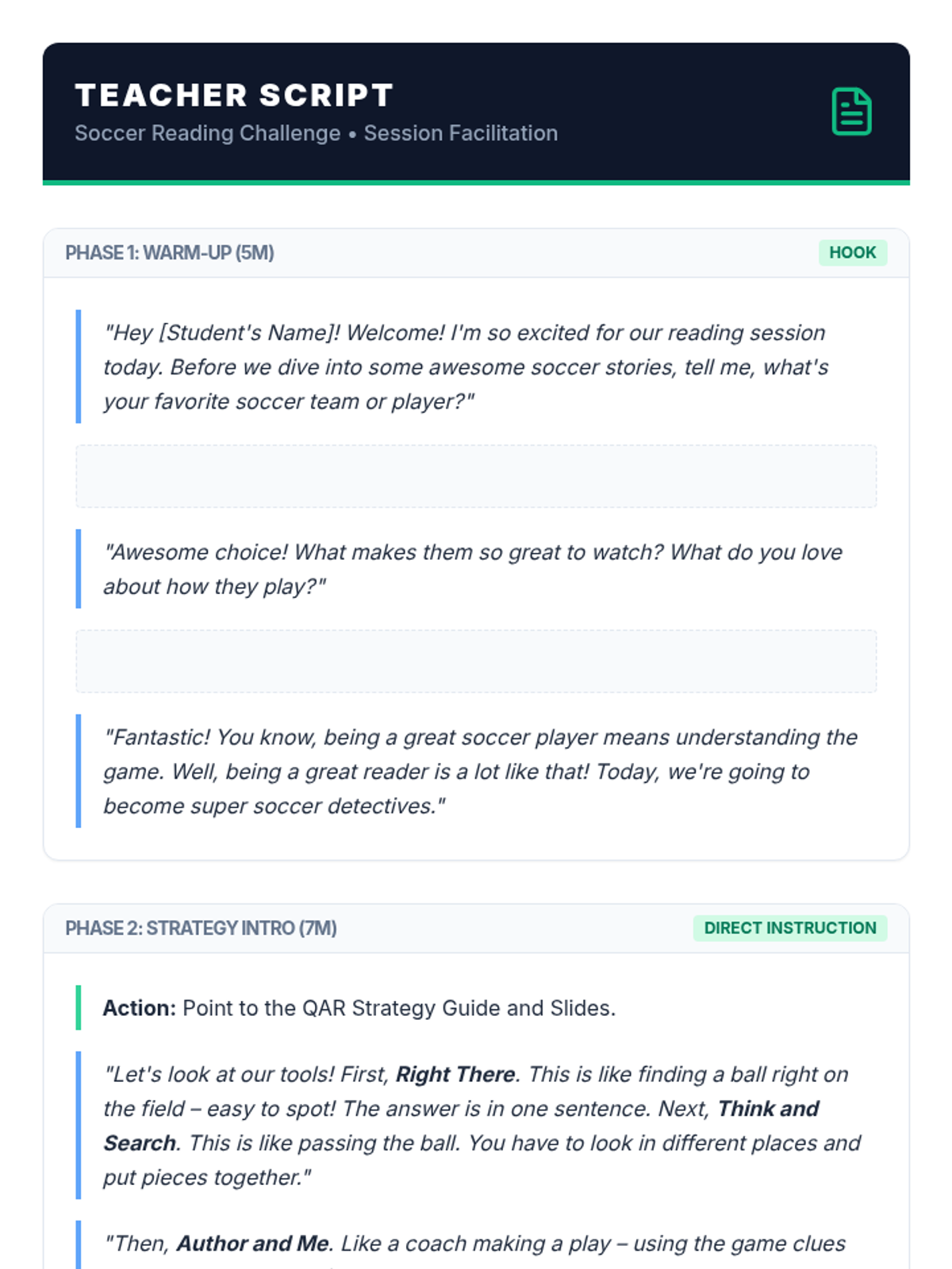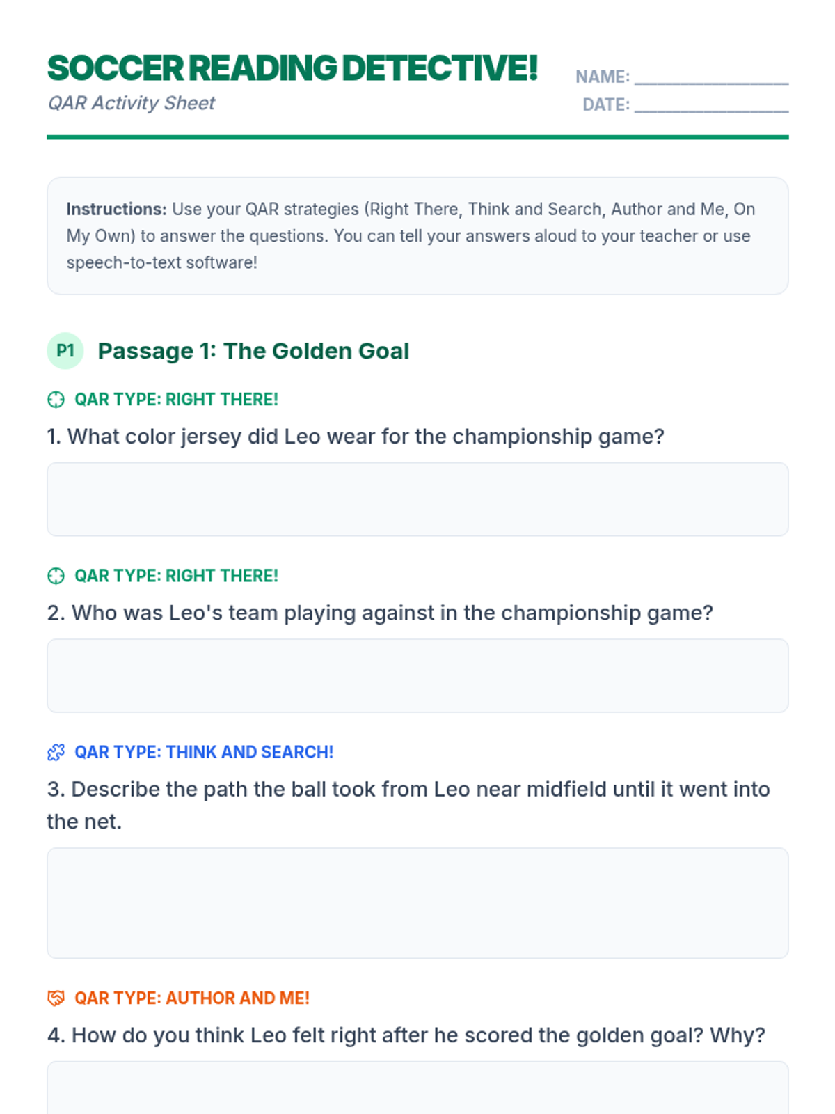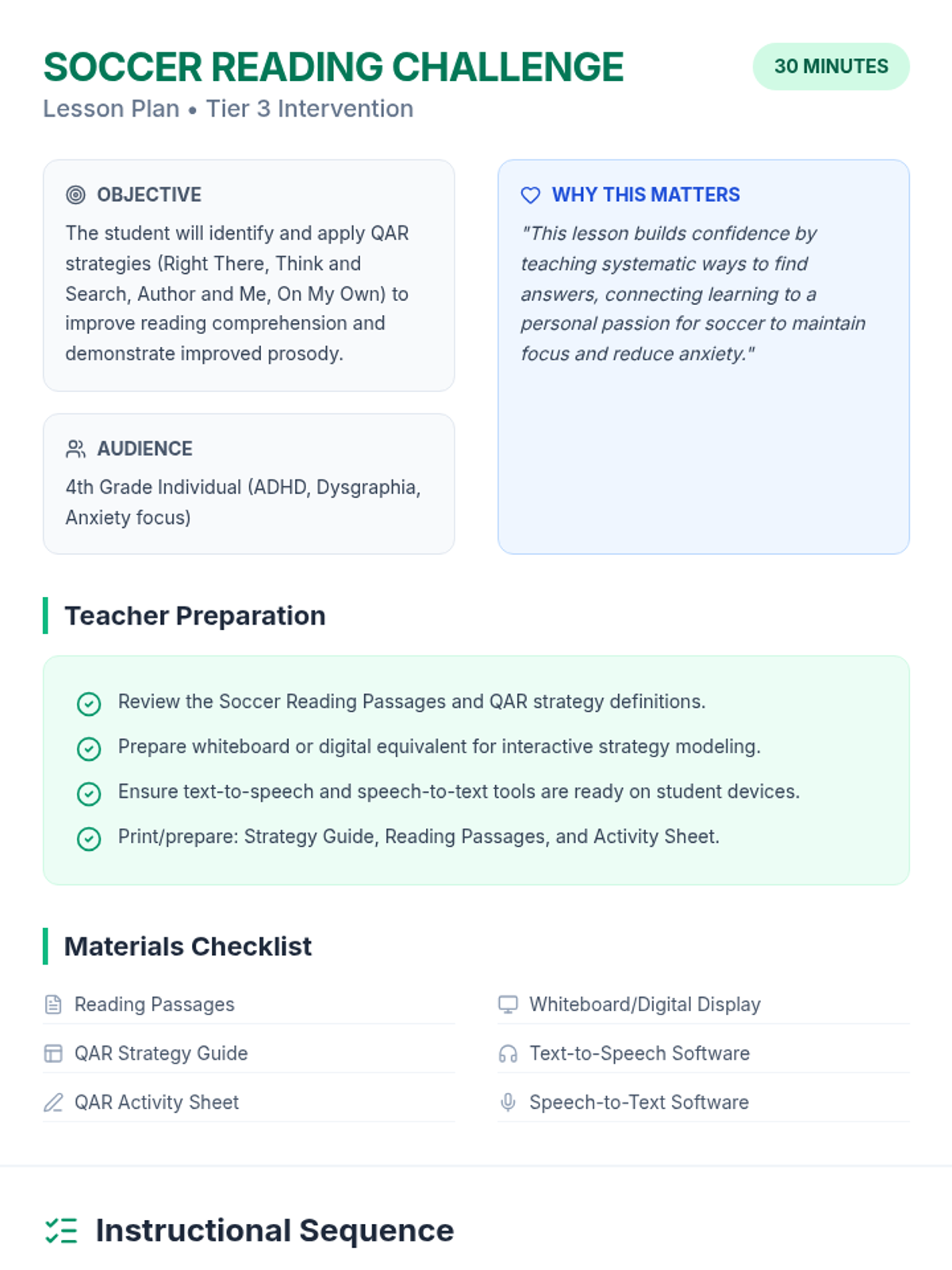 A 30-minute Tier 3 lesson for 4th grade focusing on reading comprehension using the Question-Answer Relationship (QAR) strategy with high-interest soccer content. Designed for students with ADHD, dysgraphia, and anxiety.