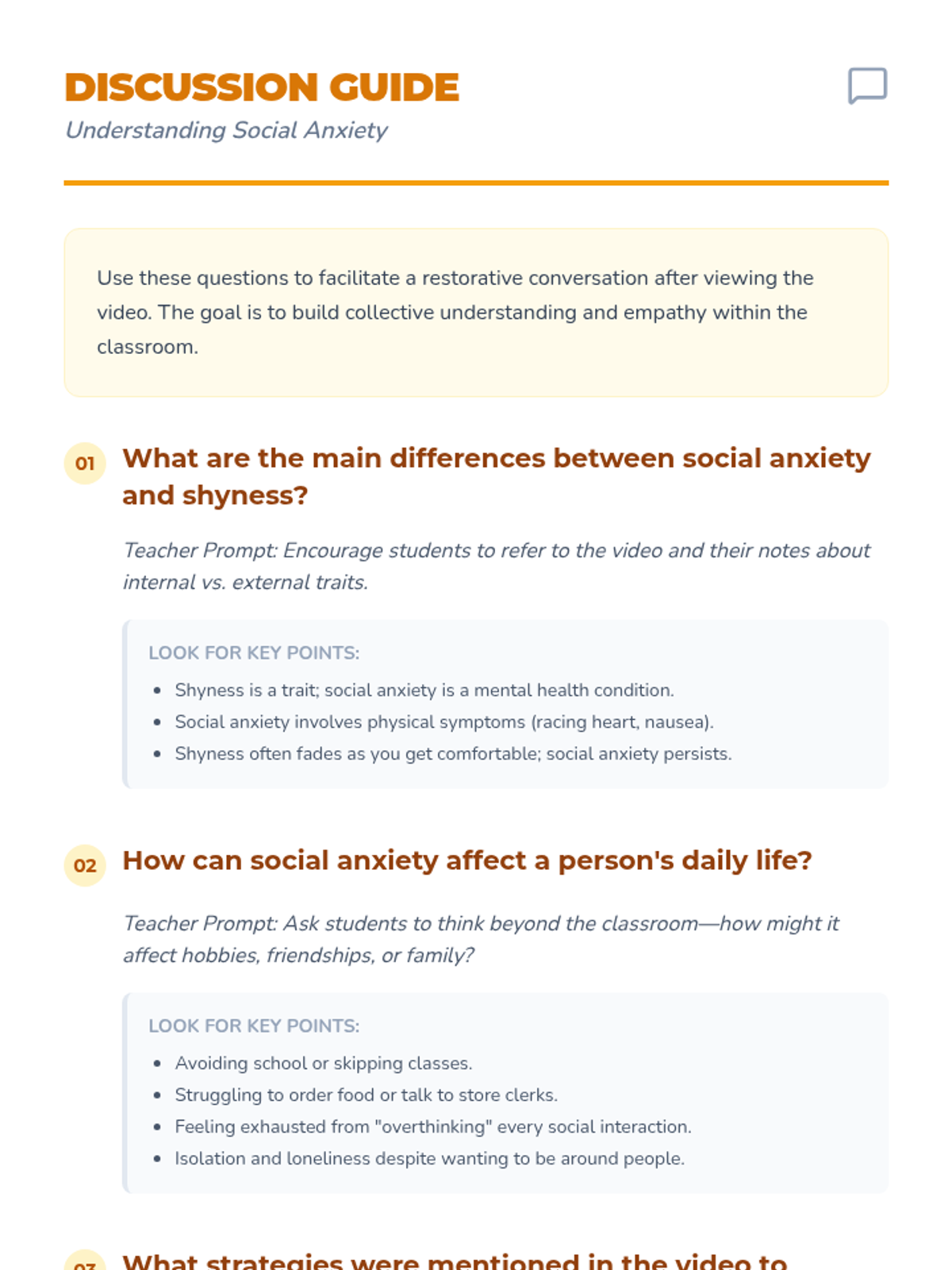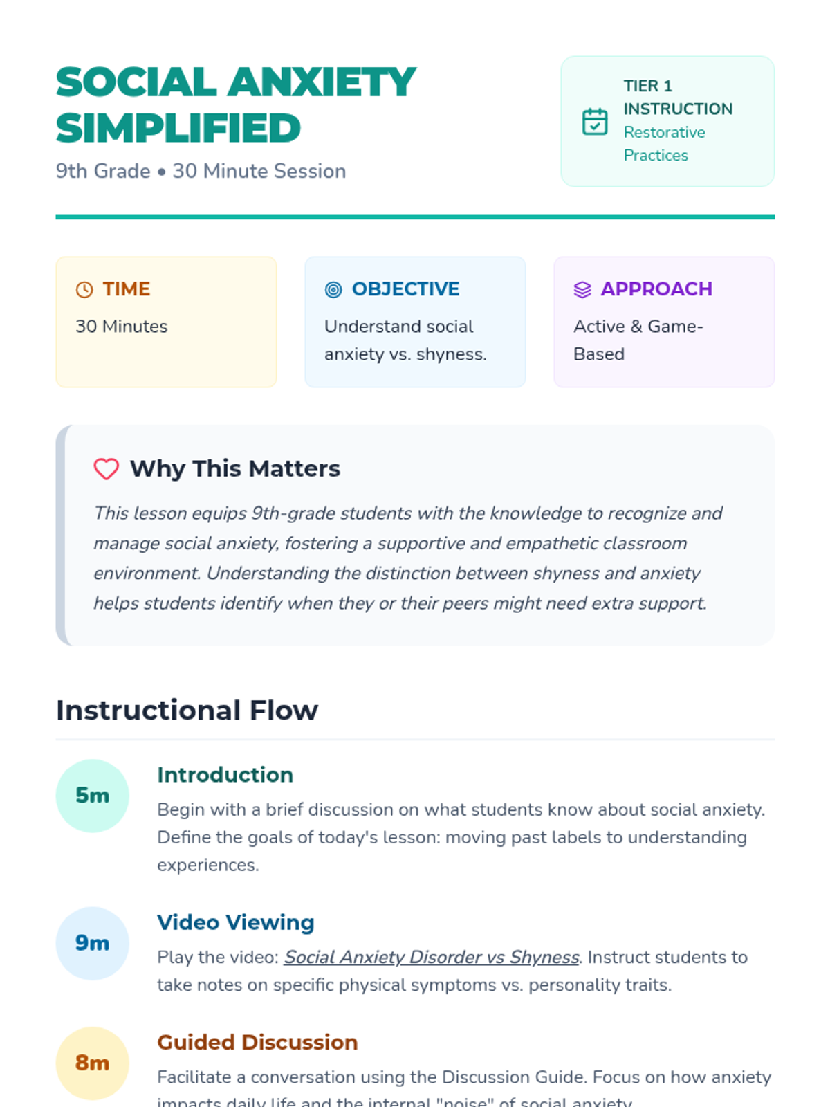 A restorative 9th-grade lesson that clarifies the difference between shyness and social anxiety, featuring video analysis and a practical 'fear ladder' activity to build coping strategies.