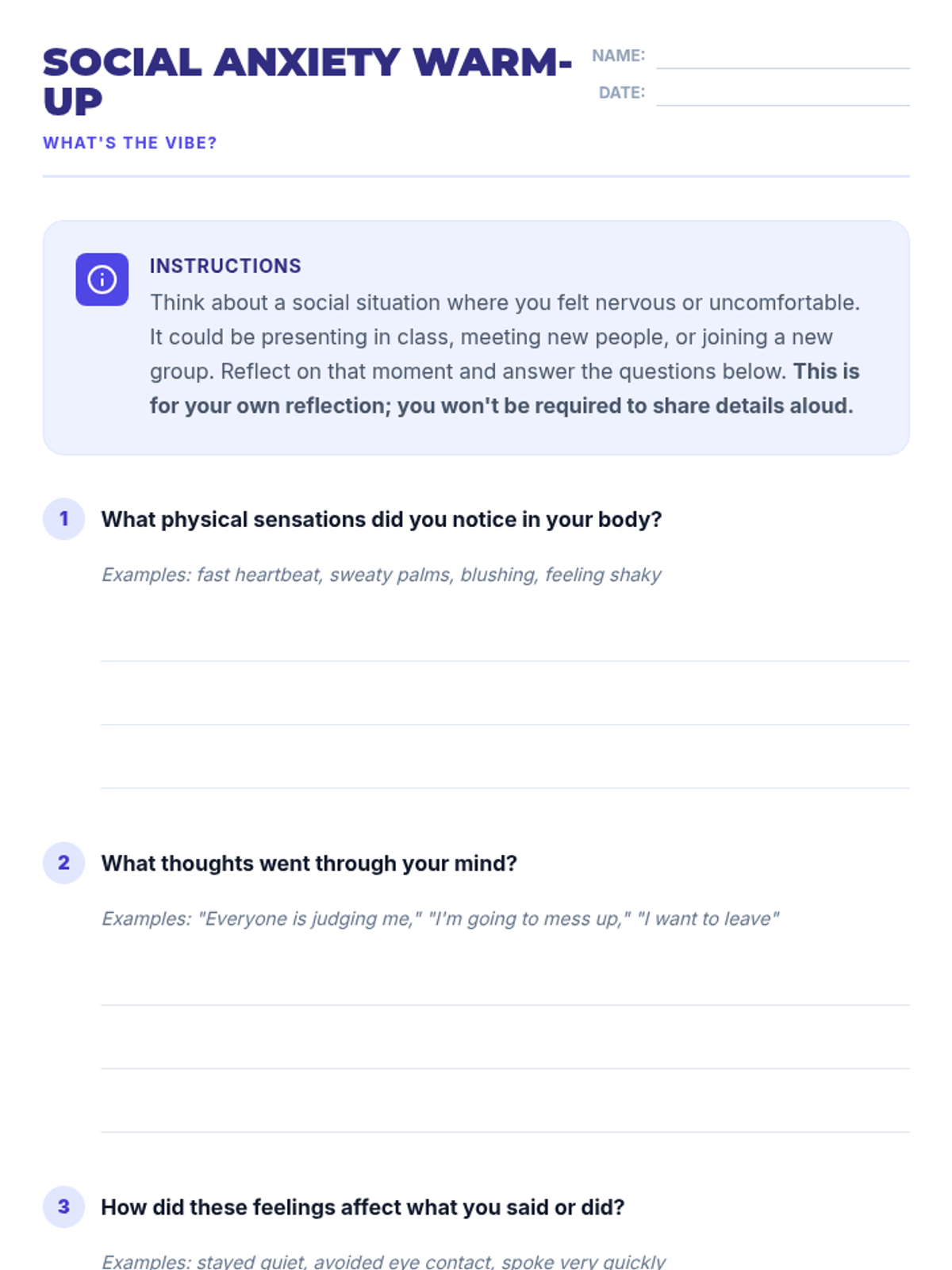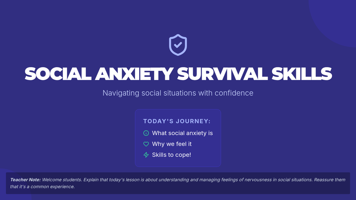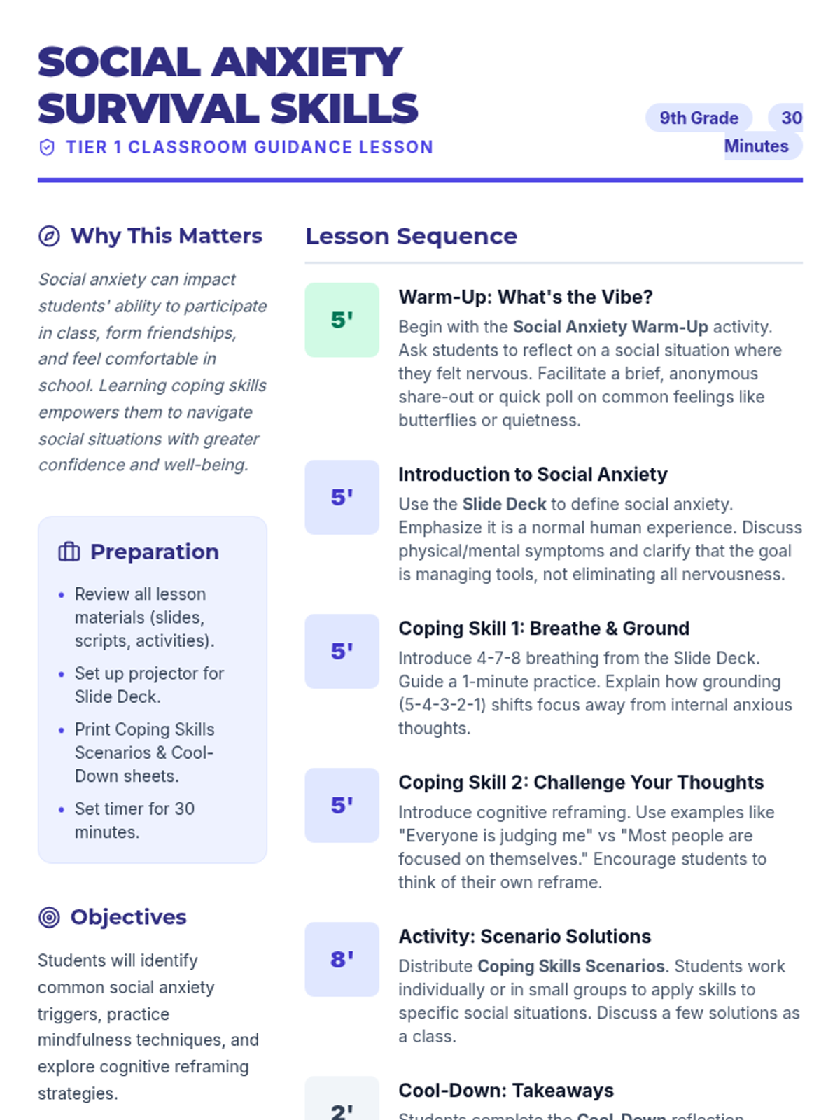 A Tier 1 lesson for 9th-grade students to identify social anxiety triggers and learn practical mindfulness and cognitive reframing coping strategies.