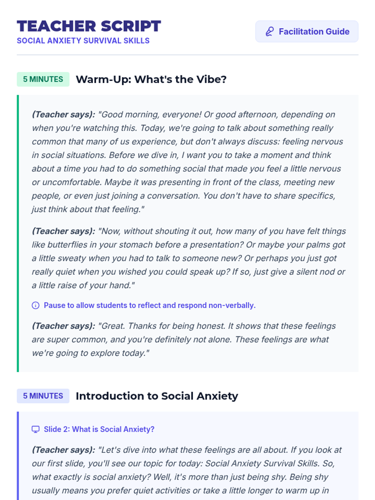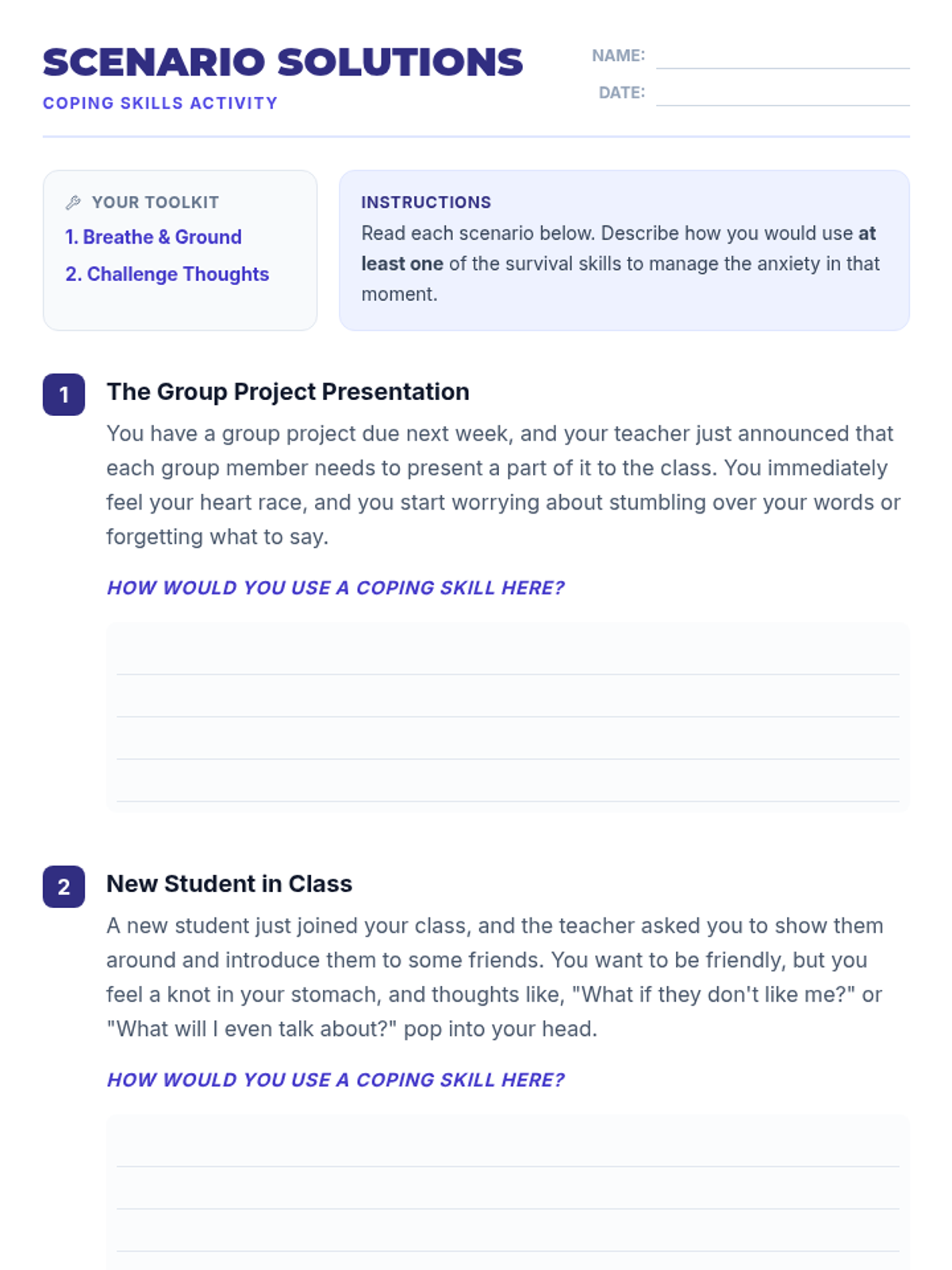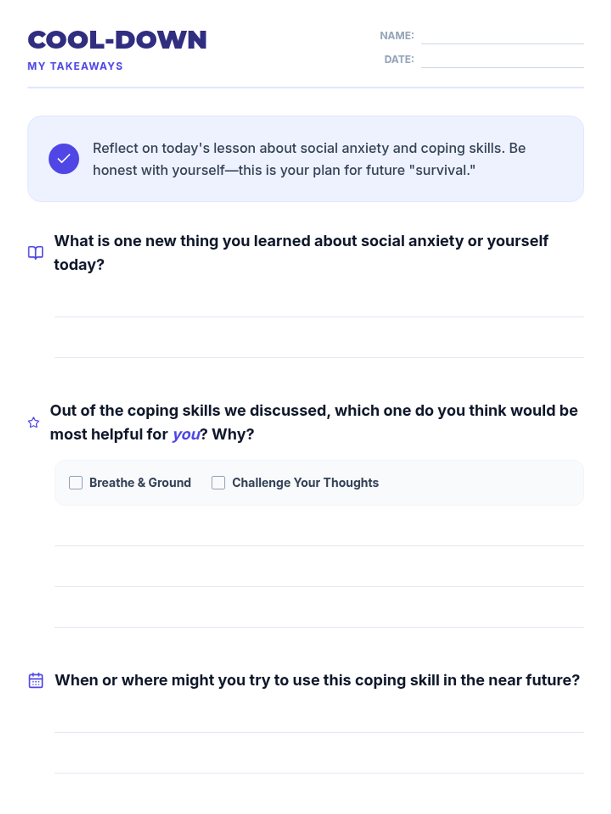 A Tier 1 lesson for 9th-grade students to identify social anxiety triggers and learn practical mindfulness and cognitive reframing coping strategies.