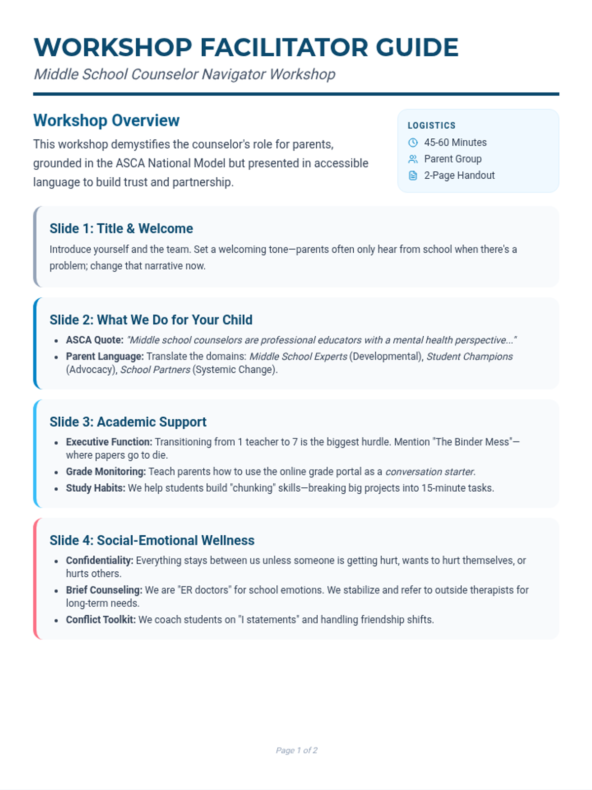 A comprehensive parent workshop designed to introduce families to the multi-faceted role of middle school counselors, covering academic, social-emotional, and career support.