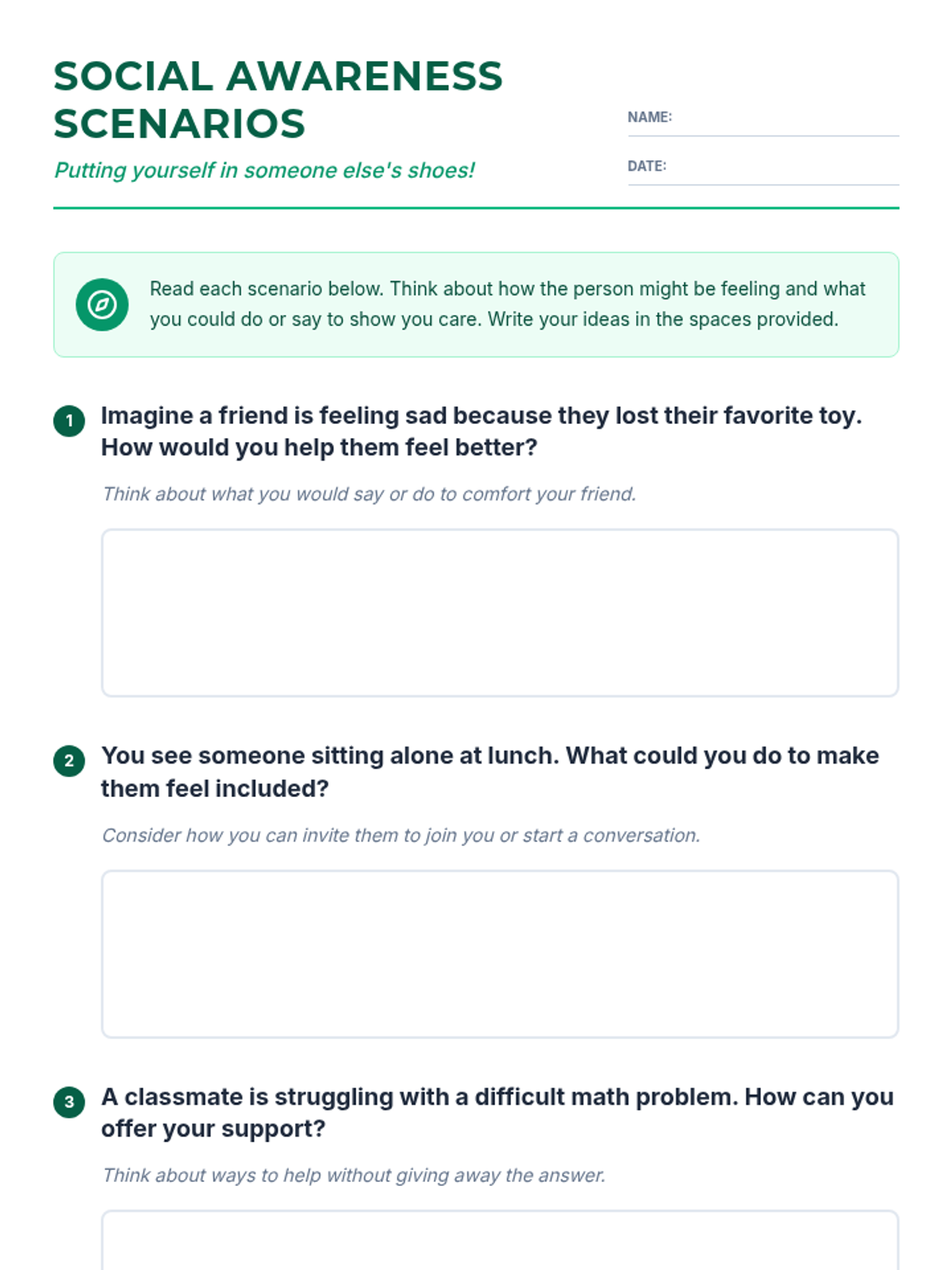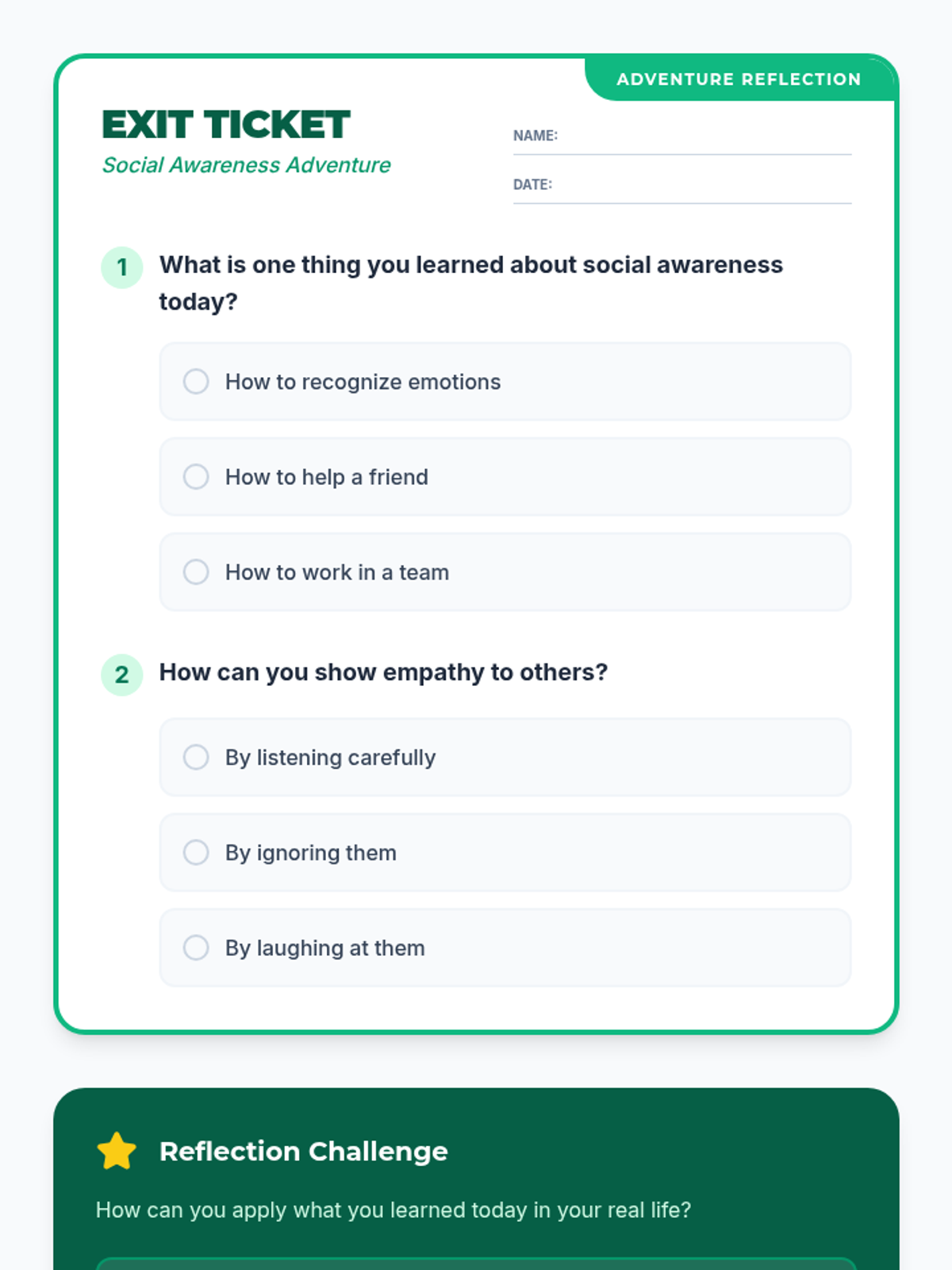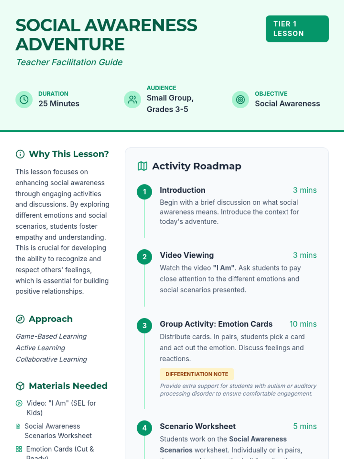 A 25-minute lesson for grades 3-5 designed to build empathy and social awareness through video, role-play with emotion cards, and scenario-based reflections. Students learn to recognize and respect the feelings of others to foster positive relationships.