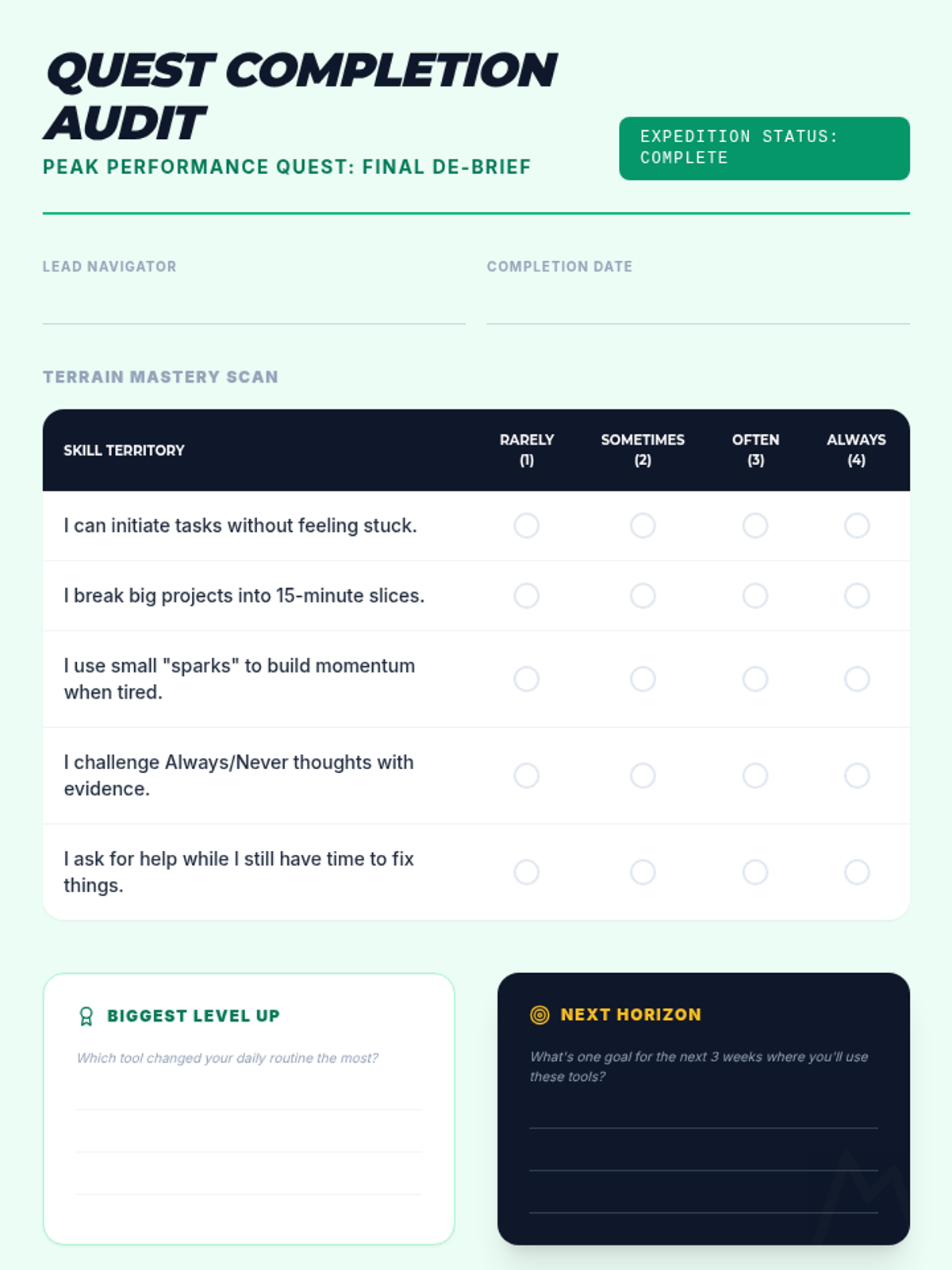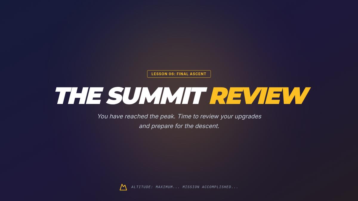 The final ascent. Students complete the post-assessment, review their earned badges, and create a 'Summit Survival Kit' for maintaining their new executive skills.