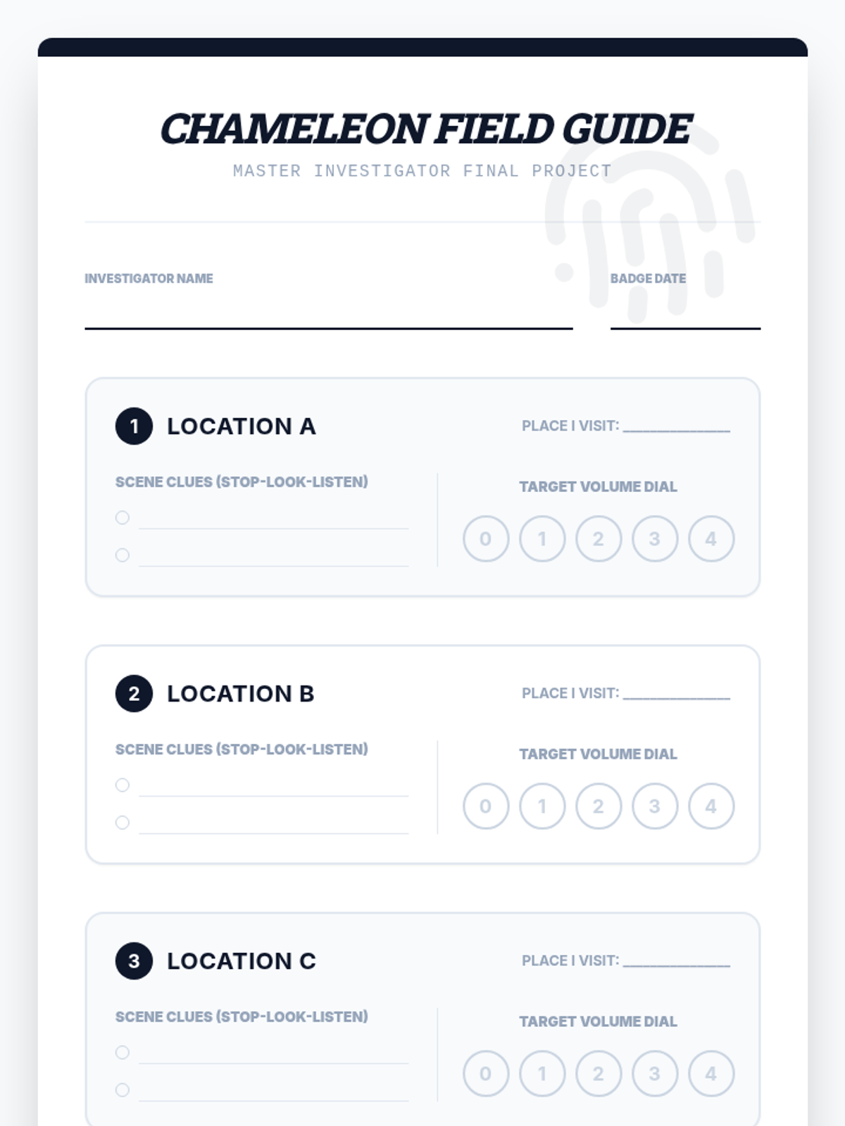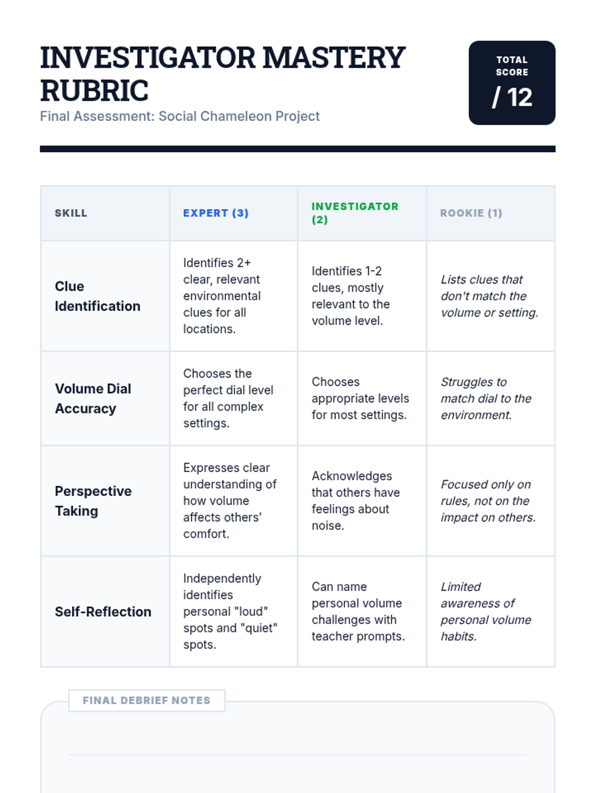 Students synthesize their learning by creating a personal 'Social Chameleon Field Guide' that outlines volume expectations for various places in their community and lives.